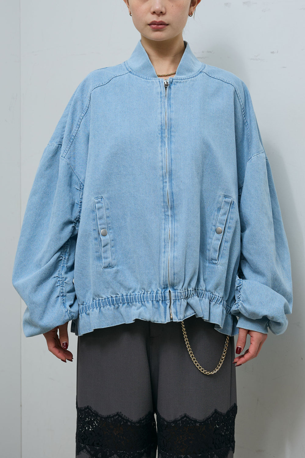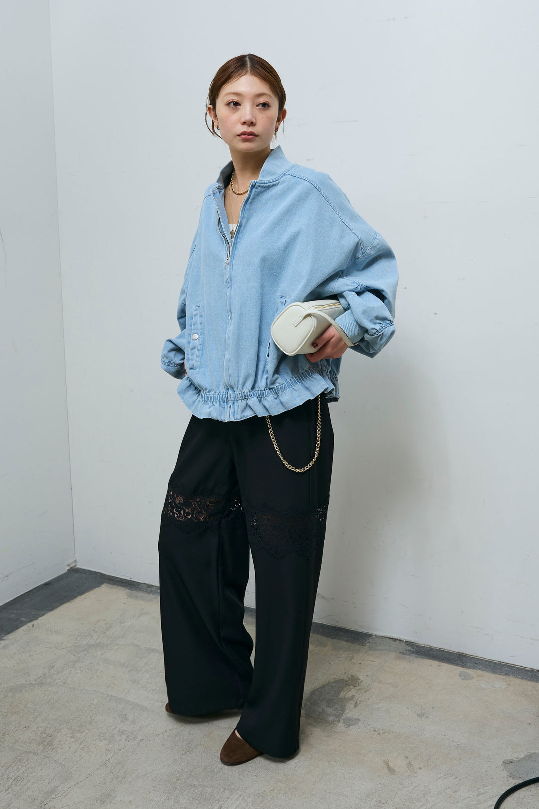 [予約/SET]シャーリングスリーブデニムブルゾン+レースパネルパンツ(2set)