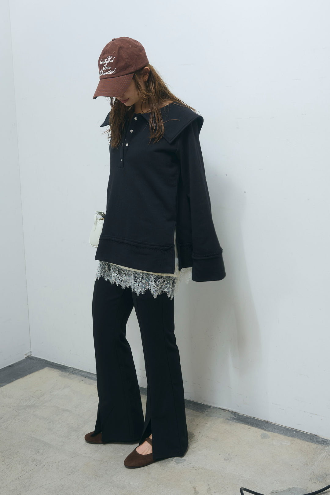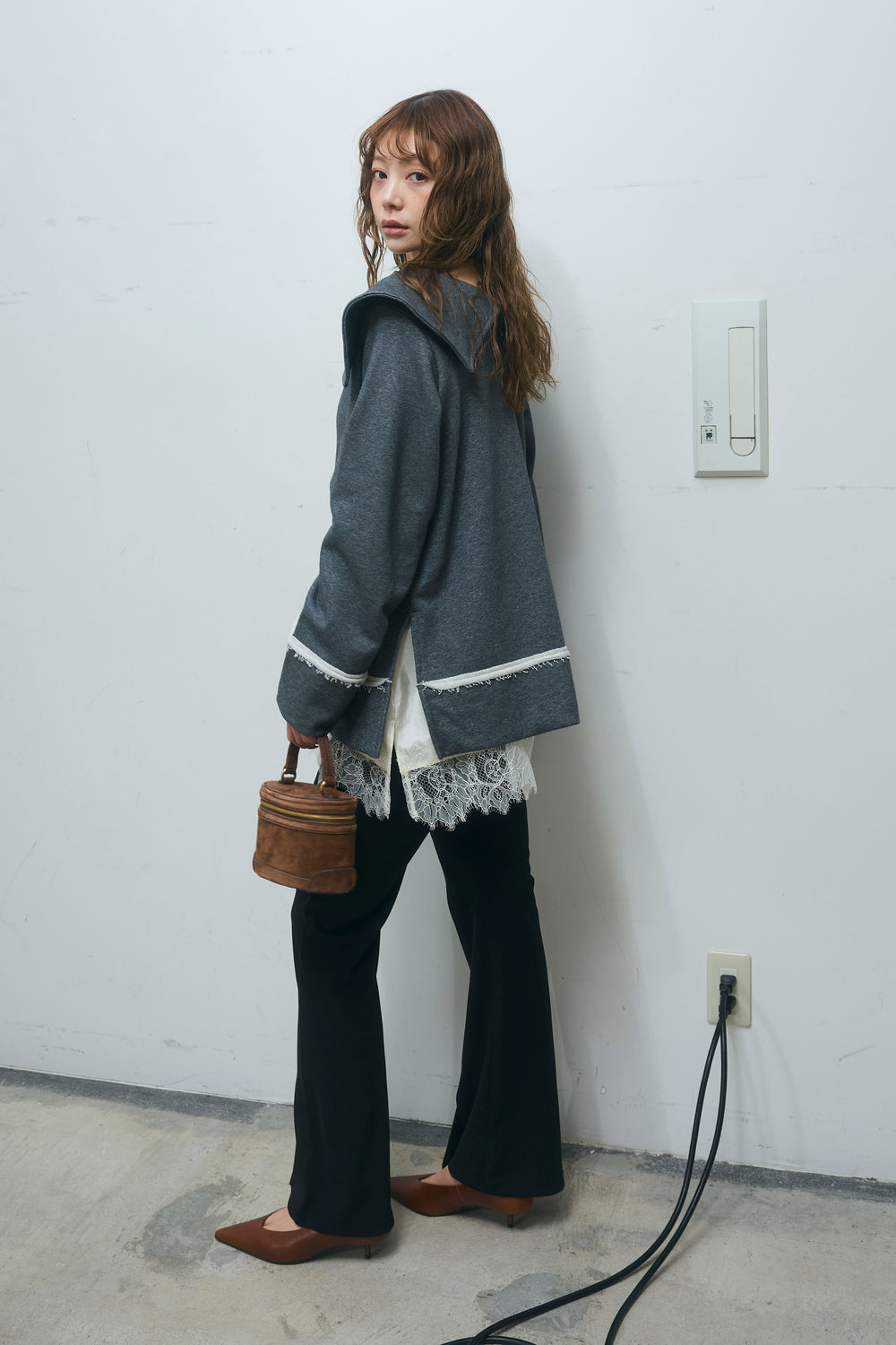 [予約/SET]ビッグカラースウェットトップス+サテンレースキャミソール+スーパーストレッチ美脚フレアパンツ(3set)