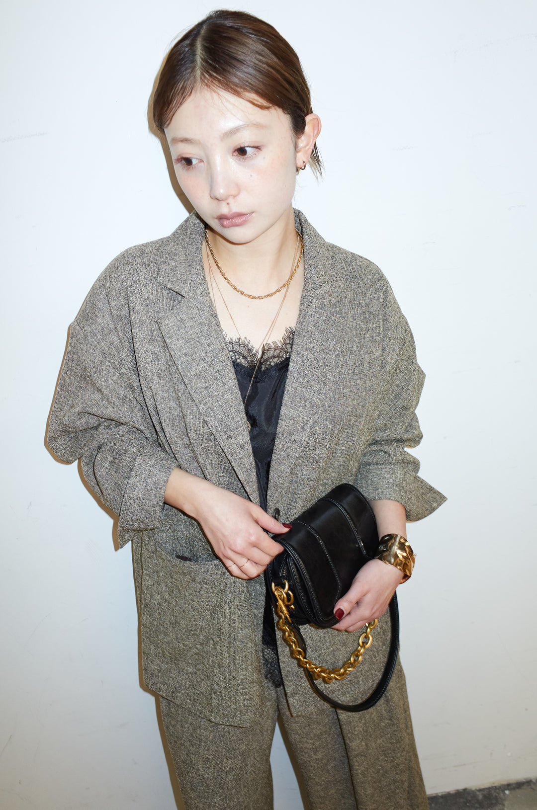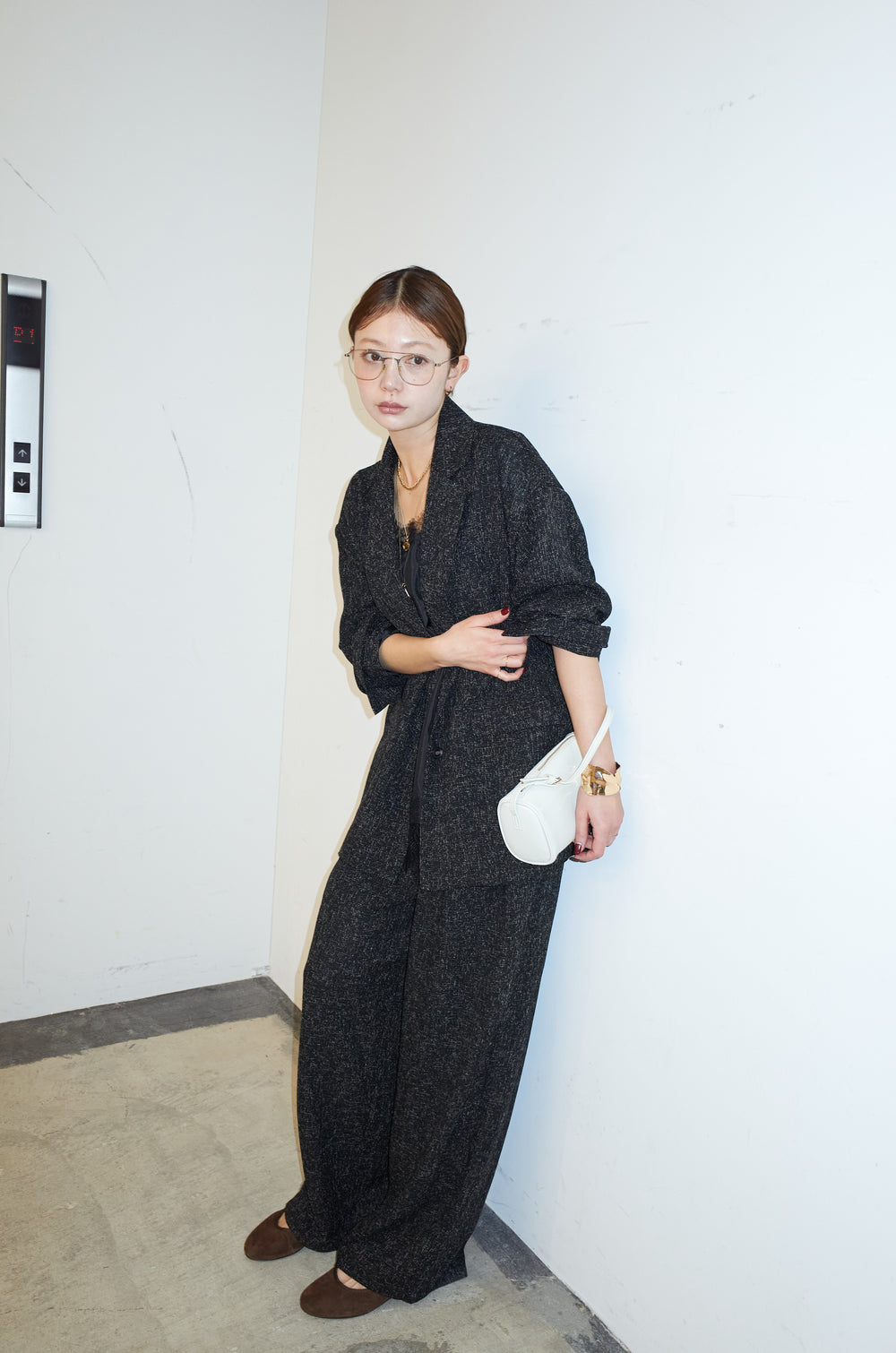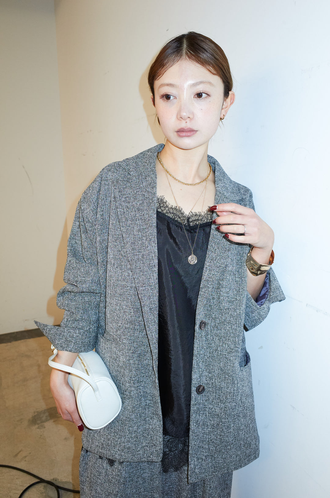 [予約/SET]サマーツイードダッドジャケット+サテンレースキャミソール+サマーツイードタックパンツ(3set)
