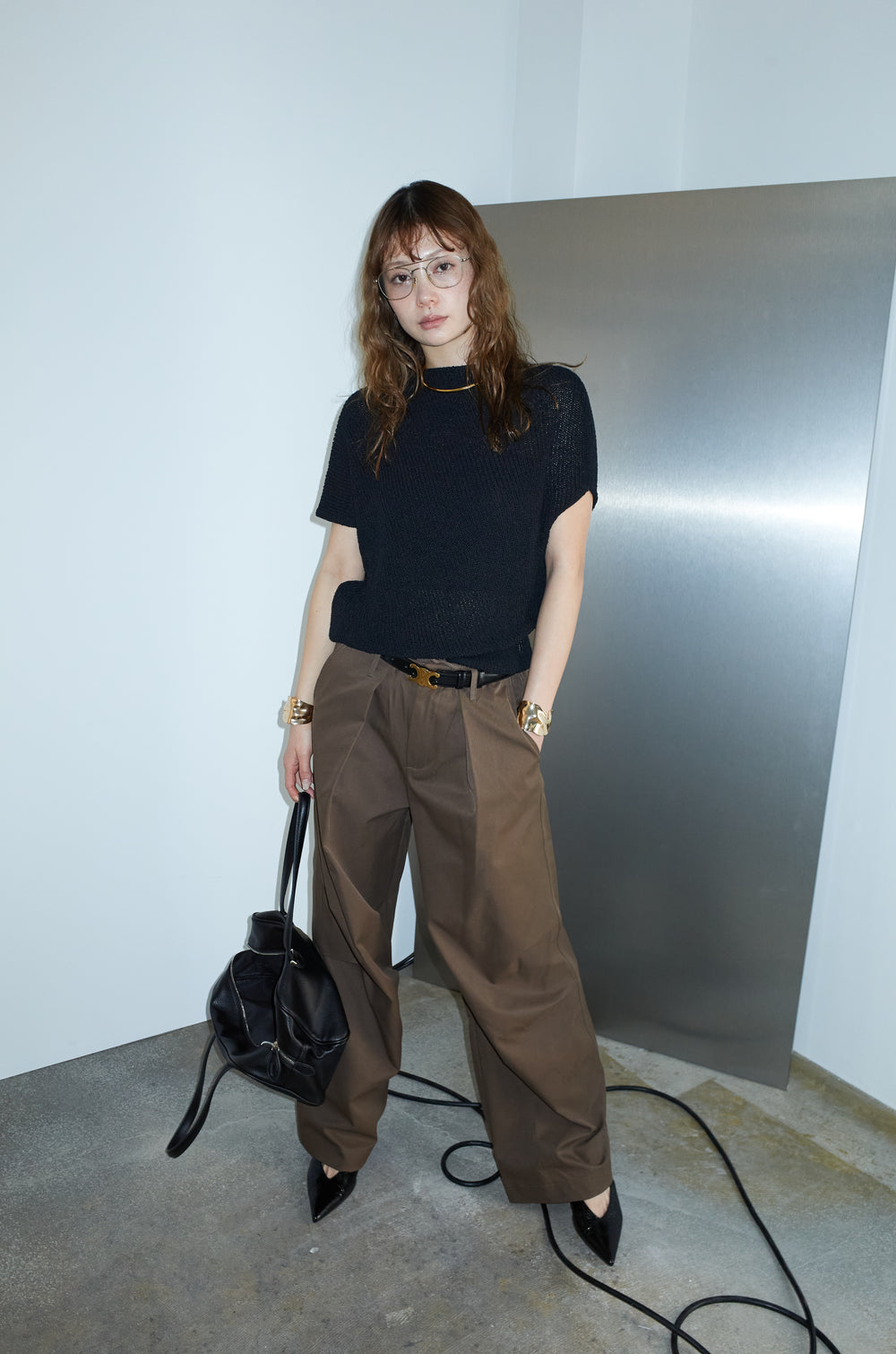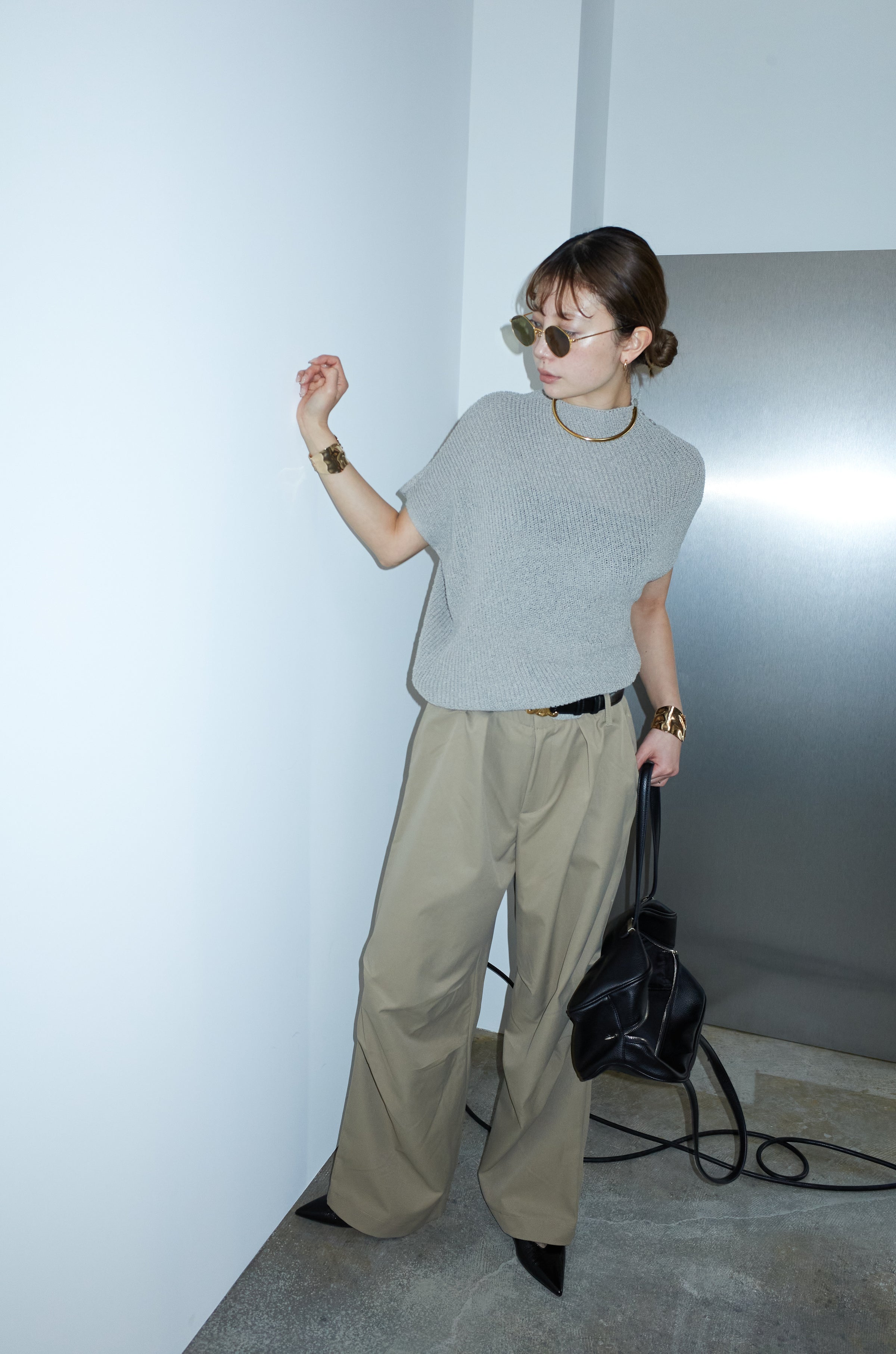 [予約/SET]ビッグカラーニットトップス+ハイウエストタックワイドパンツ(2set)