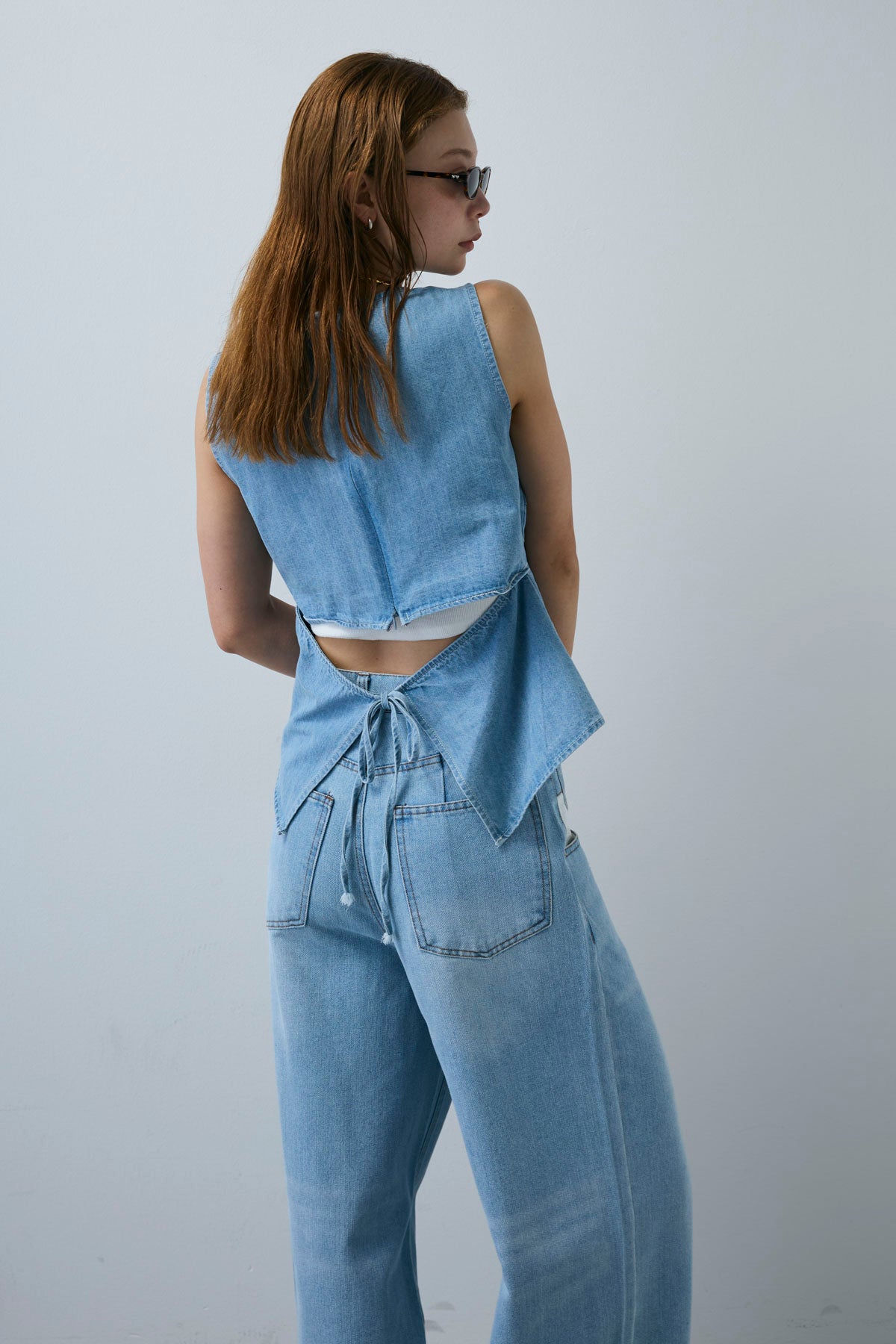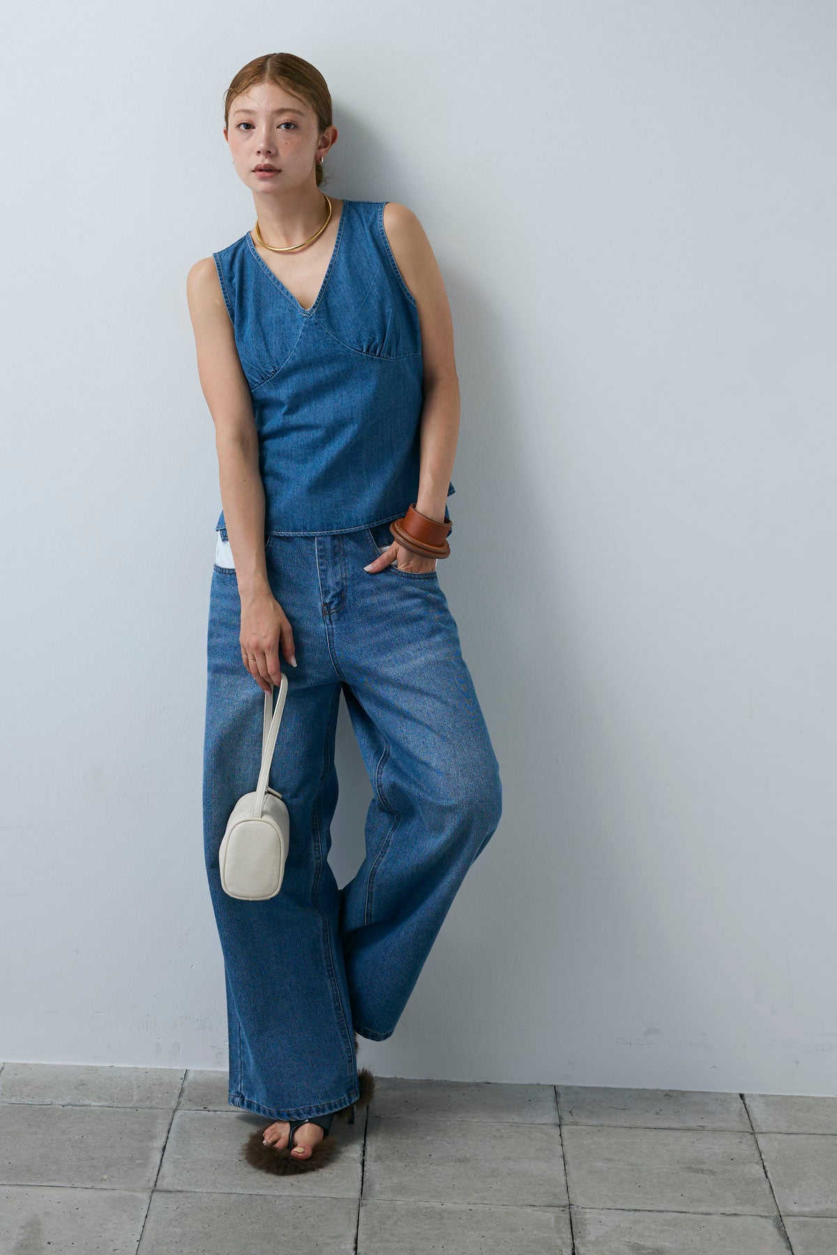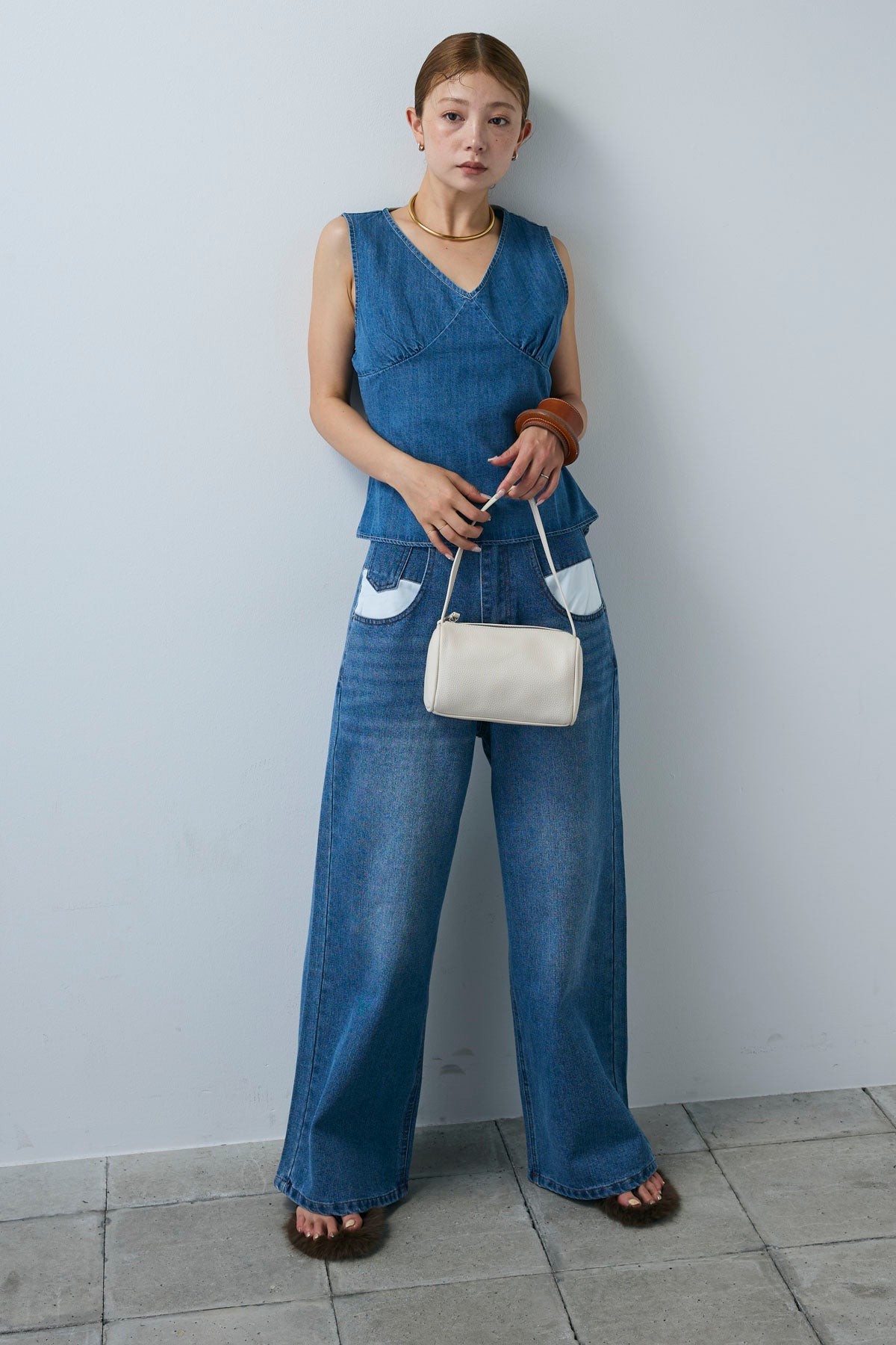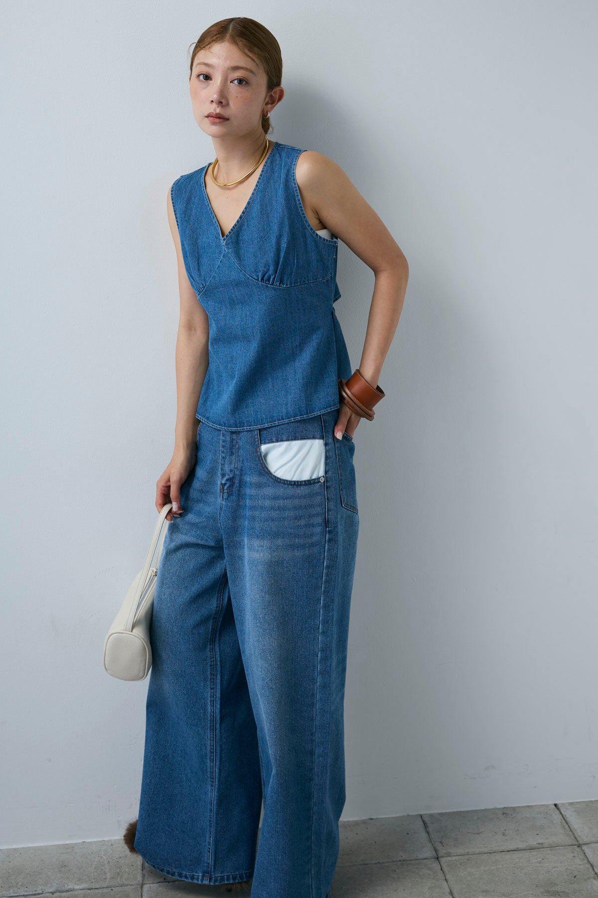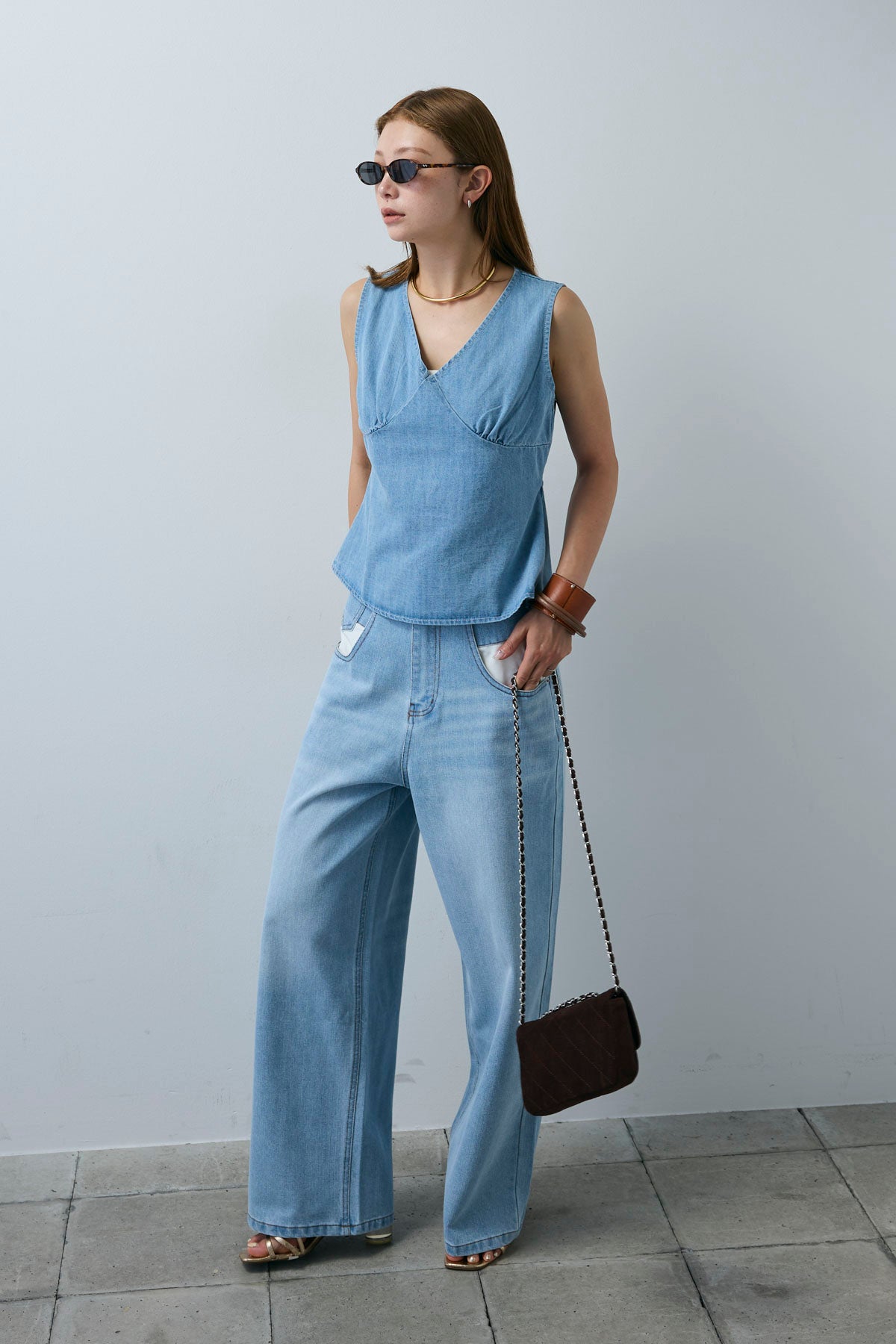 [予約/SET]Vネックバックリボンデニムトップス+デニムルーズポケットパンツ(2set)