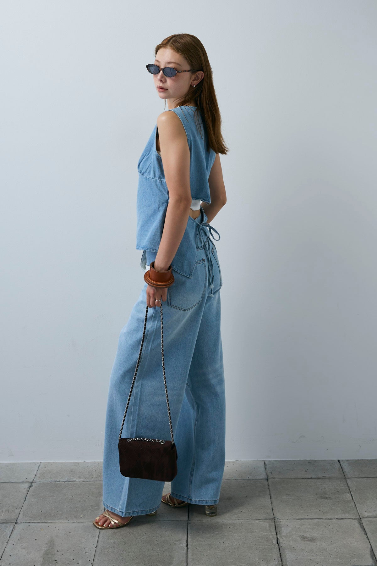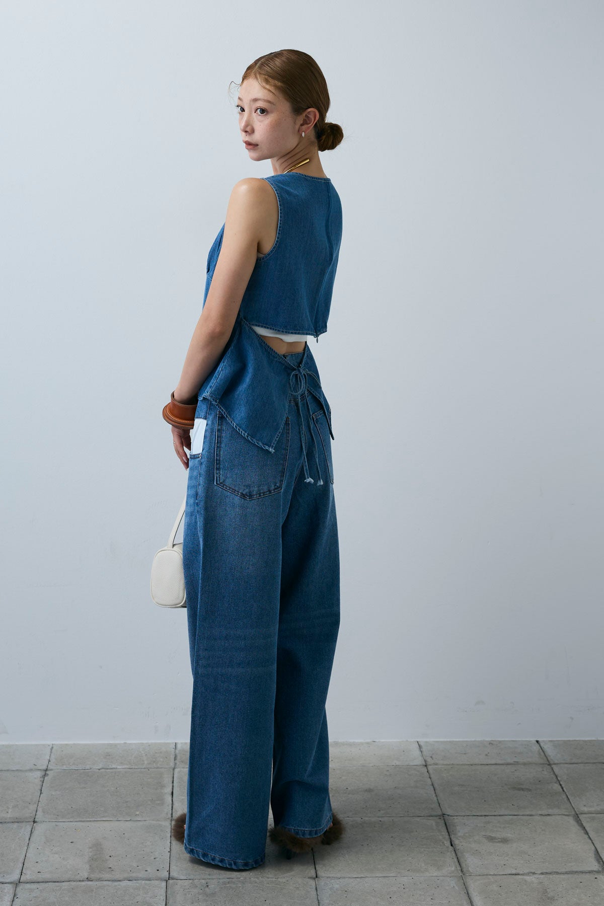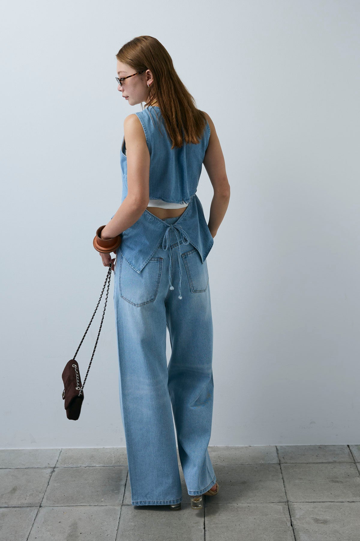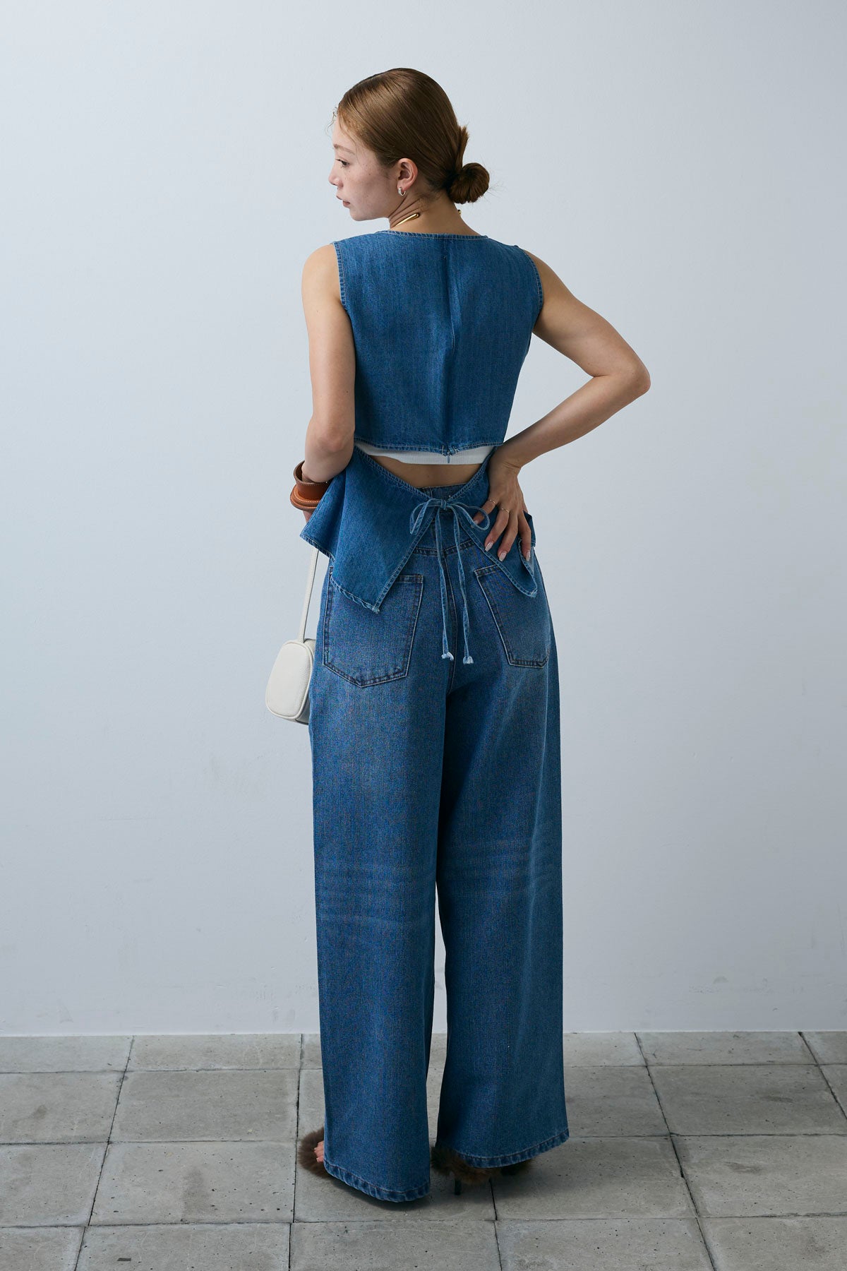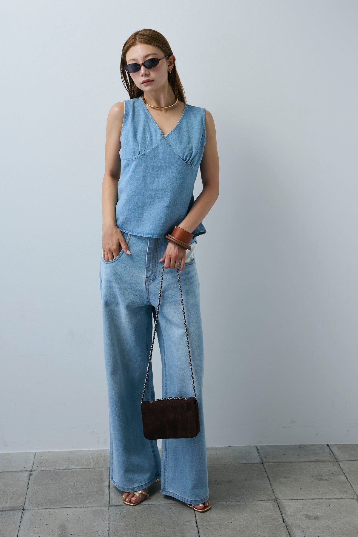 [予約/SET]Vネックバックリボンデニムトップス+デニムルーズポケットパンツ(2set)