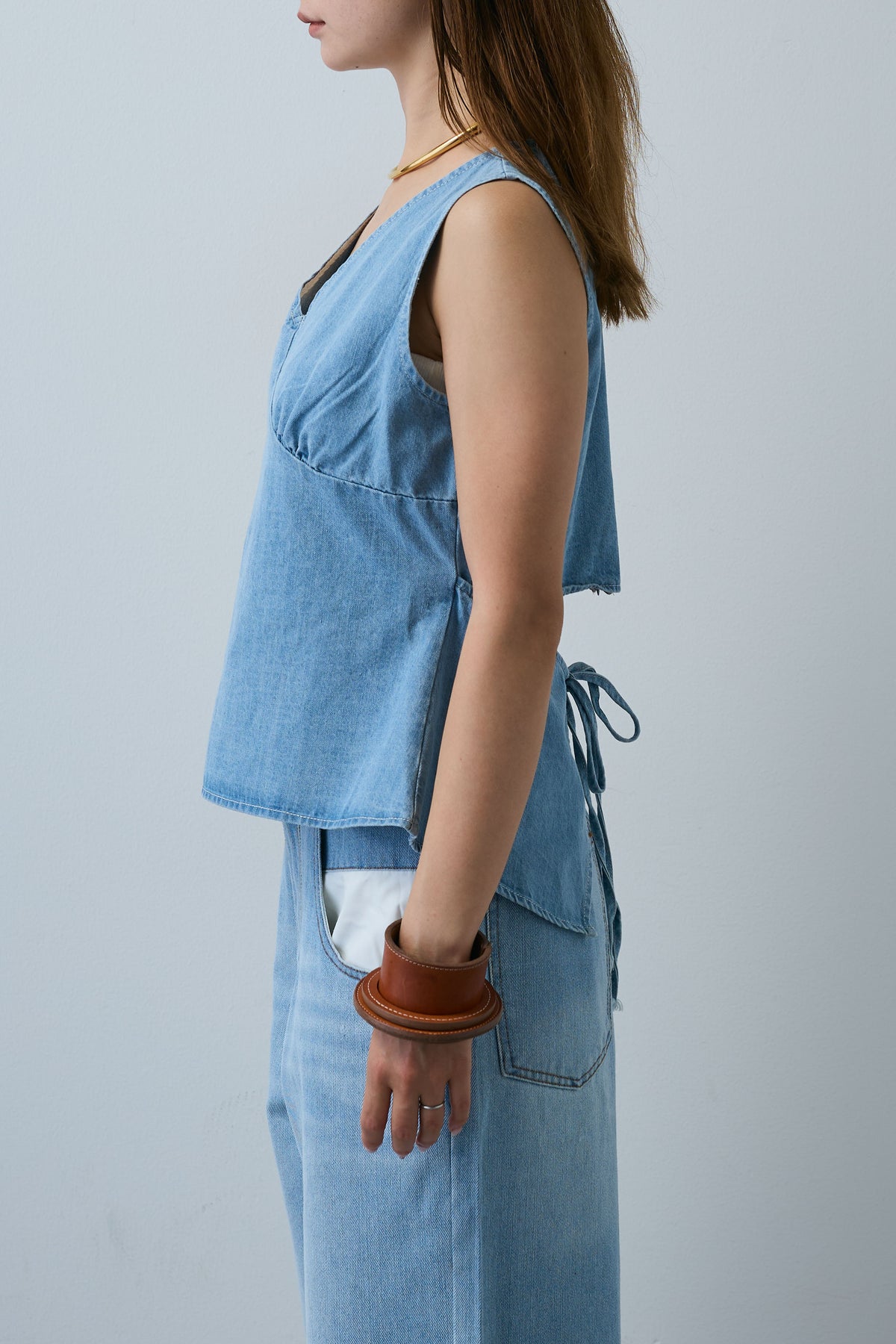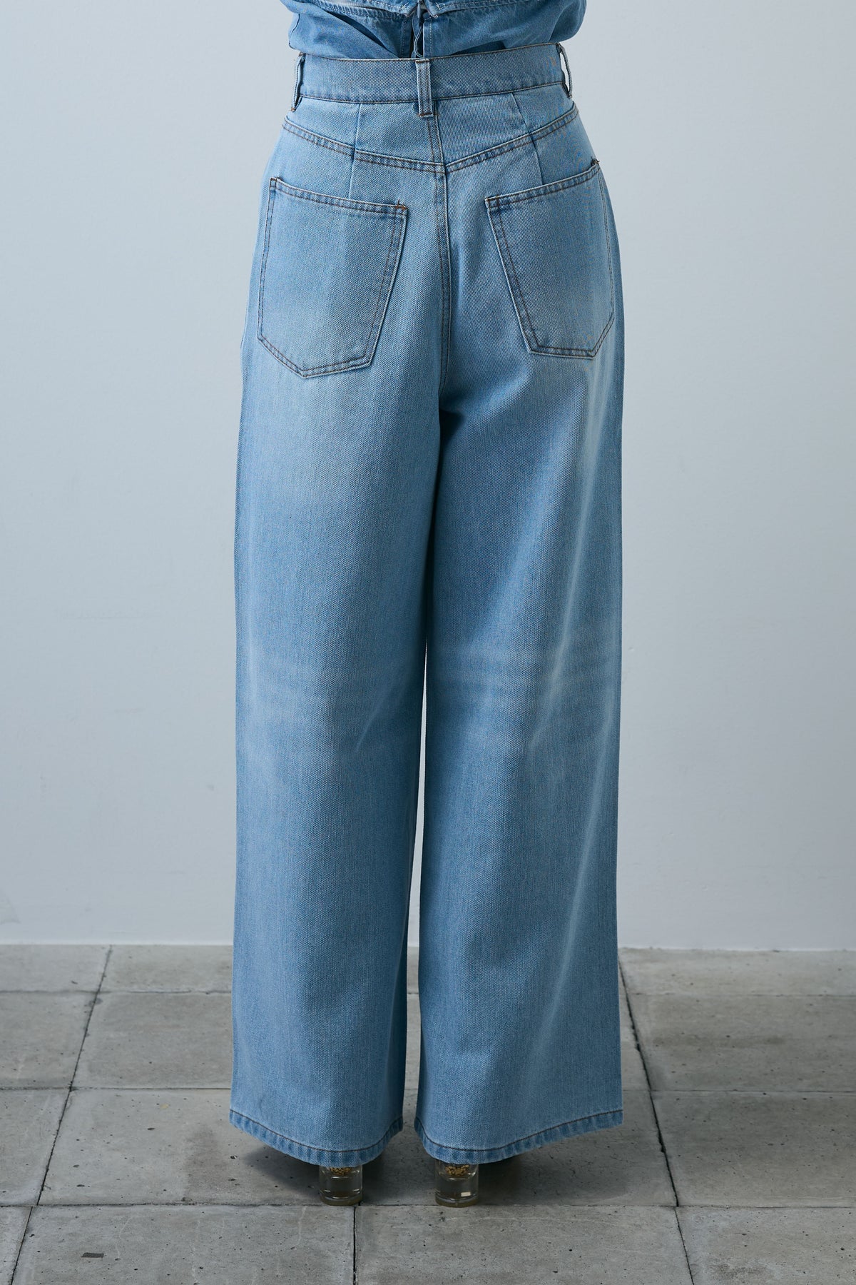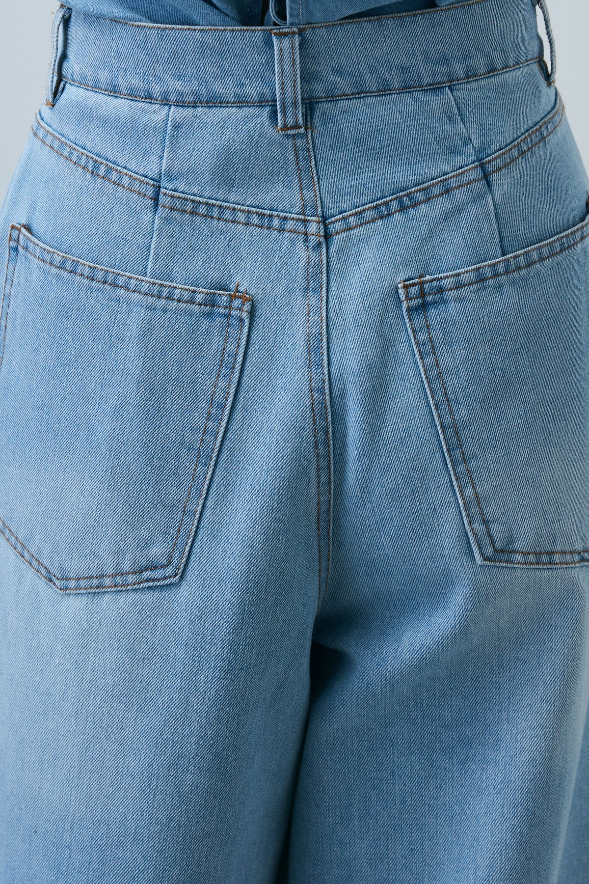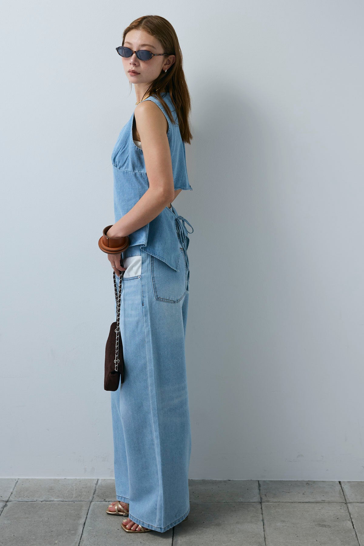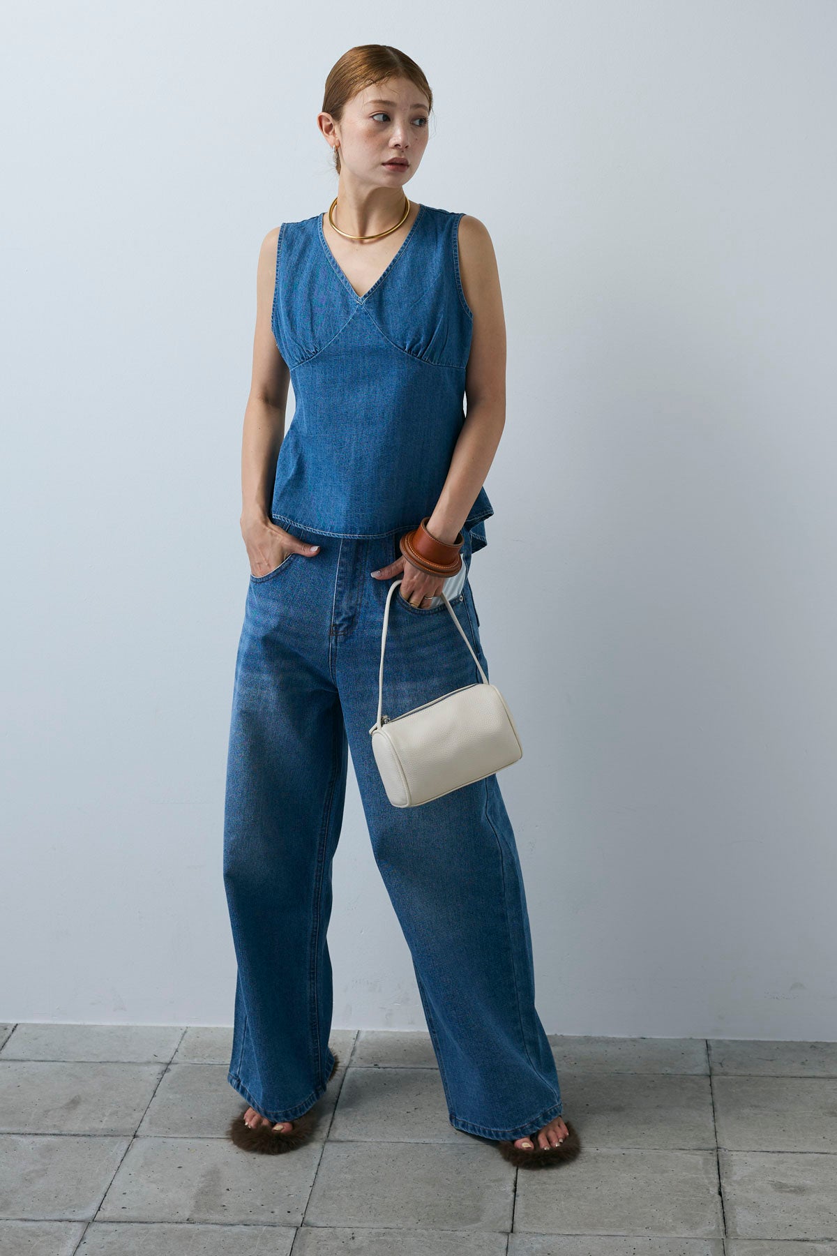 [予約/SET]Vネックバックリボンデニムトップス+デニムルーズポケットパンツ(2set)