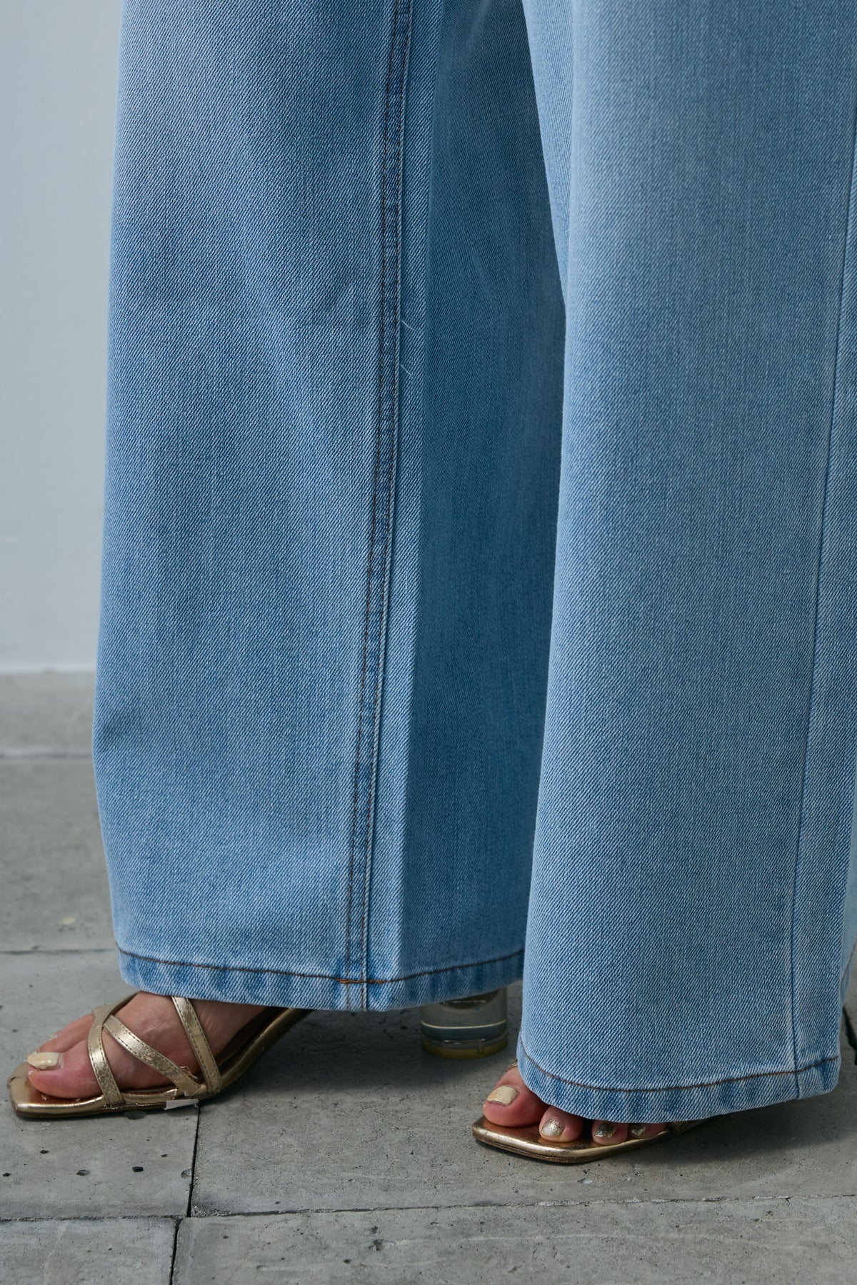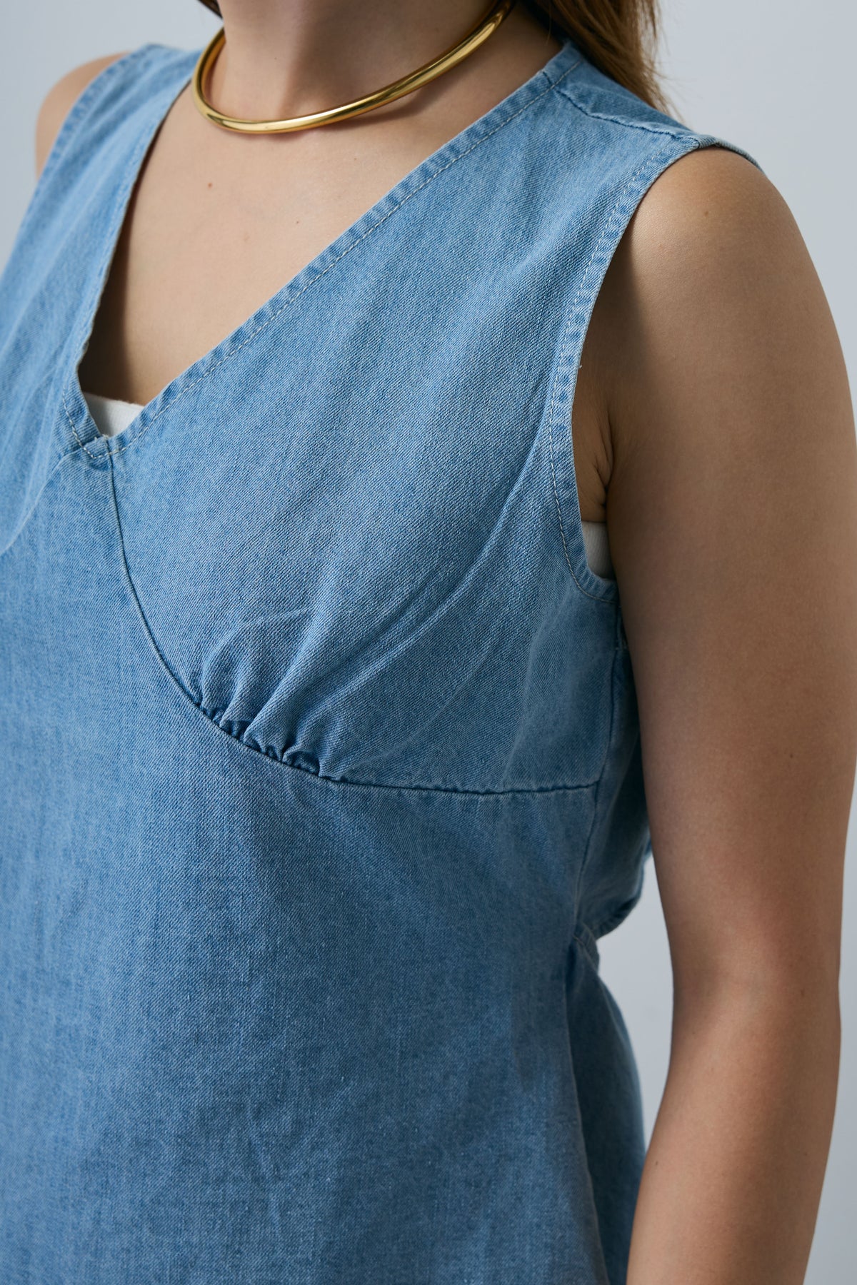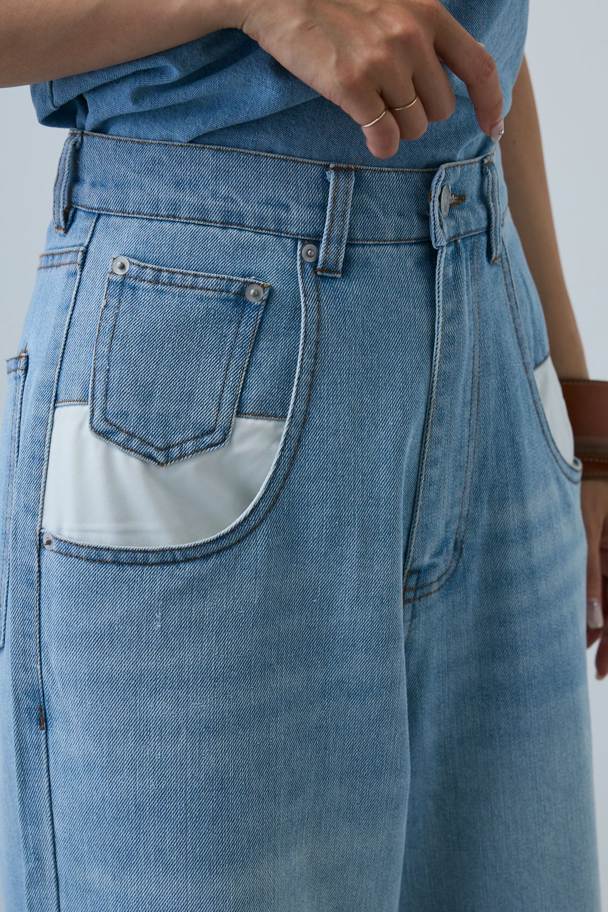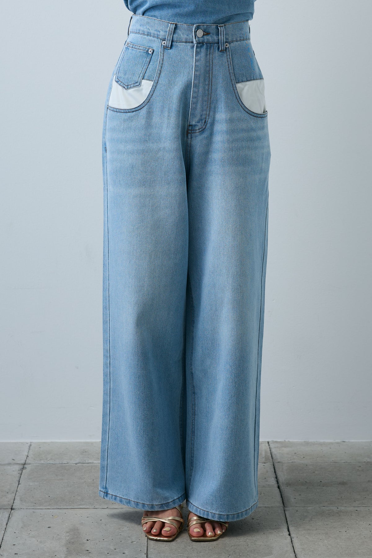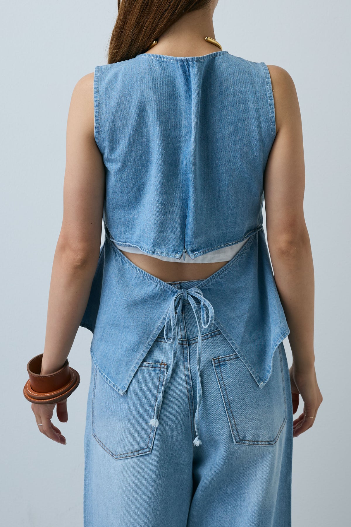 [予約/SET]Vネックバックリボンデニムトップス+デニムルーズポケットパンツ(2set)