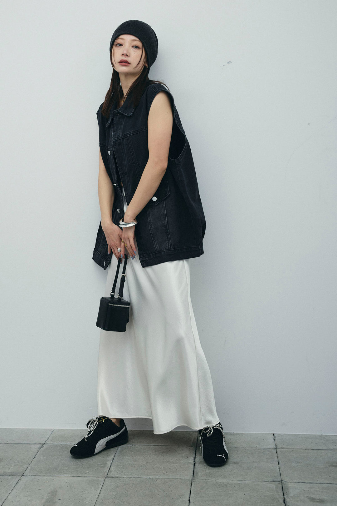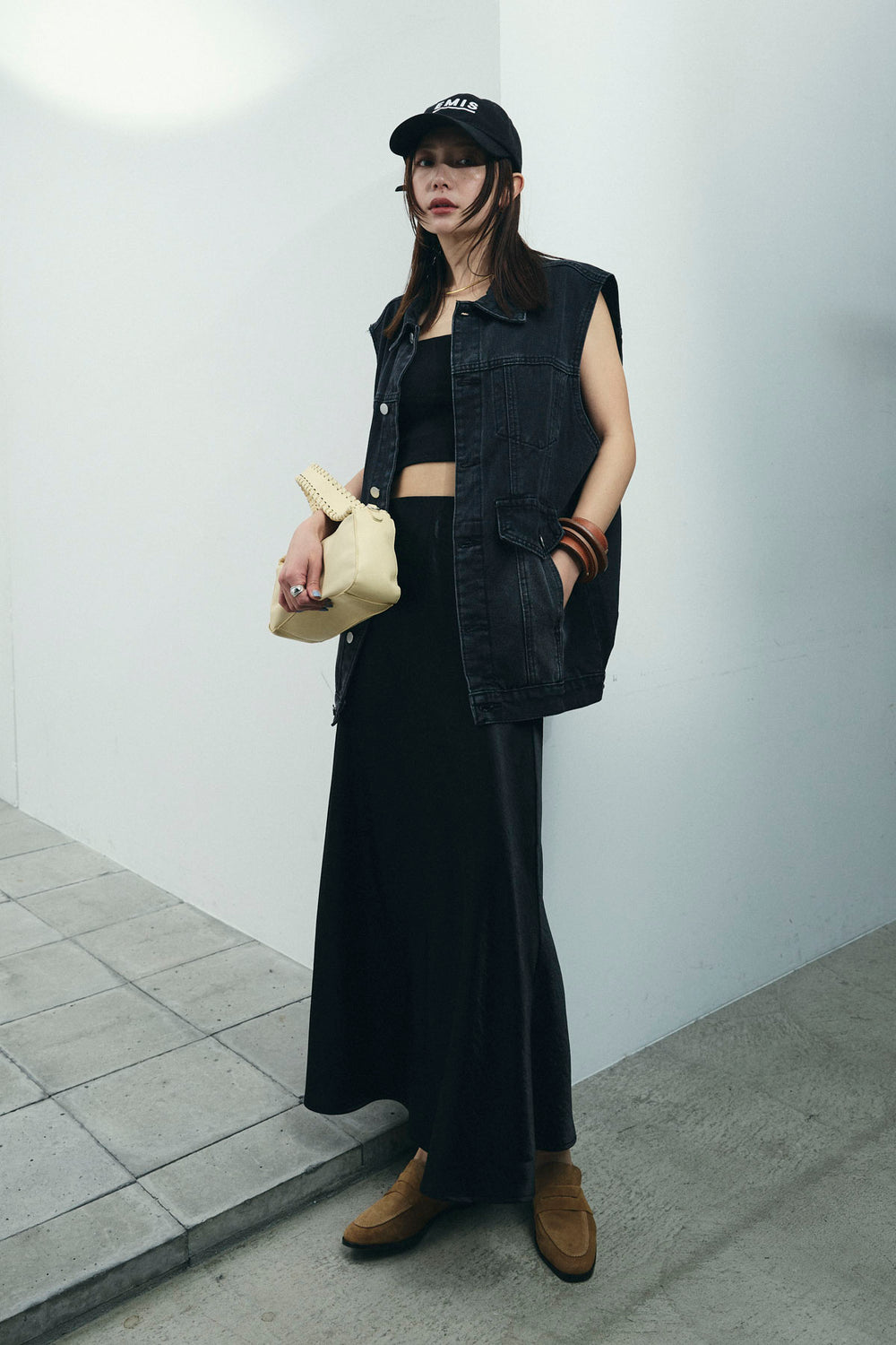 [予約/SET]ヴィンテージライクノースリデニムジャケット+クロップドカップ付きキャミ+サテンナロースカート(3set)