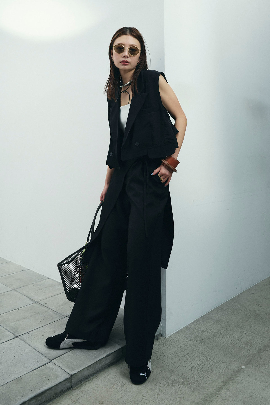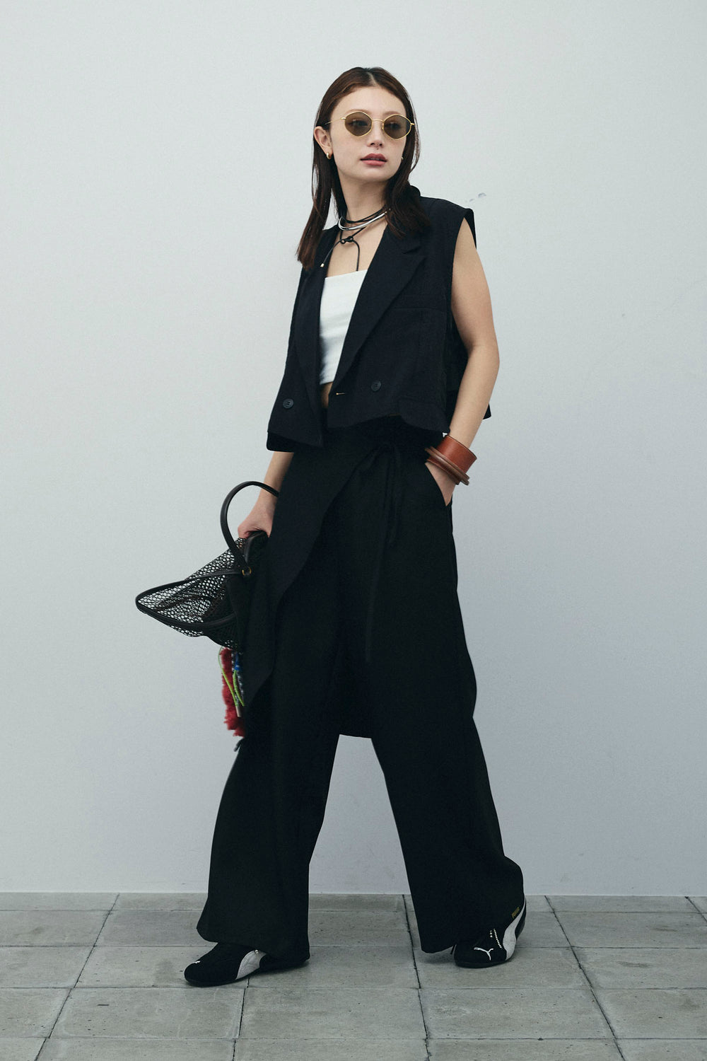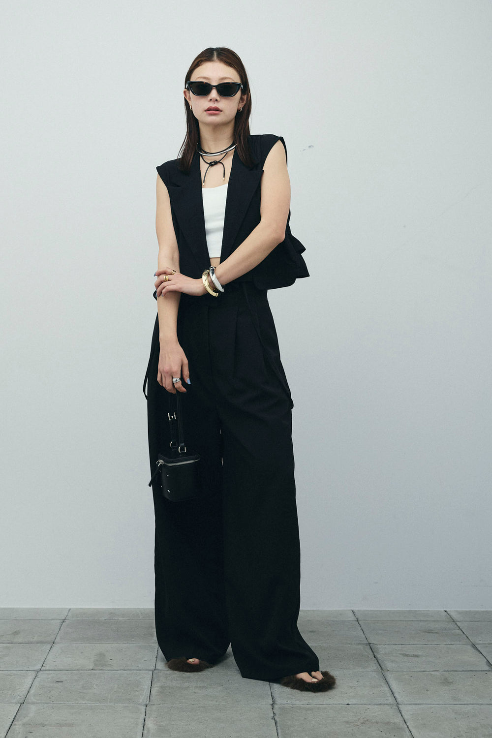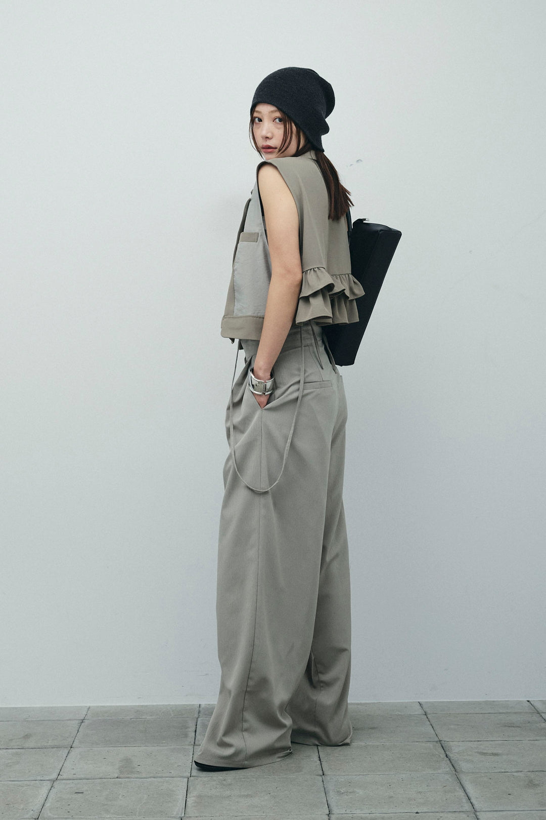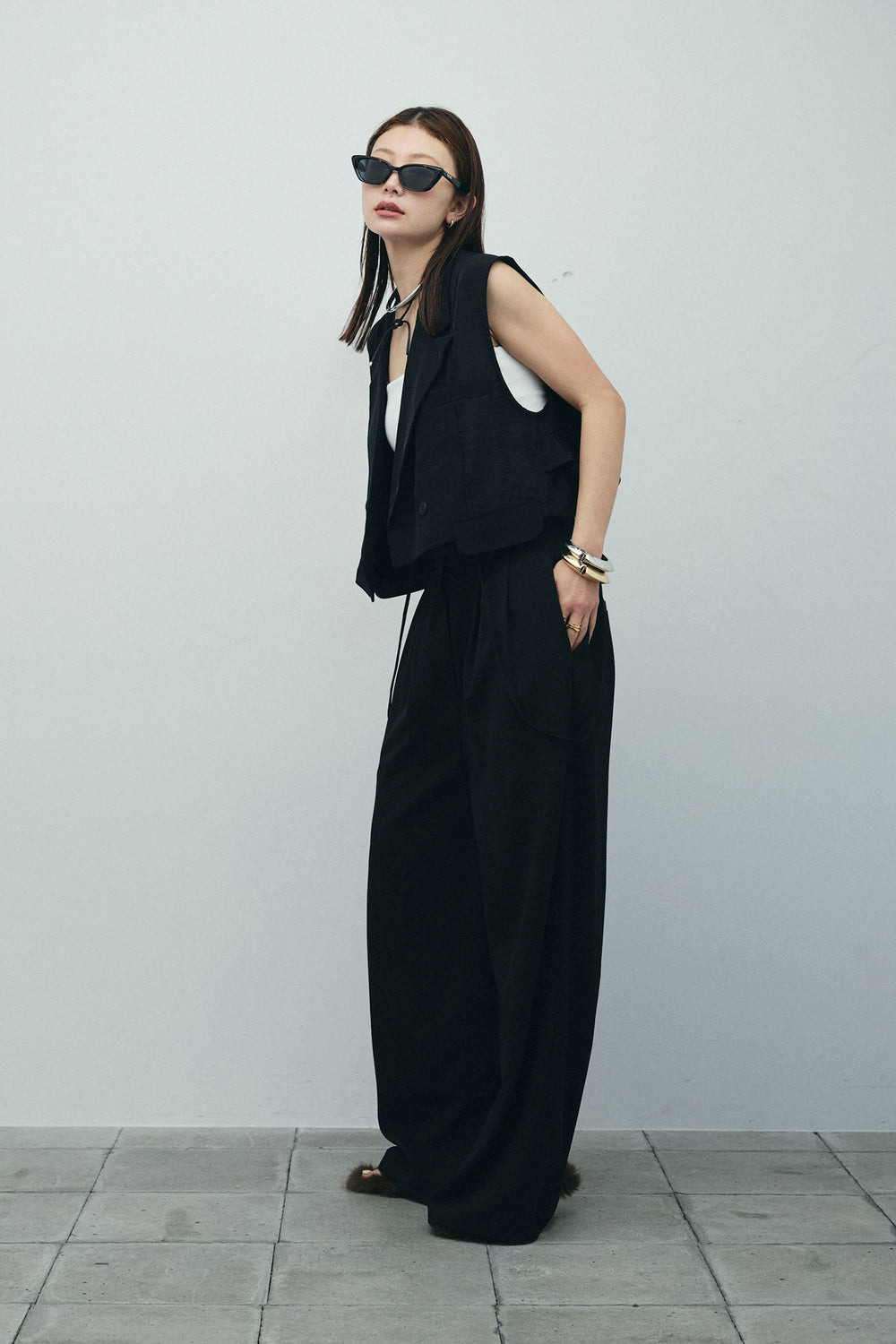 [予約/SET]バックフリルヘムショートテーラードベスト+クロップドカップ付きキャミ+クレープタックワイドサロペット(3set)