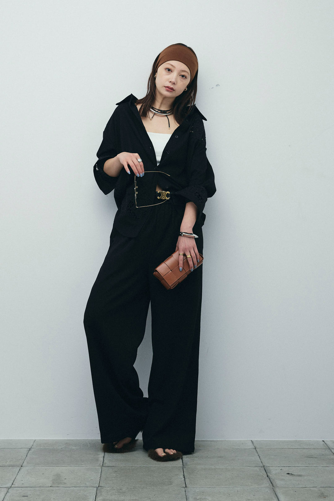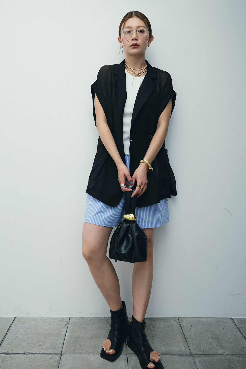 [予約/SET]ラメワッシャーダブルジレ+カップ付きホルターネックタンク+ウエスト巻きストライプワイドパンツ(3set)