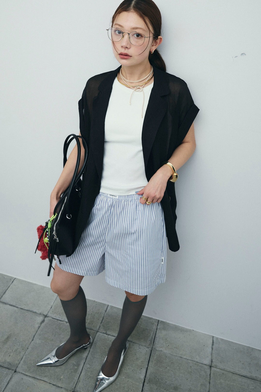 [予約/SET]ラメワッシャーダブルジレ+ストライプイージーハーフパンツ(2set)