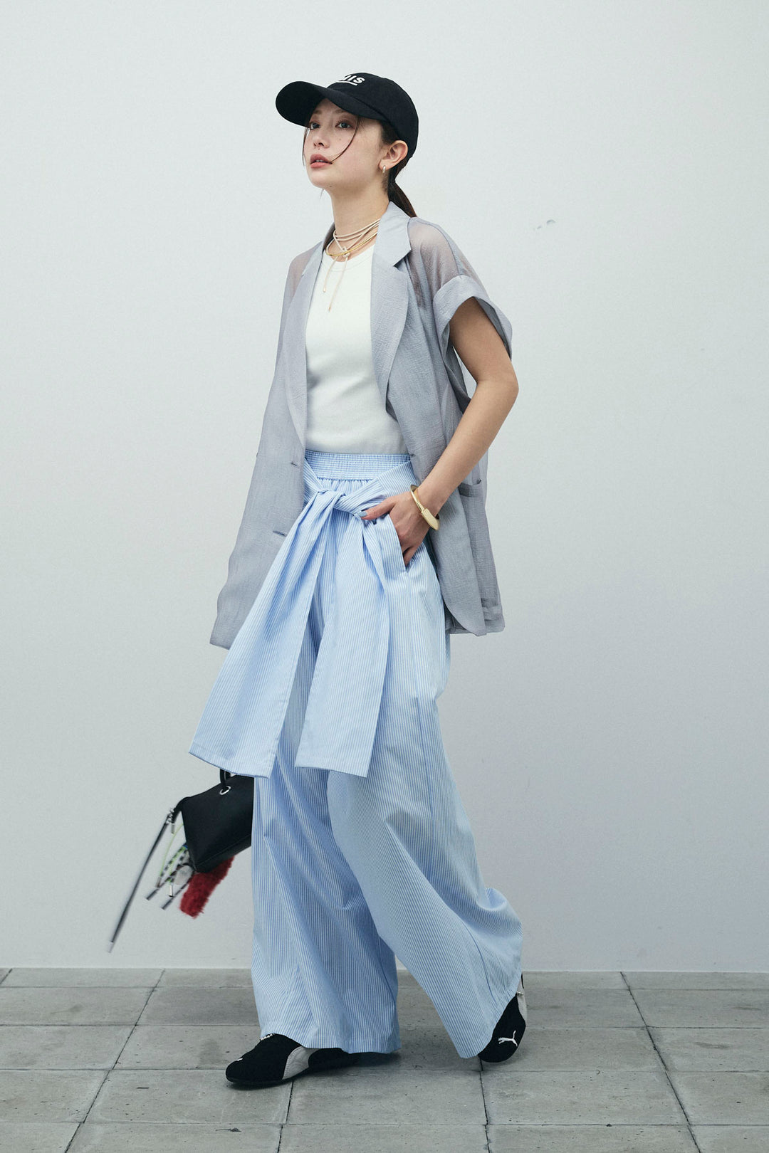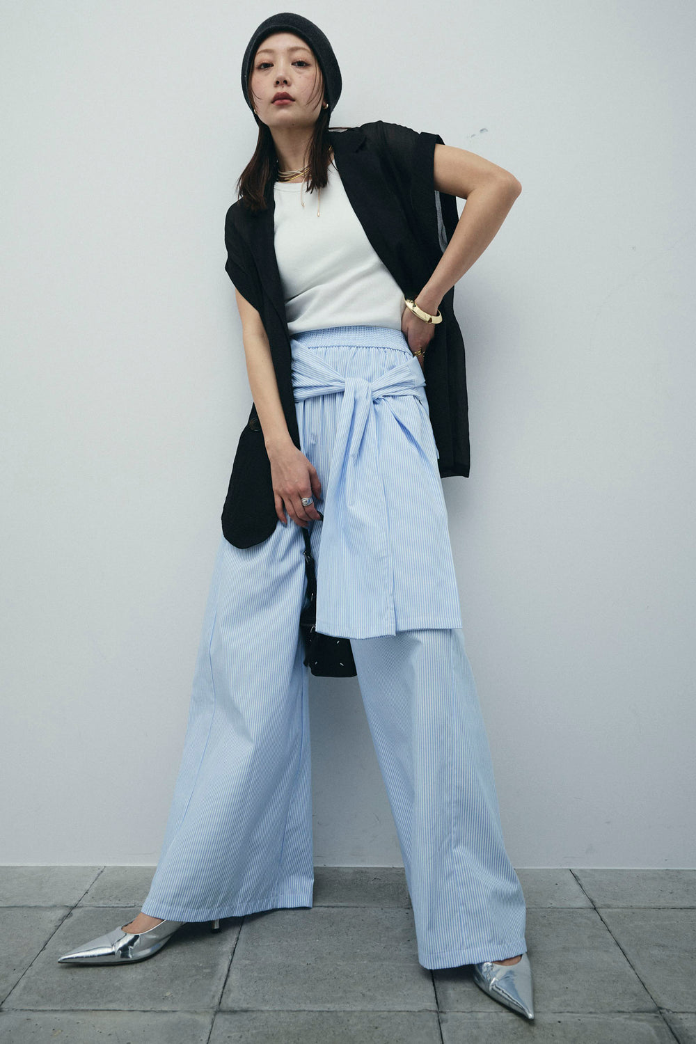 [予約/SET]ラメワッシャーダブルジレ+ウエスト巻きストライプワイドパンツ(2set)