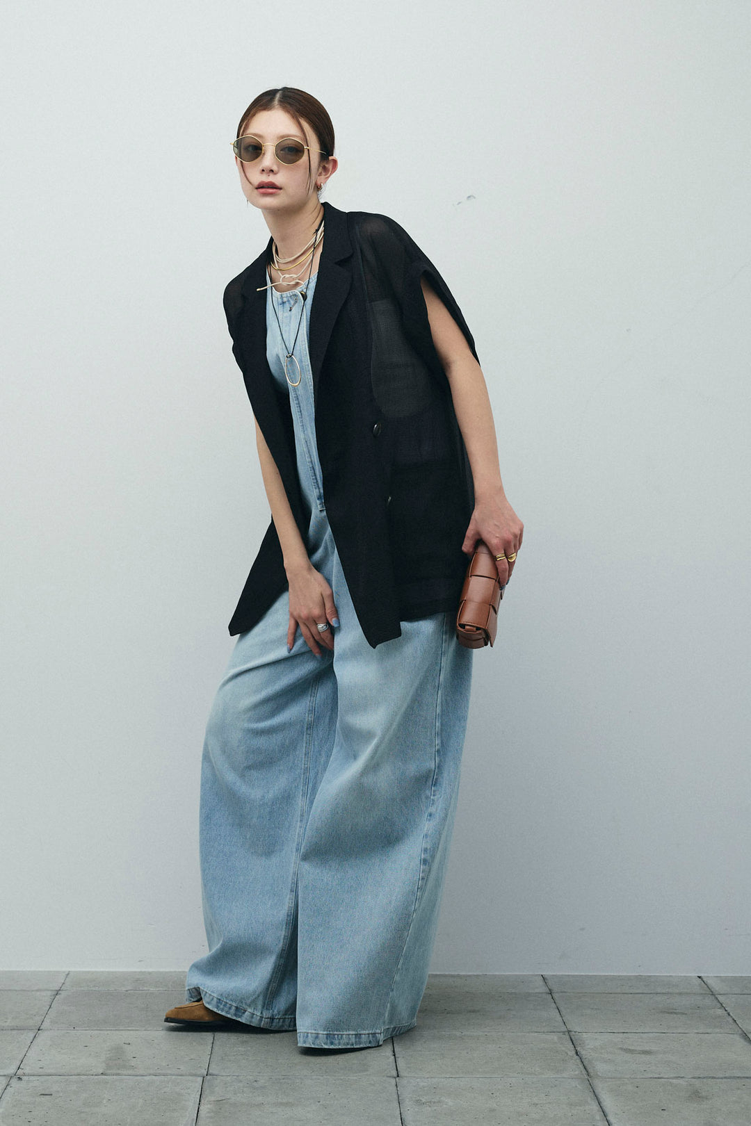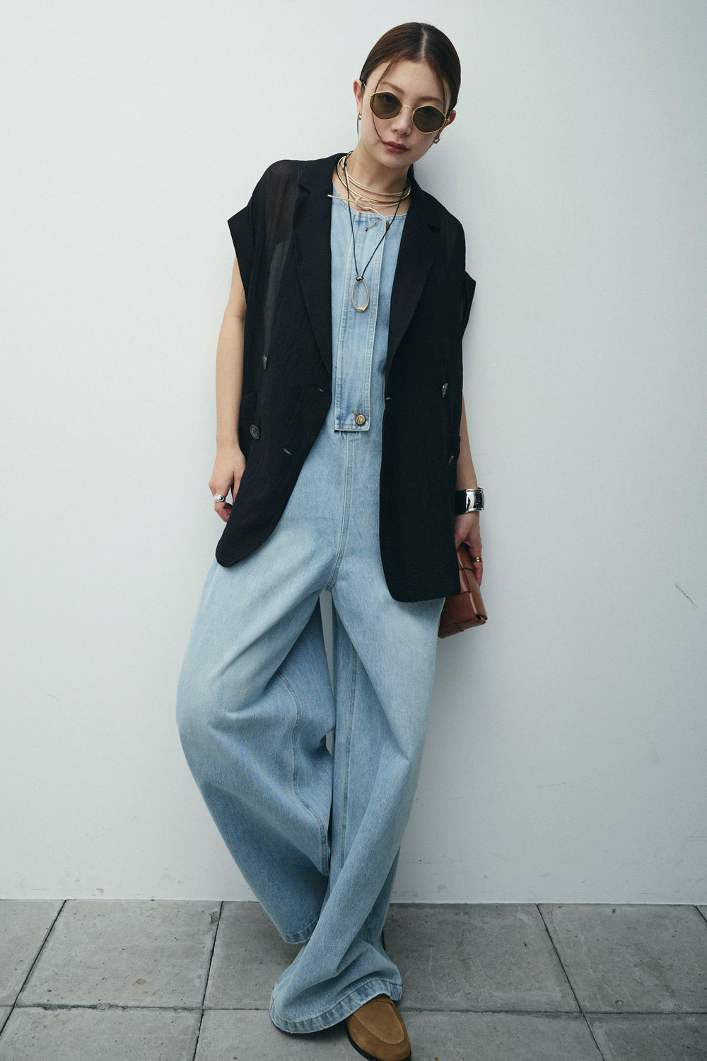 [予約/SET]ラメワッシャーダブルジレ+フロントジップアメスリデニムオールインワン(2set)