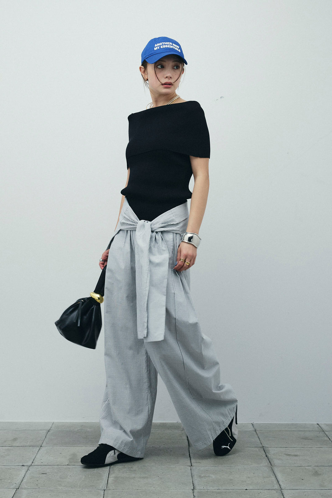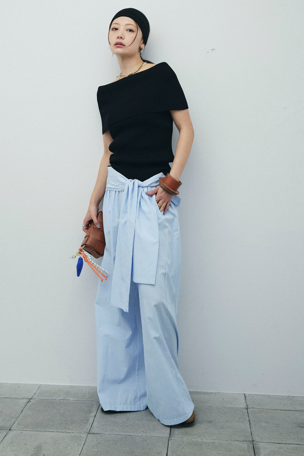 [予約/SET]リブオフショルプルオーバー+ウエスト巻きストライプワイドパンツ(2set)