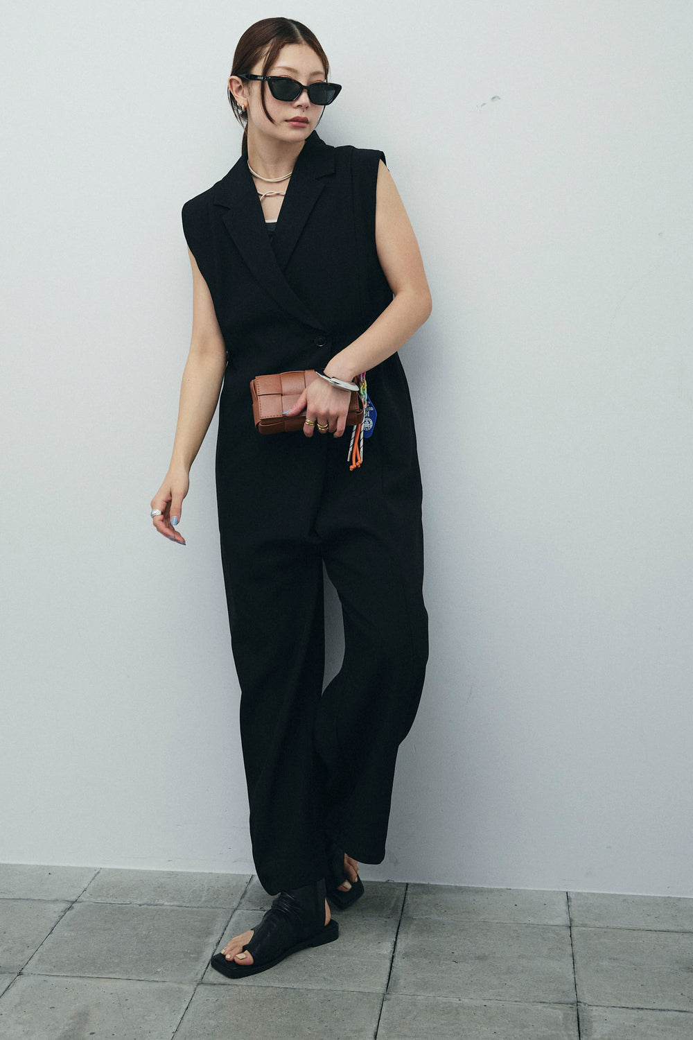 [予約/SET]バックフリルヘムショートテーラードベスト+クレープタックワイドサロペット(2set)