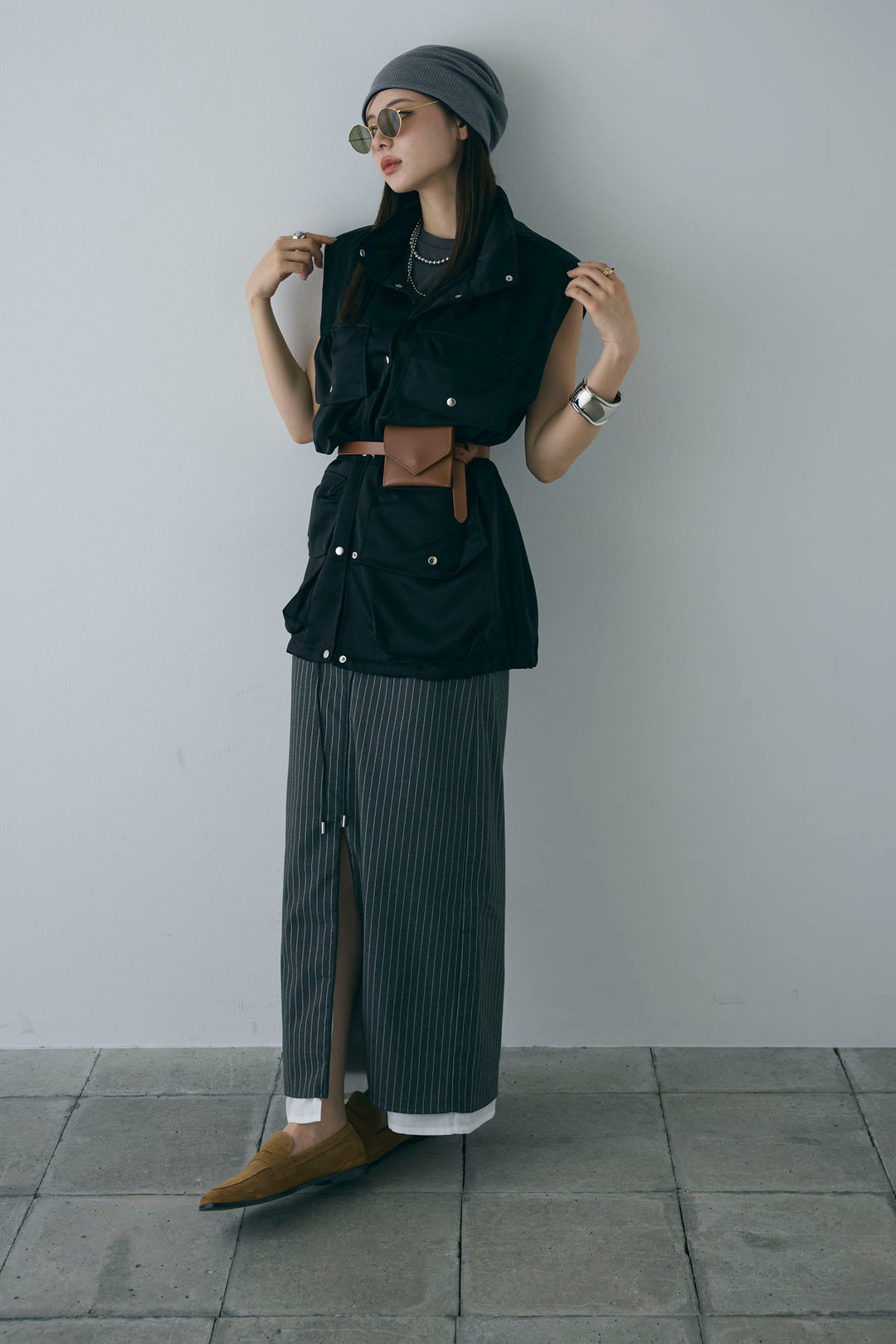 [予約/SET]スタンドネックサテンベスト+ストライプストレートスカート(2set)