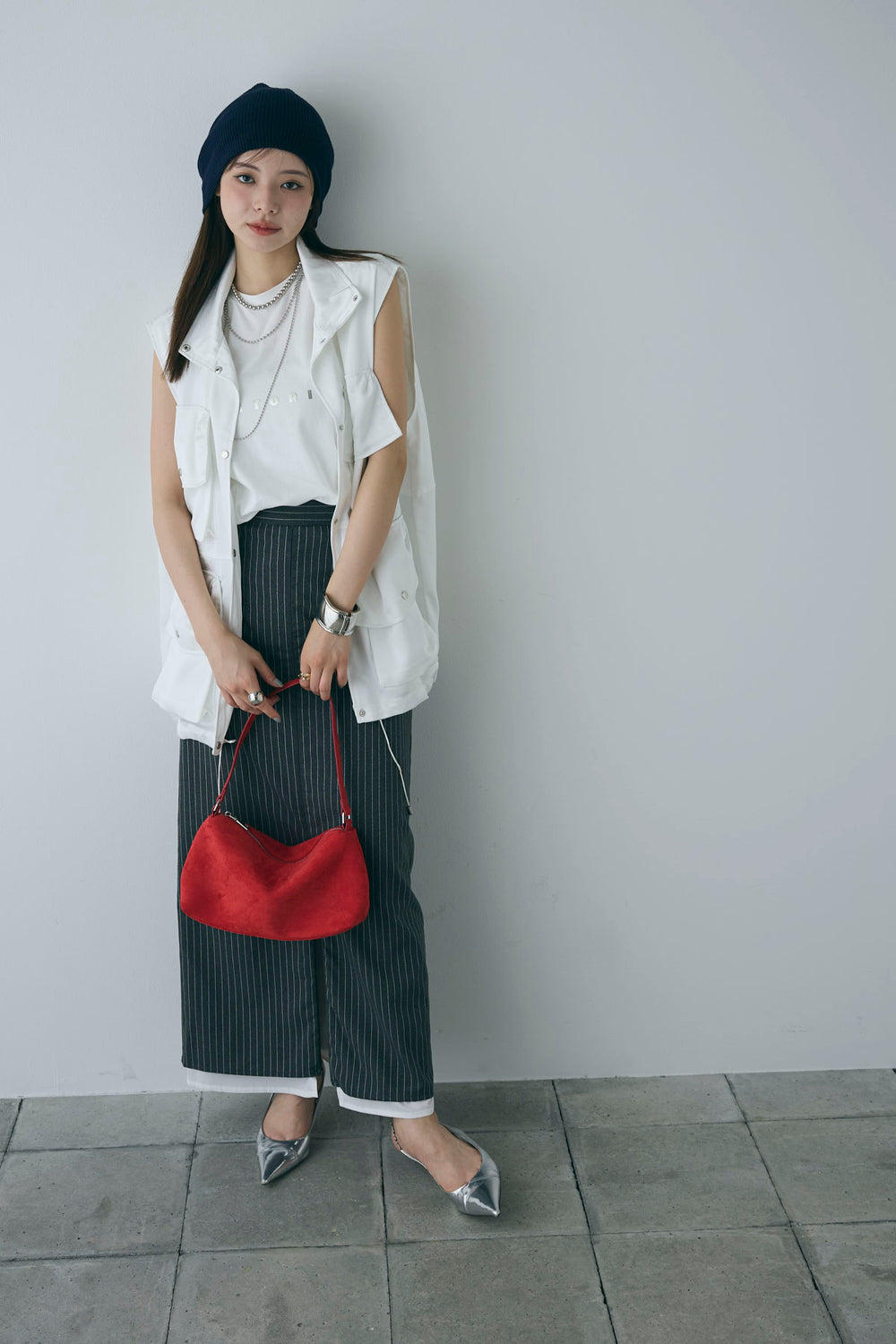 [予約/SET]コンパクトスムース ミニ箔ロゴプリント+ランダムタック入りワイドパンツ+レザーミニバッグ付きベルト(3set)