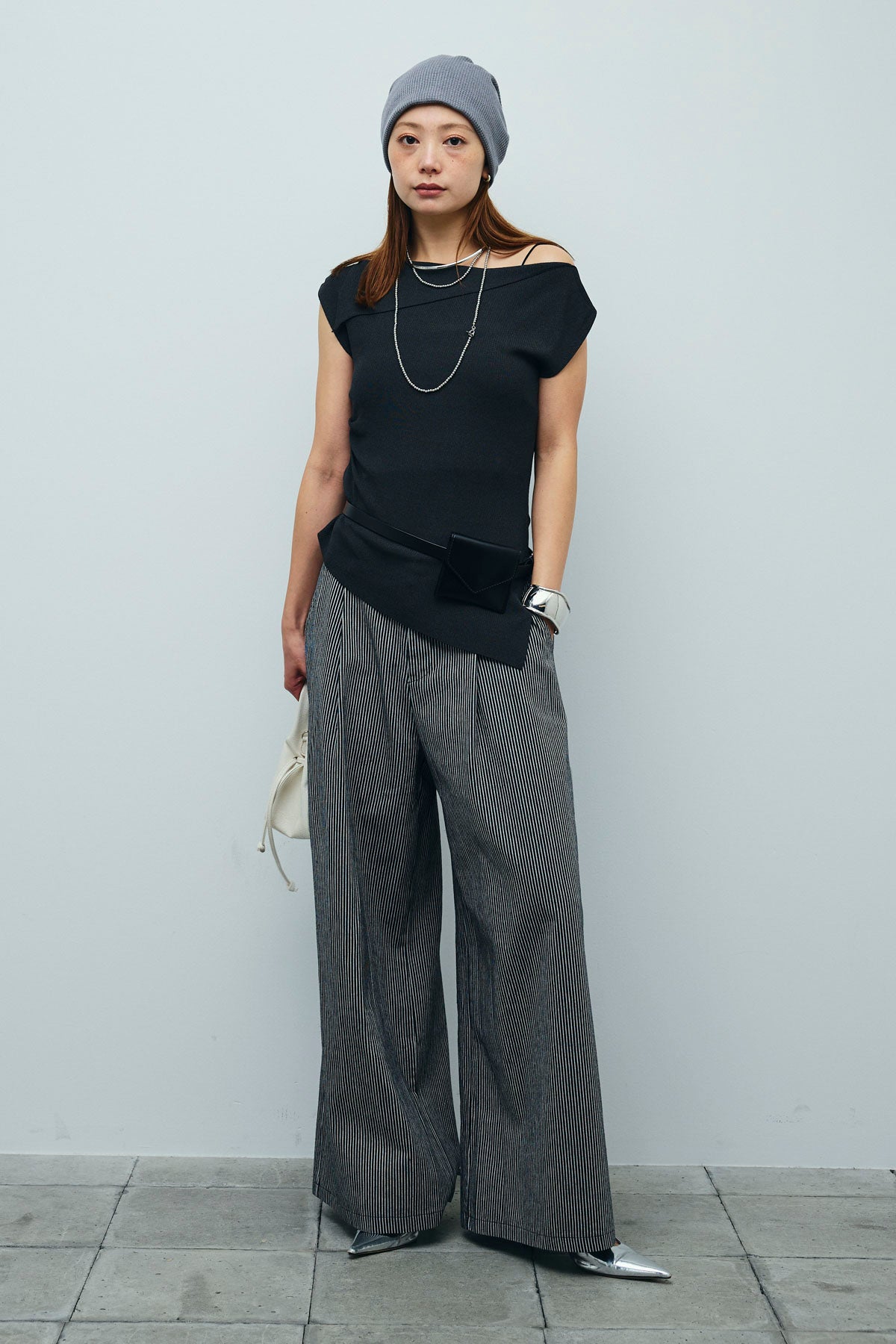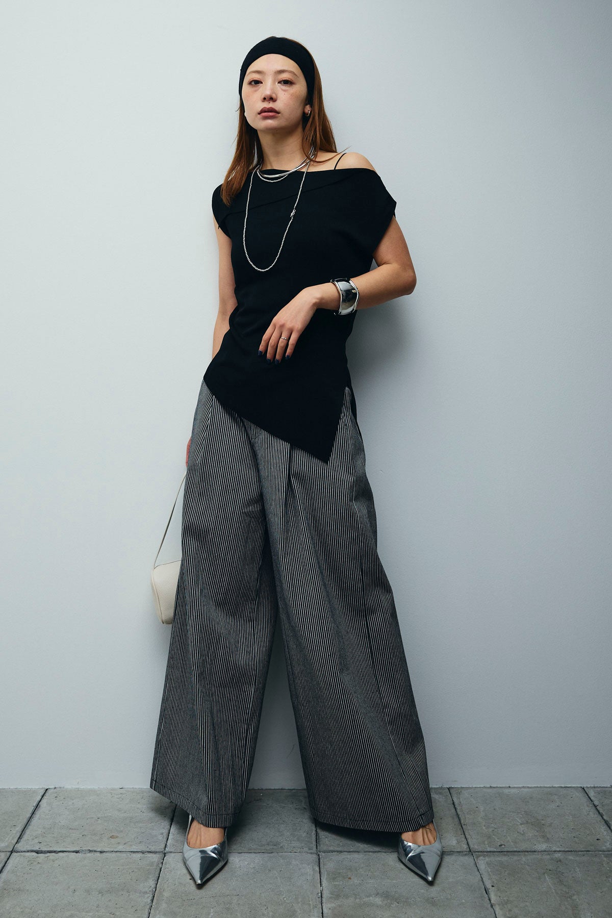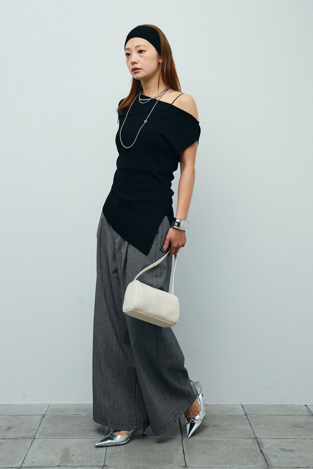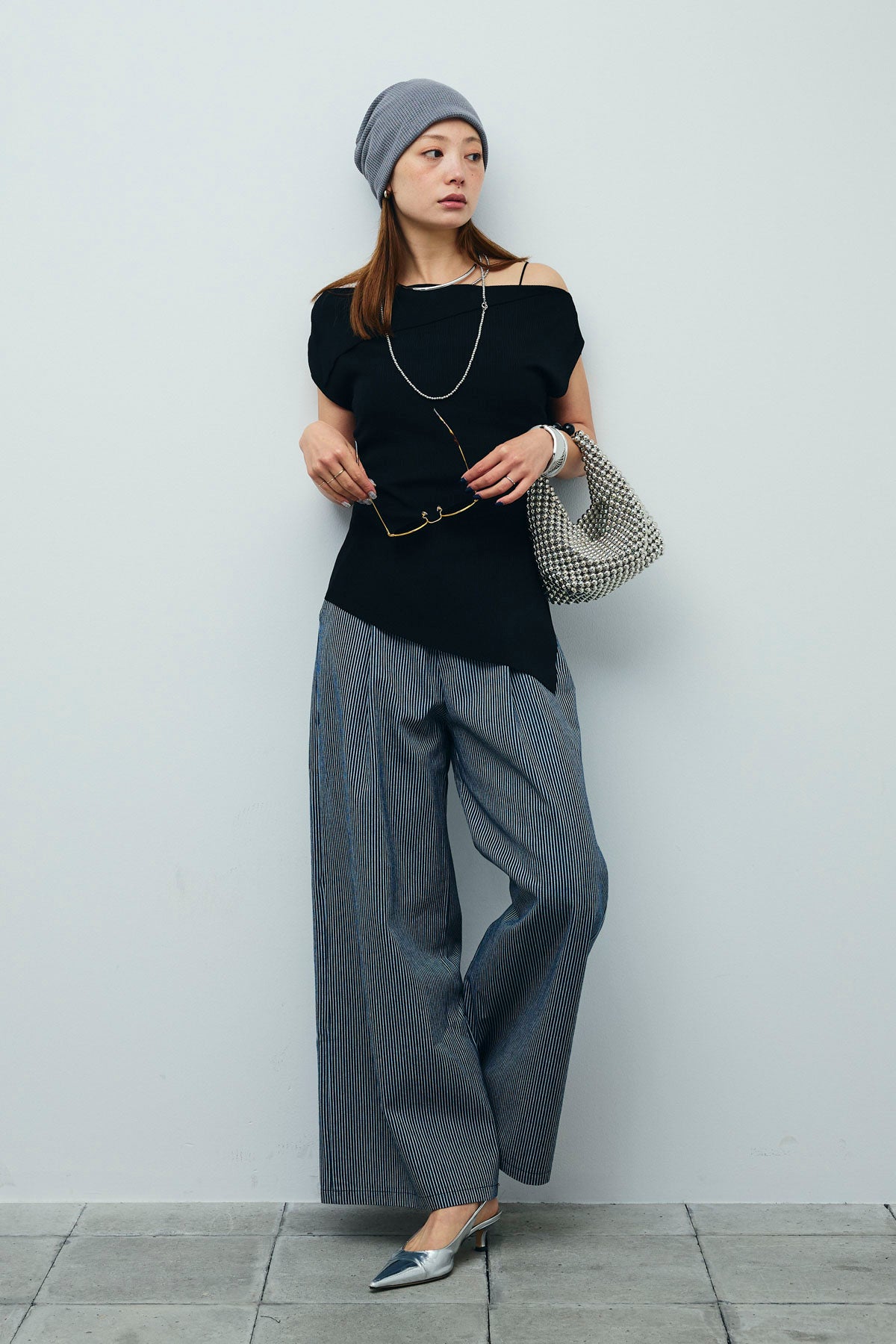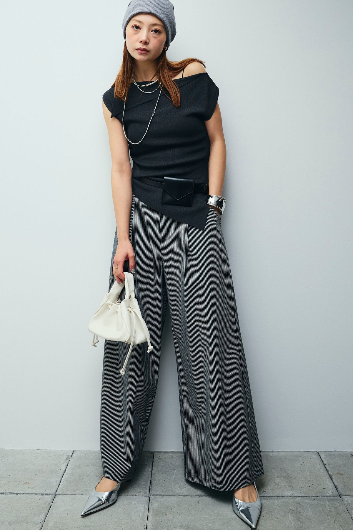 [予約/SET]アシンメトリーオフショルサマーニット+細ストライプワイドパンツ(2set)