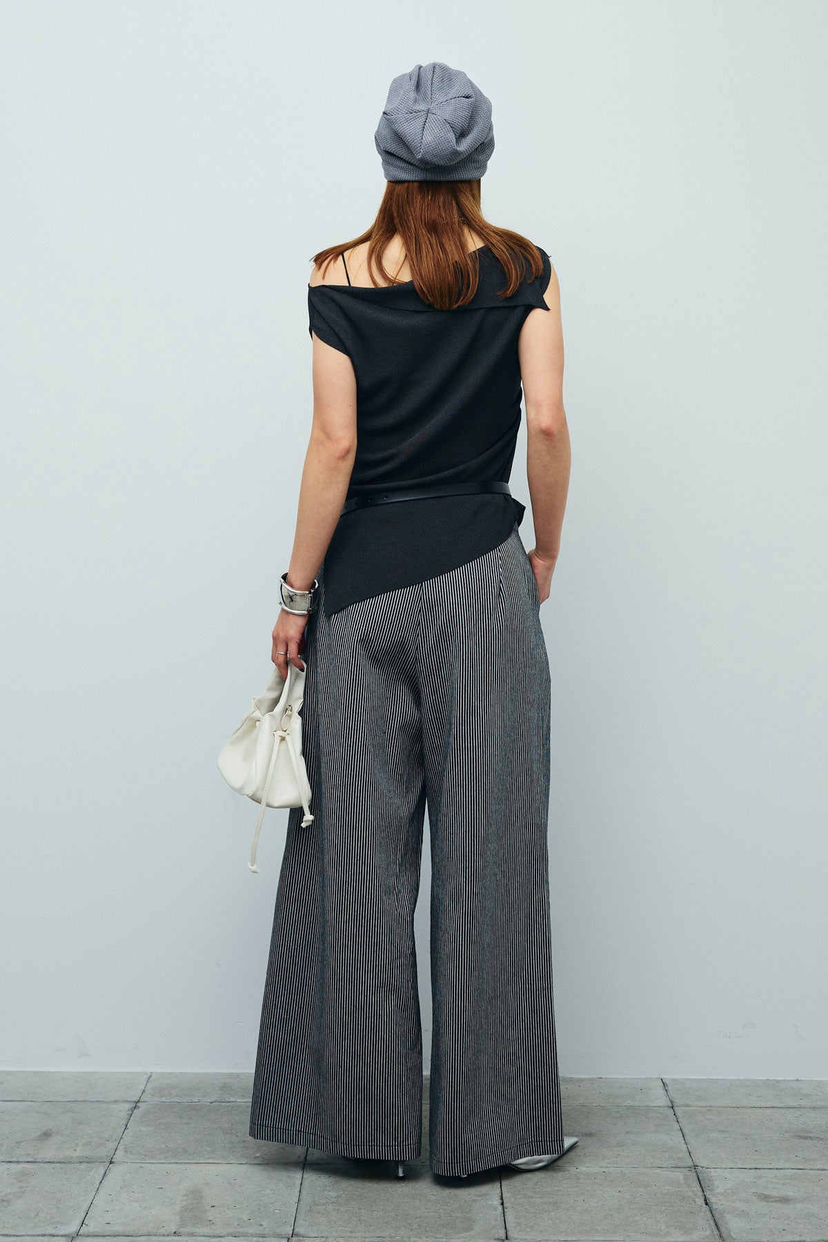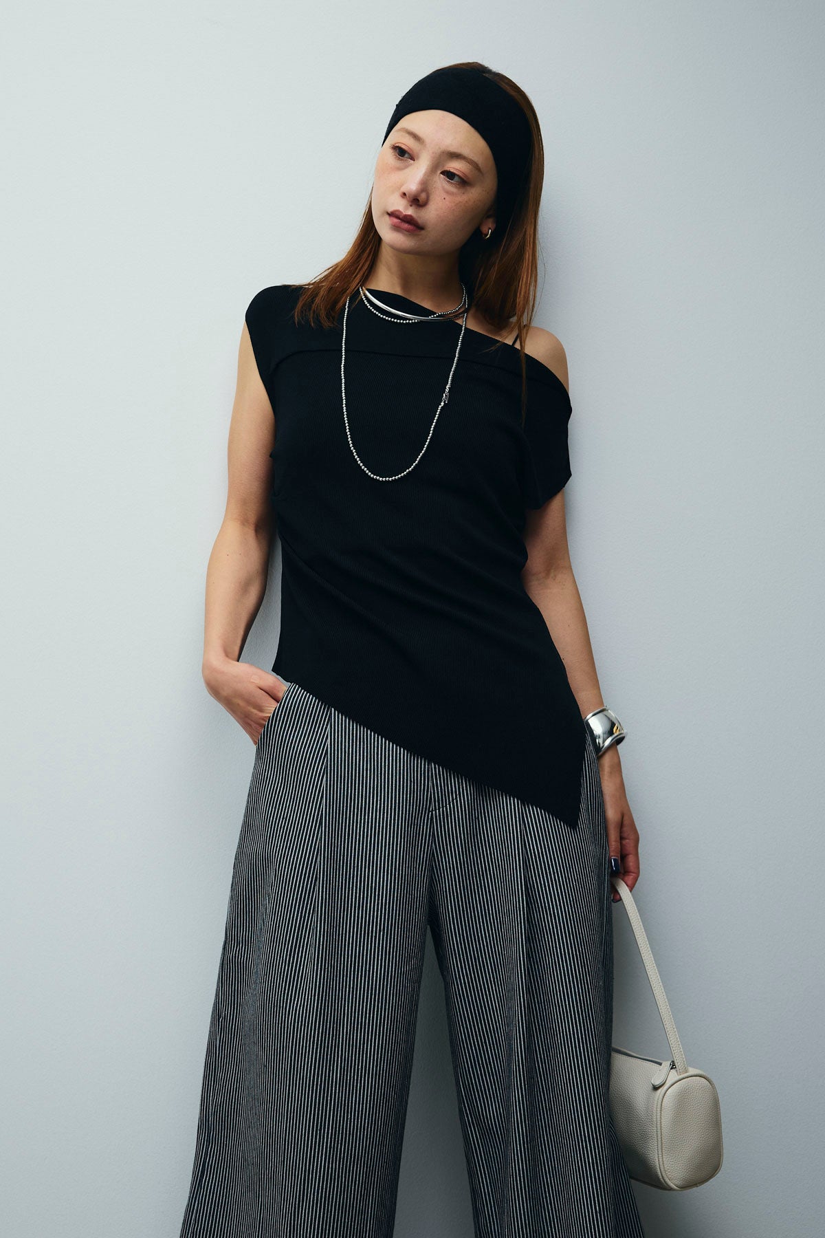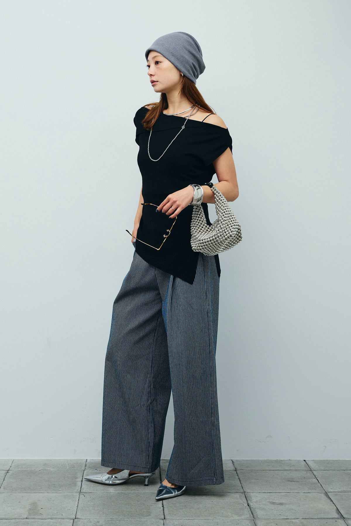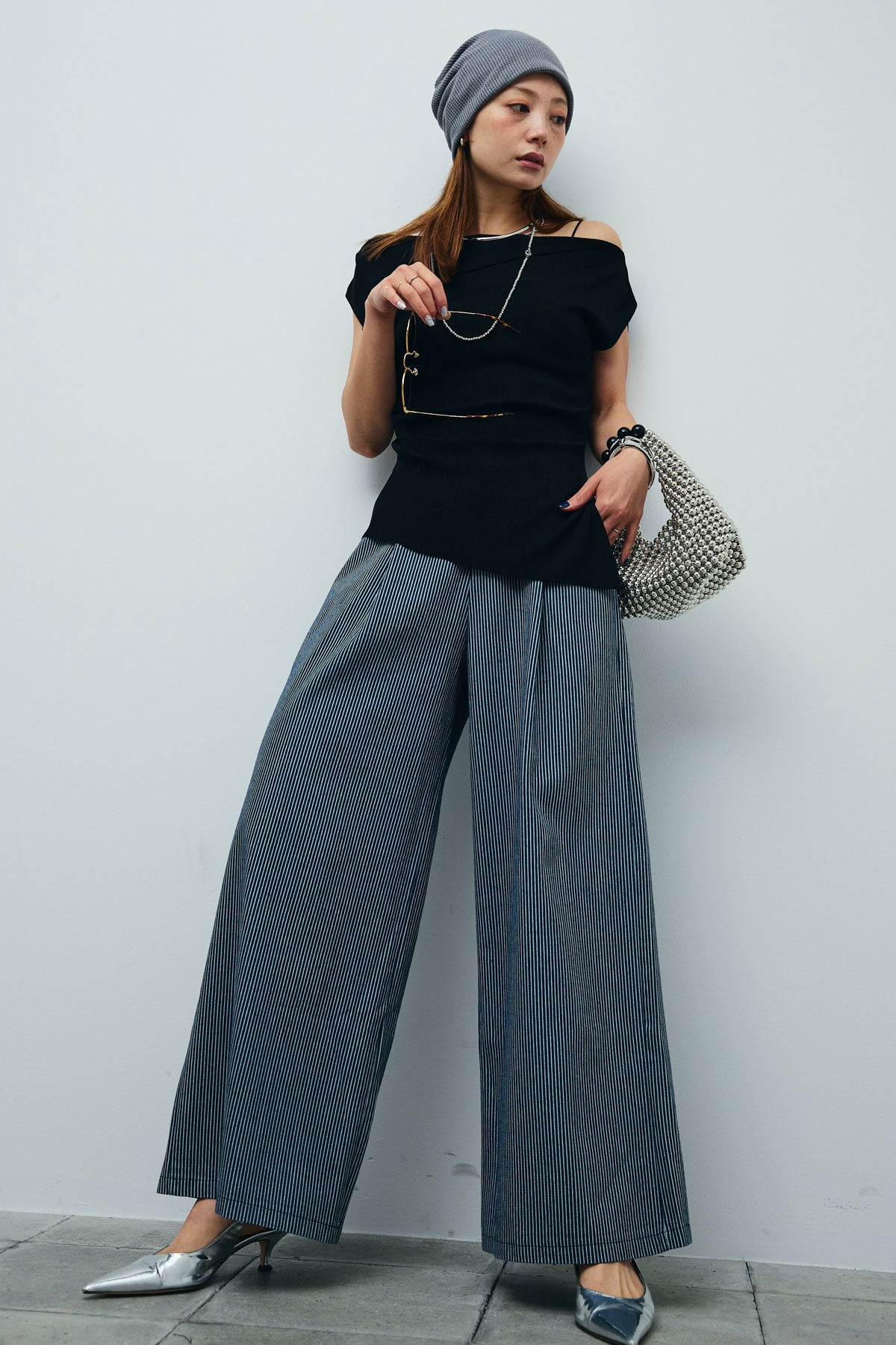 [予約/SET]アシンメトリーオフショルサマーニット+細ストライプワイドパンツ(2set)