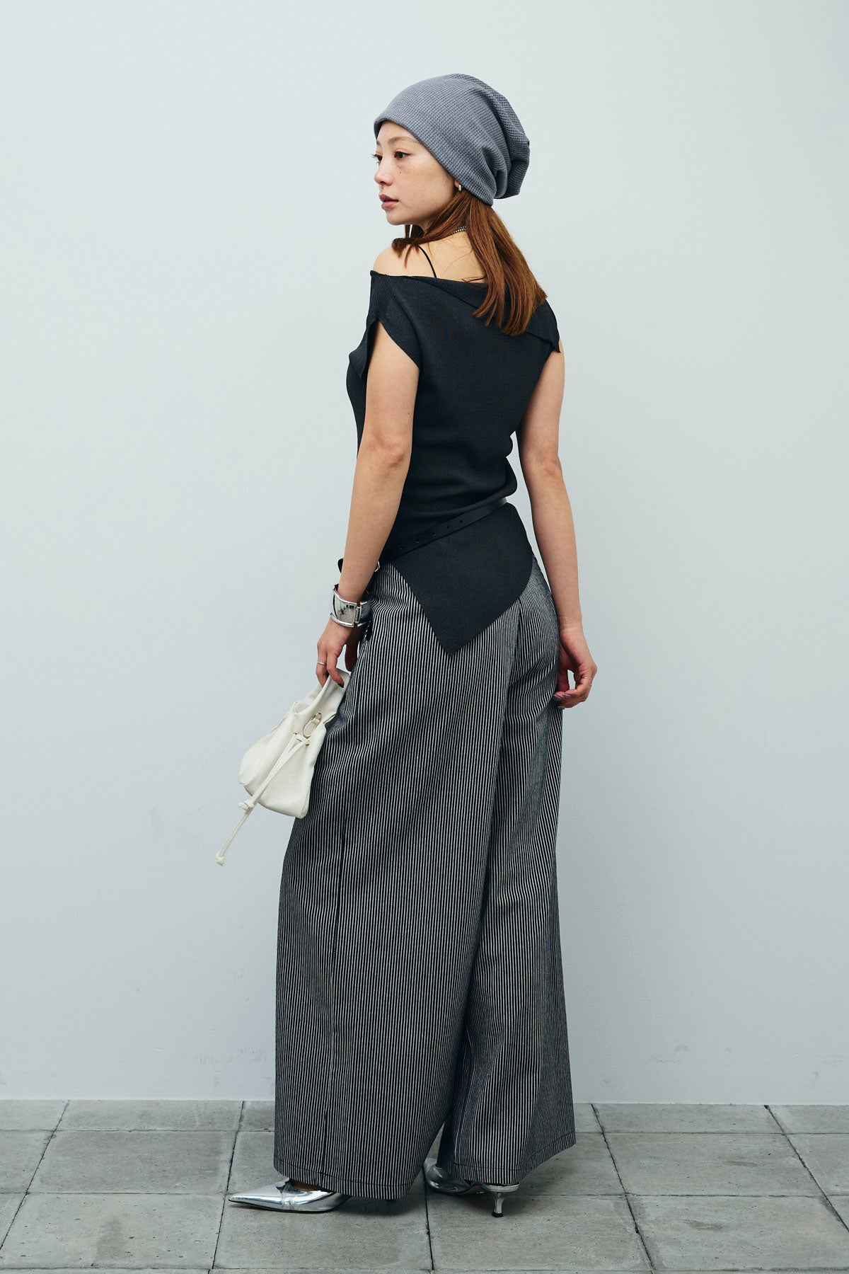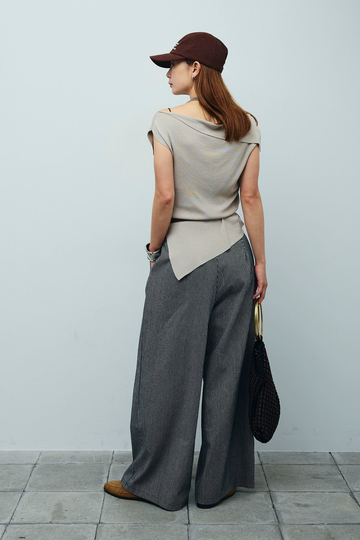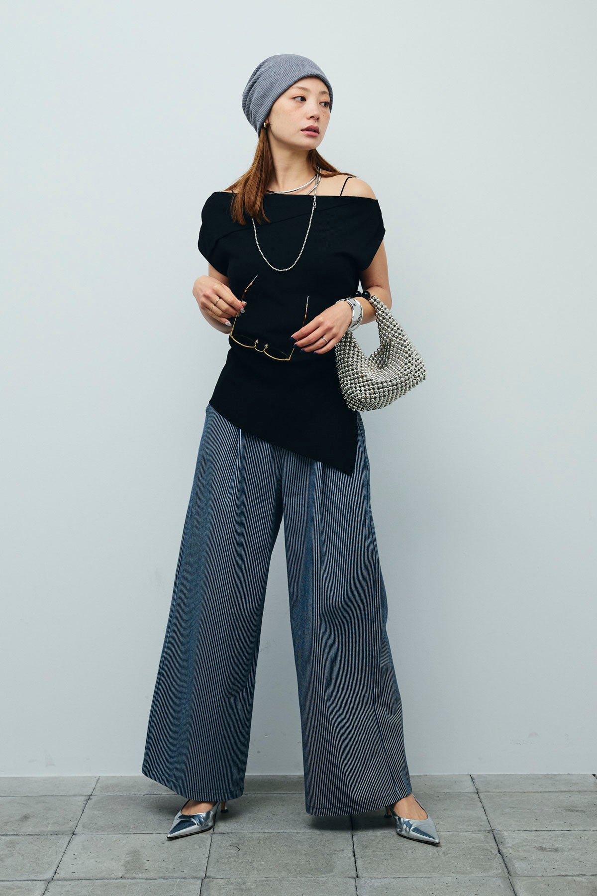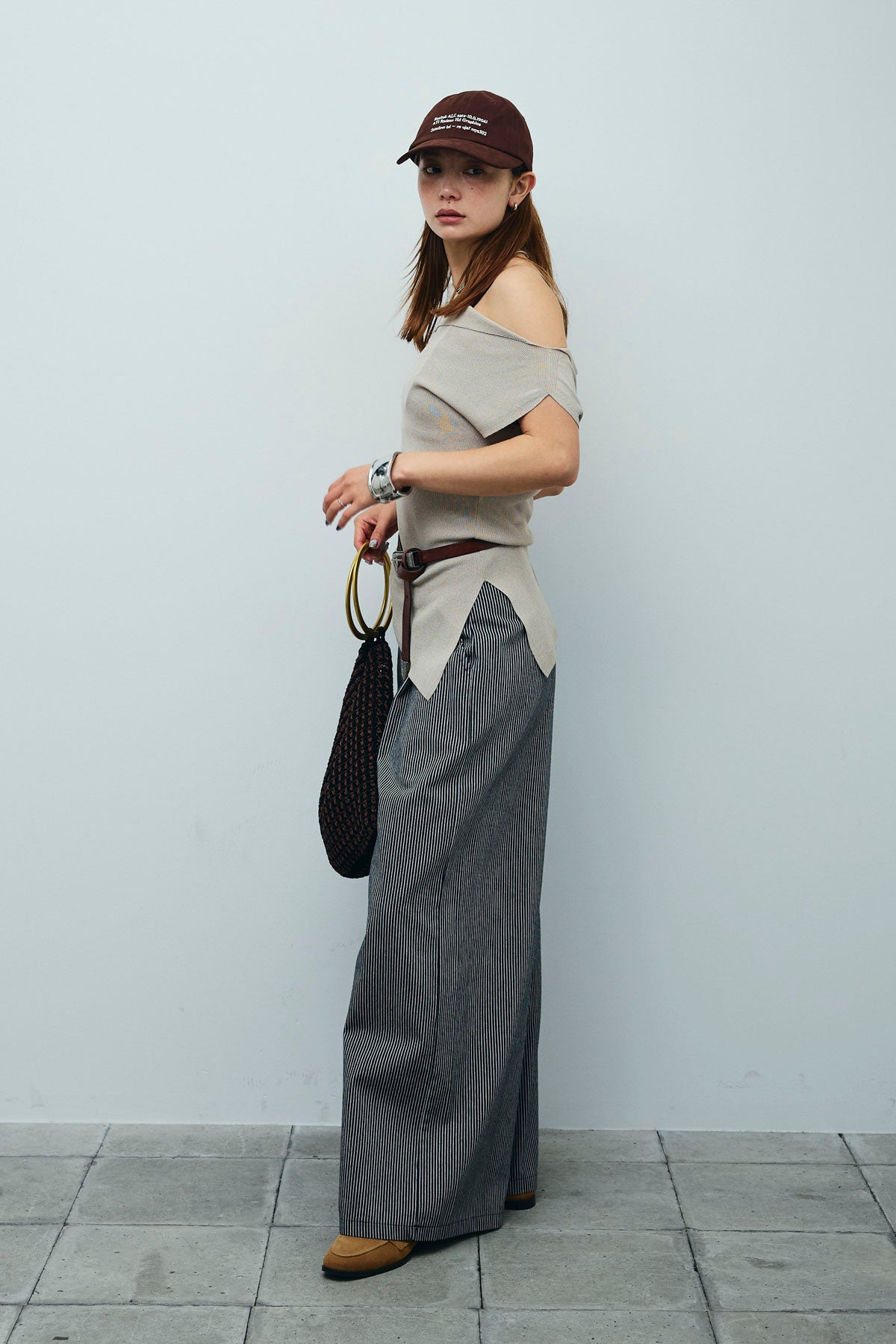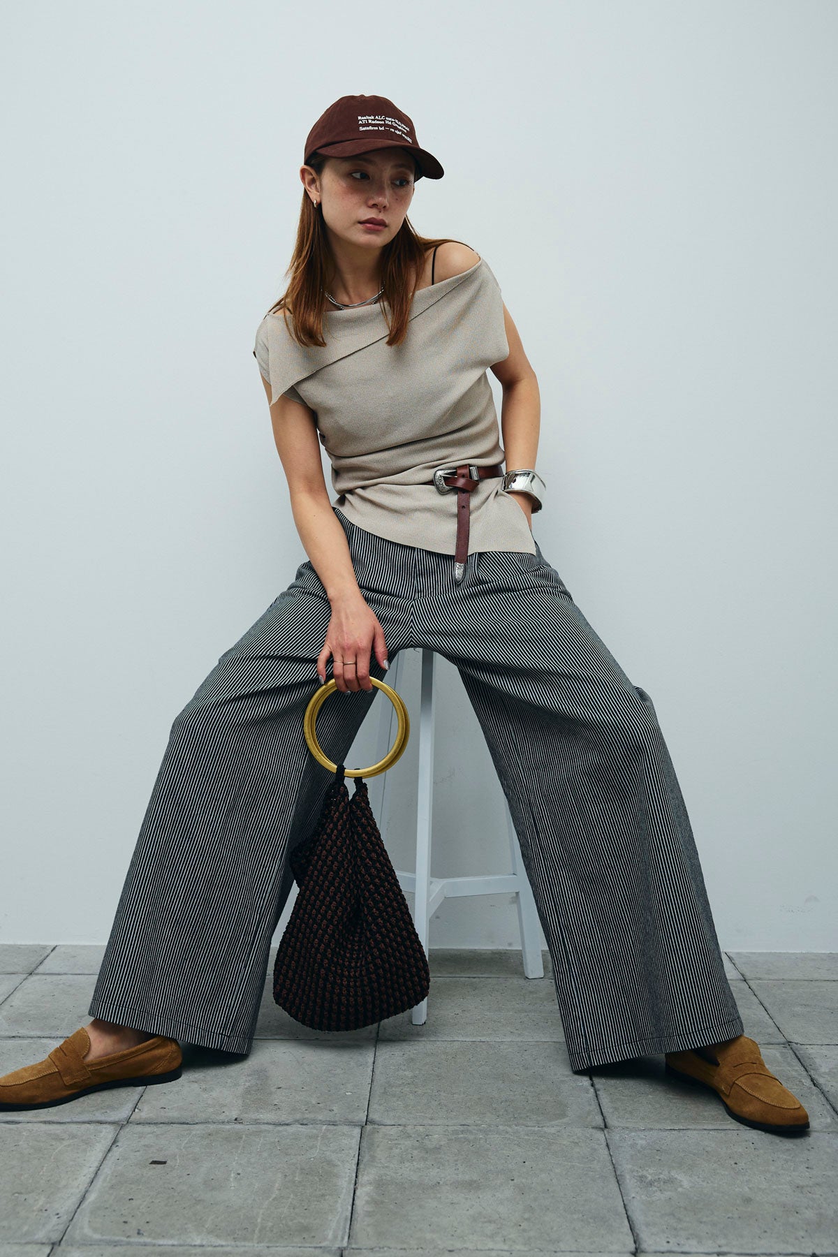 [予約/SET]アシンメトリーオフショルサマーニット+細ストライプワイドパンツ(2set)