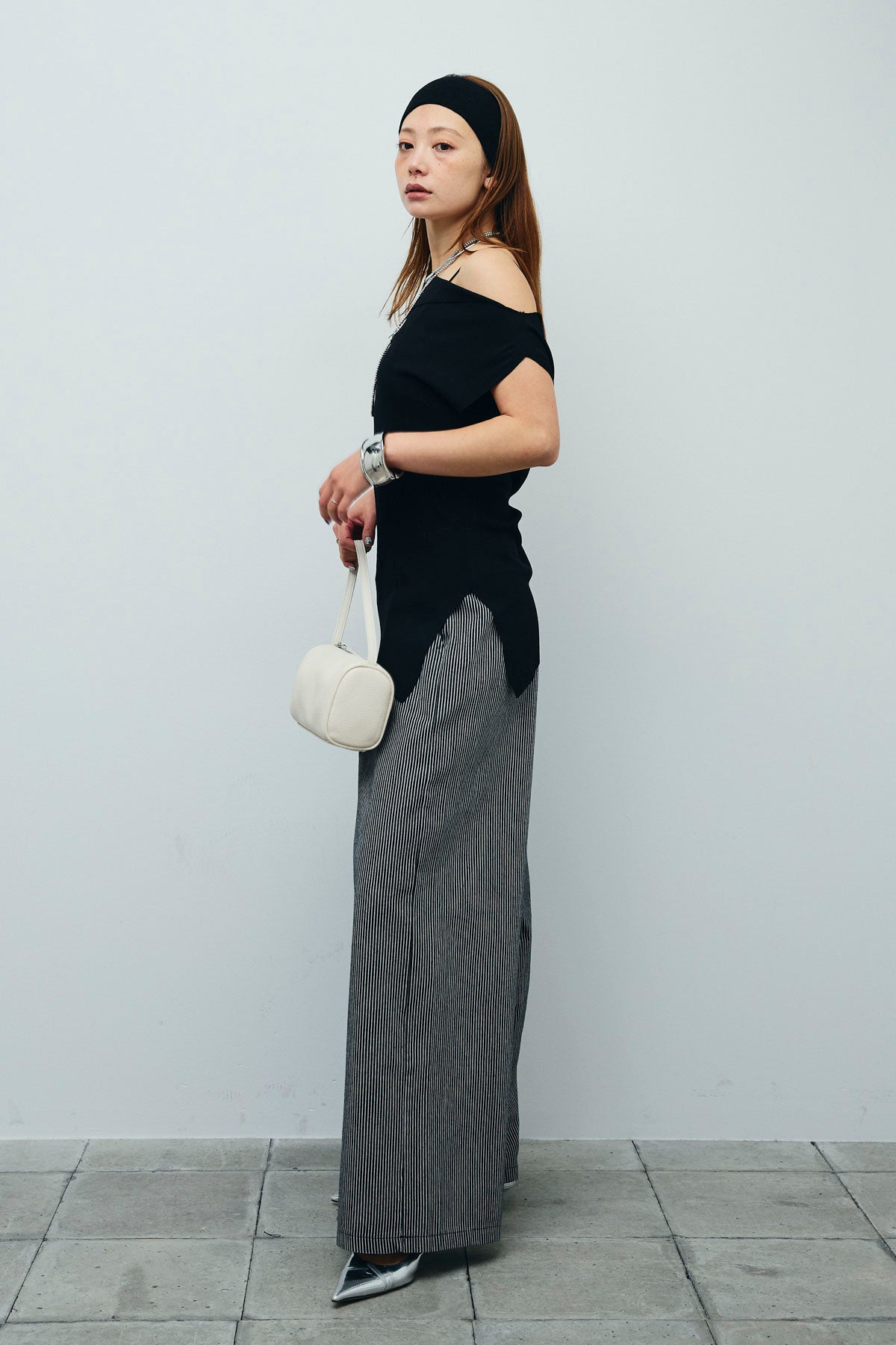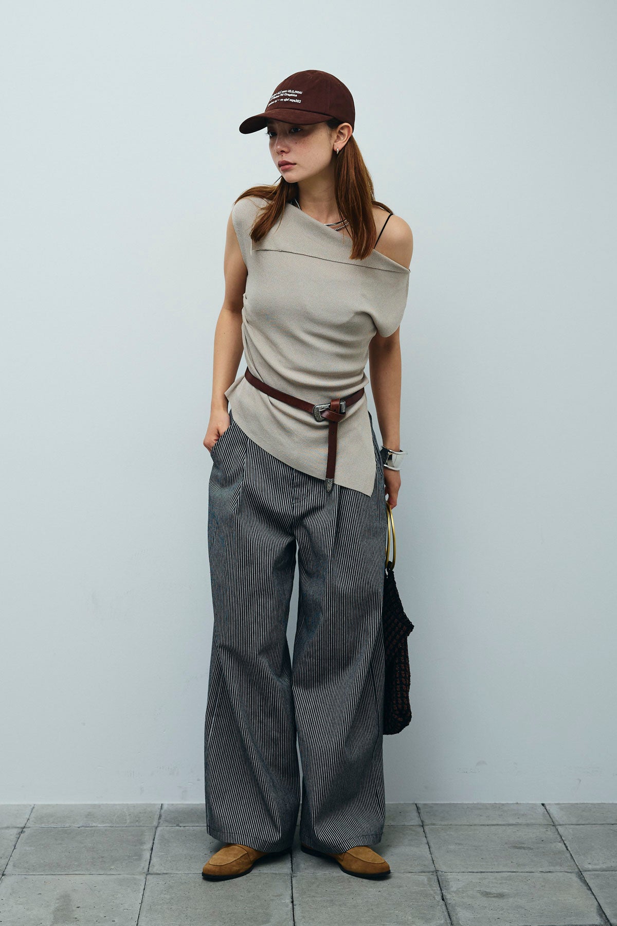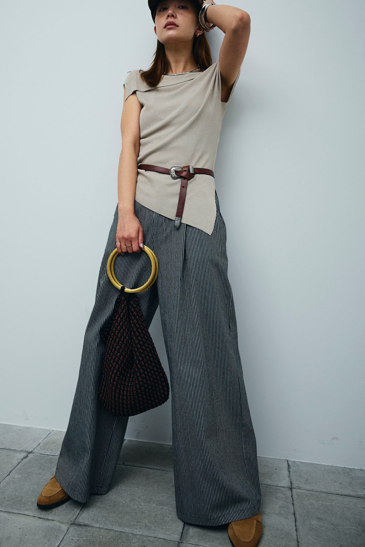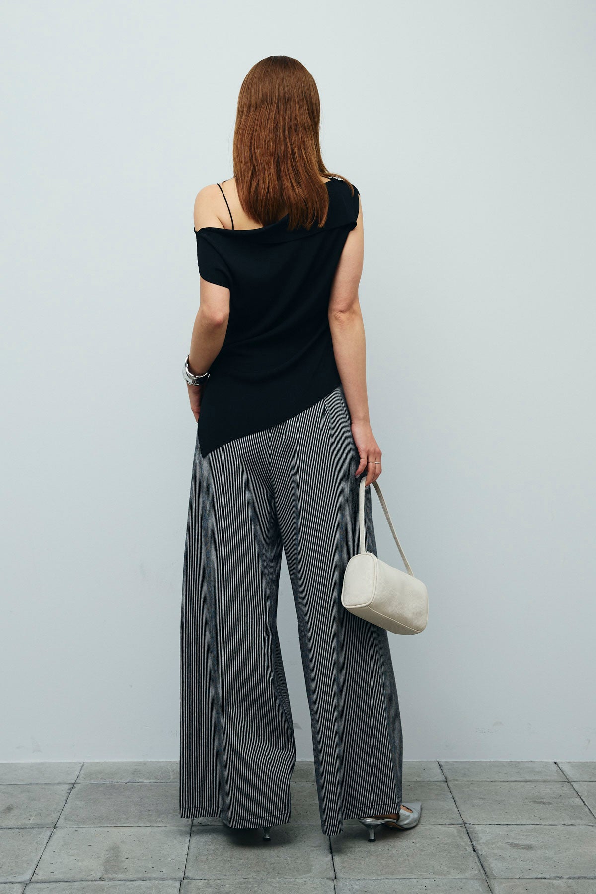 [予約/SET]アシンメトリーオフショルサマーニット+細ストライプワイドパンツ(2set)