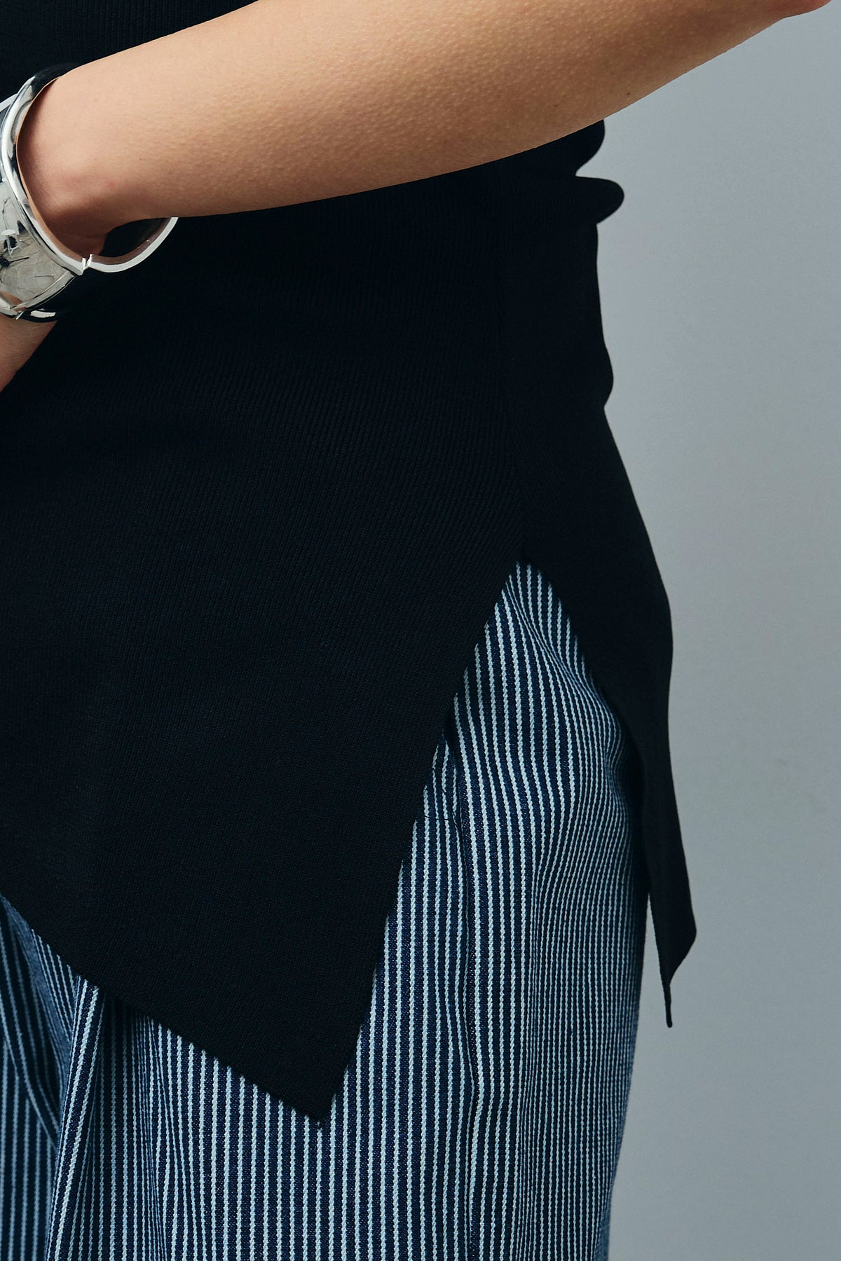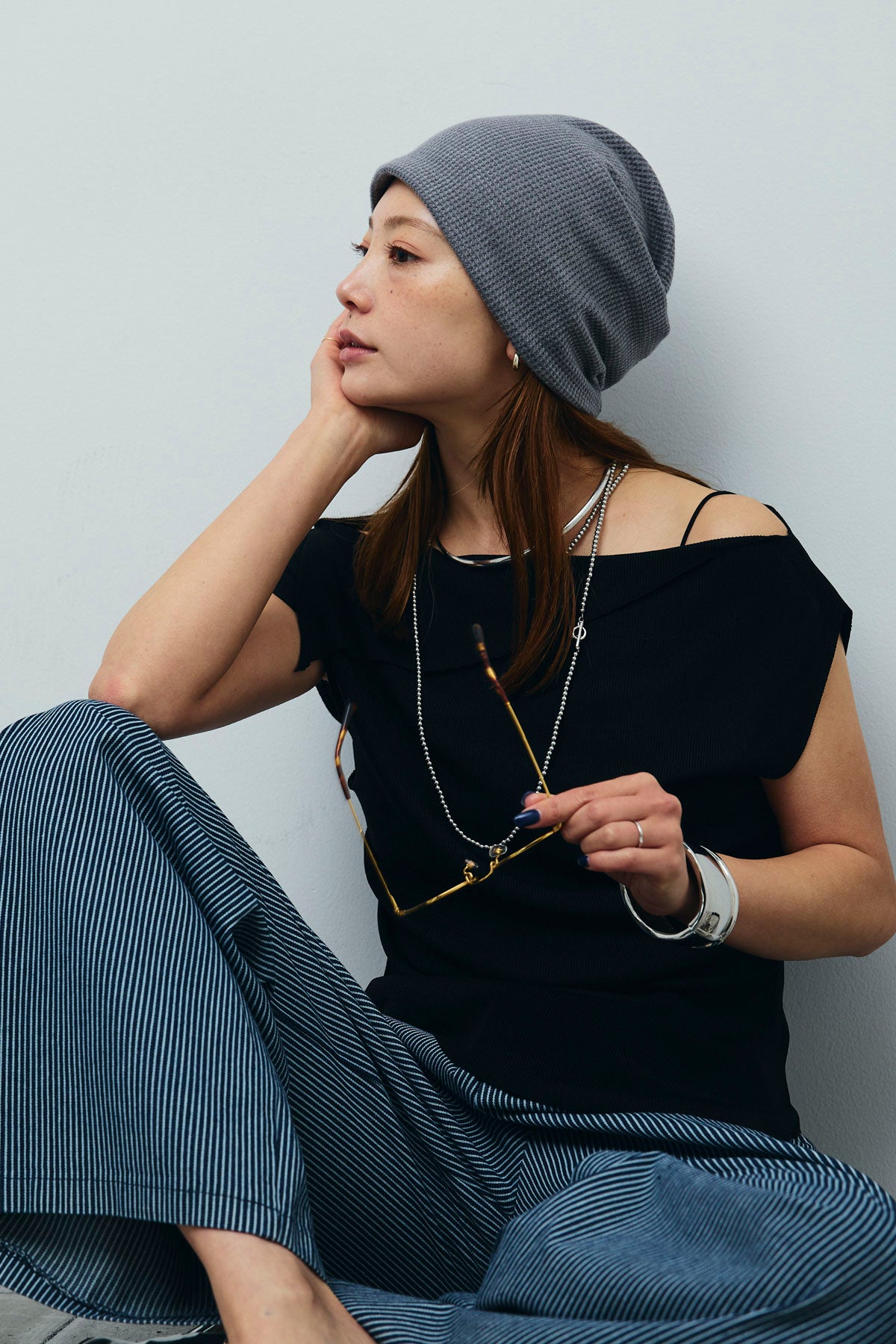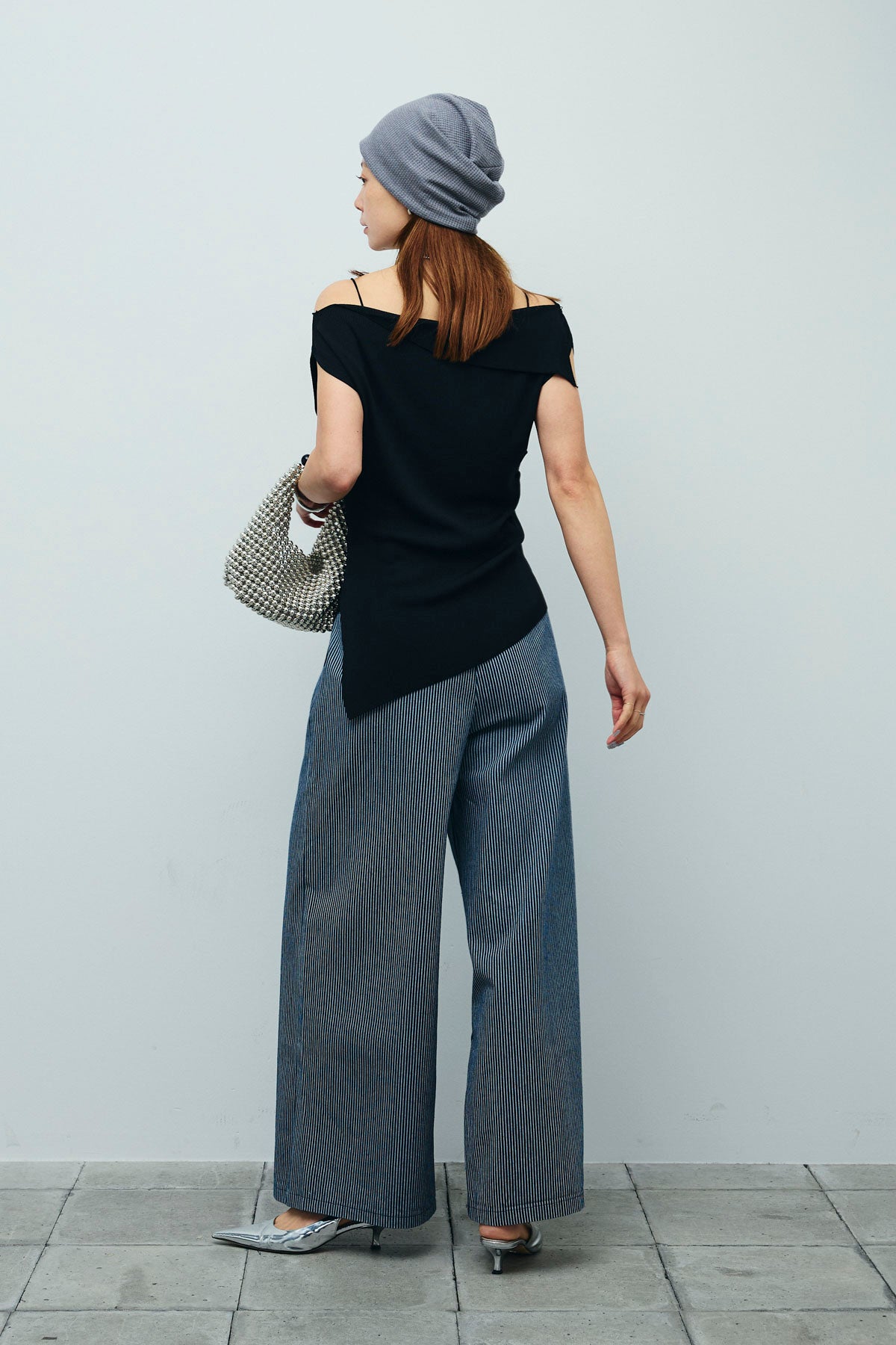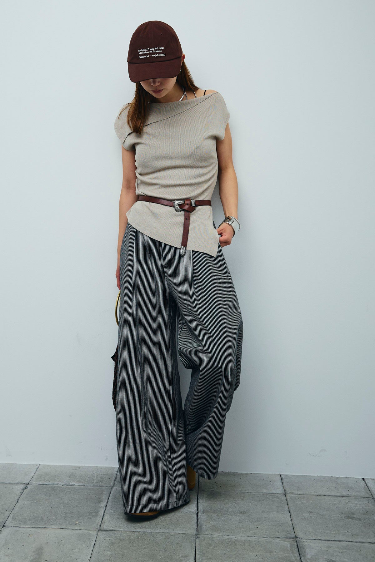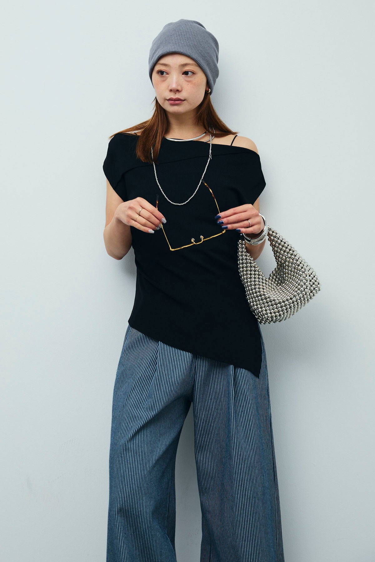 [予約/SET]アシンメトリーオフショルサマーニット+細ストライプワイドパンツ(2set)