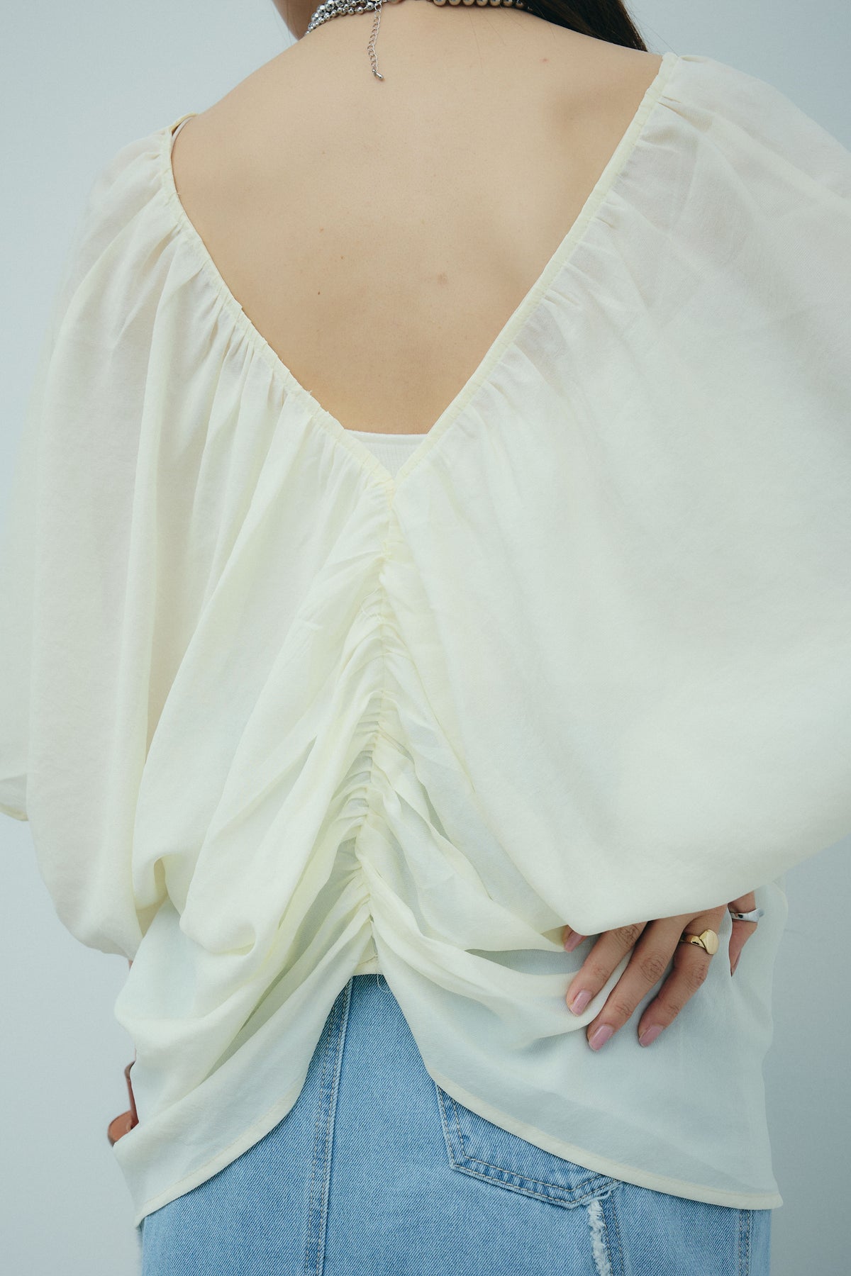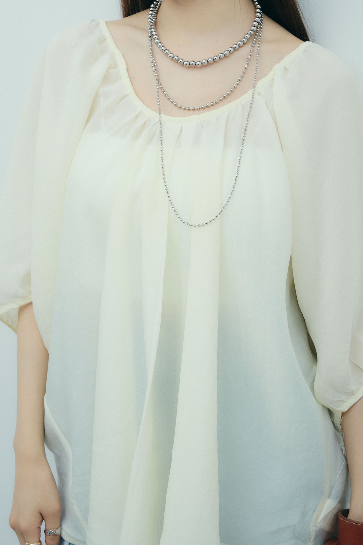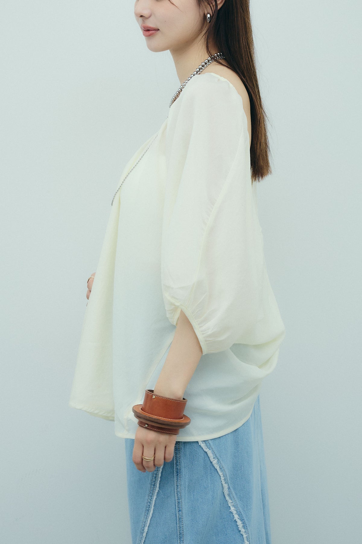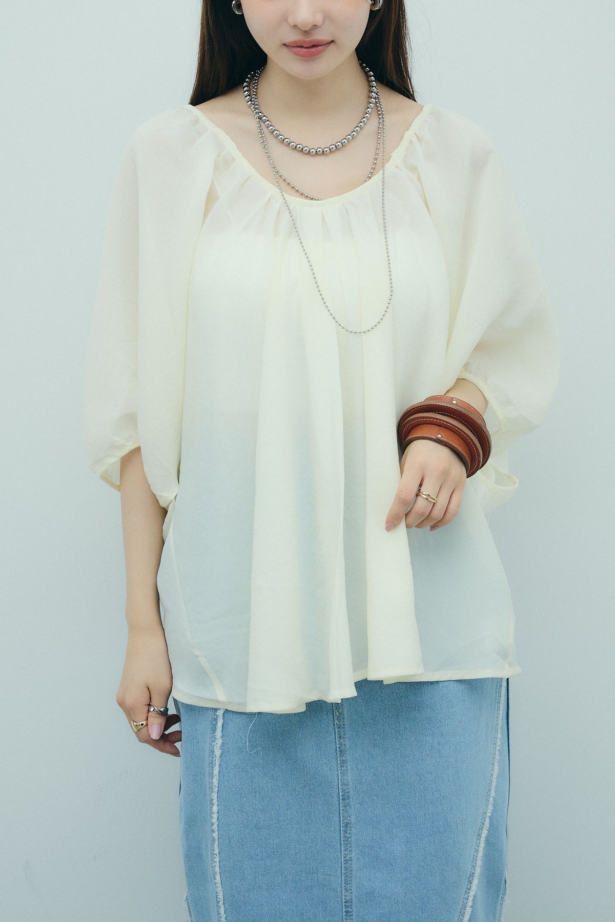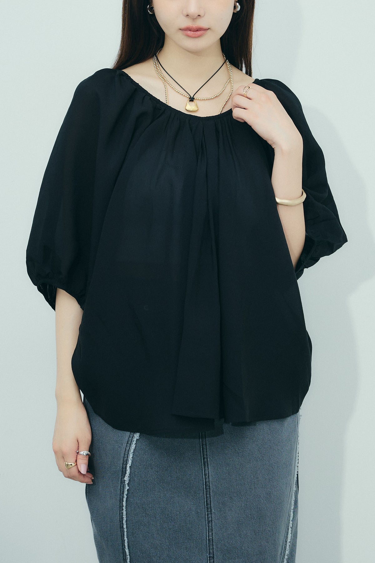 ふんわりとした袖のシルエットが印象的なシャーリングブラウス。軽やかな素材感と程よい透け感で、涼しげな印象に仕上げました。シンプルながらも存在感のあるデザインが、着こなしに上品な抜け感を添えます。
