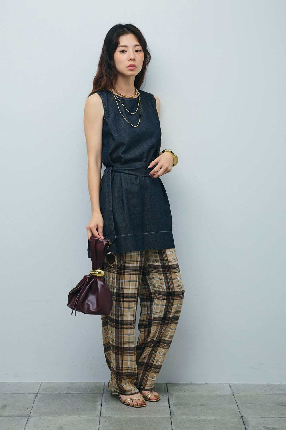 [予約/SET]ベルト付きミドル丈ブラウス+シアータータンチェックワイドパンツ(2set)