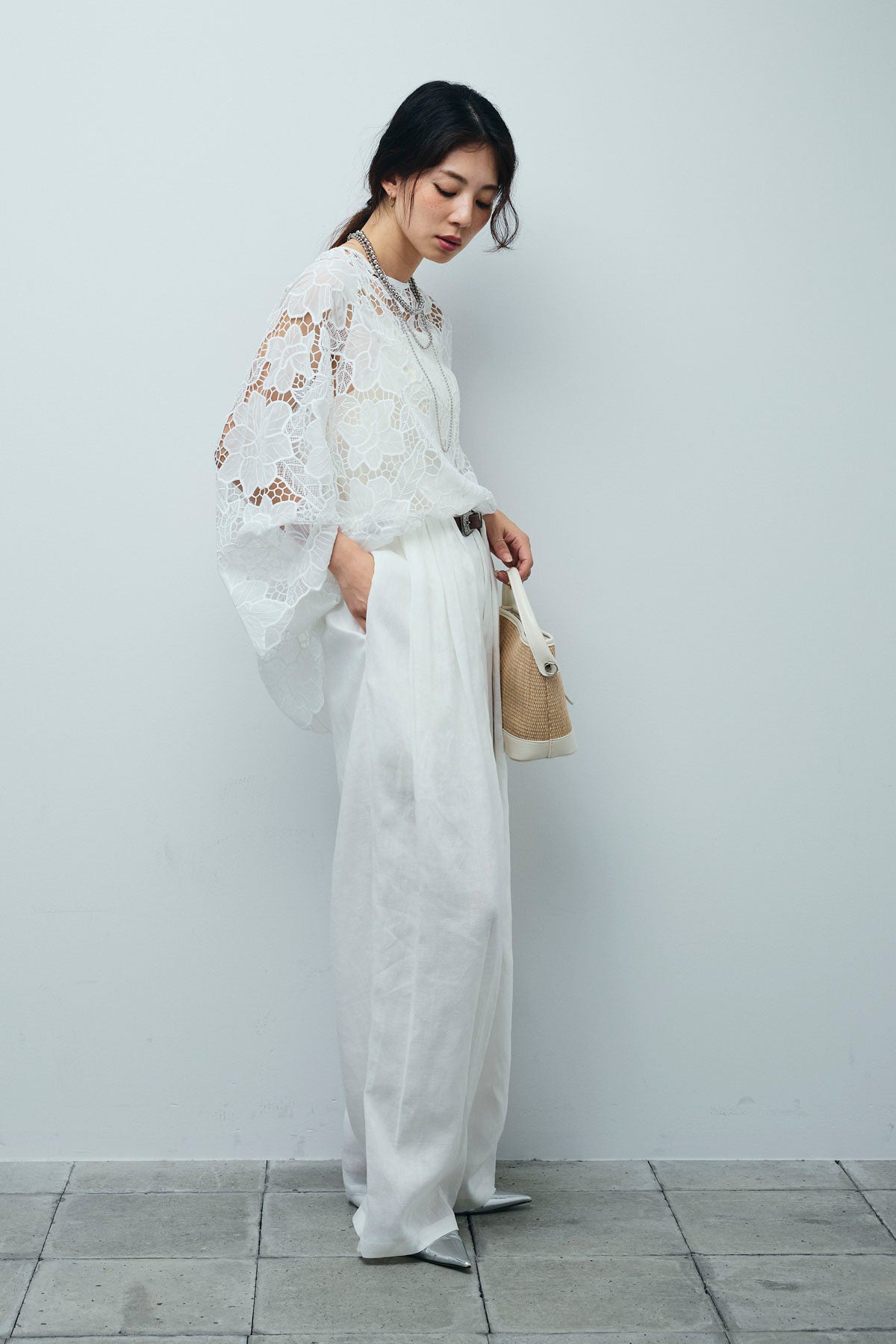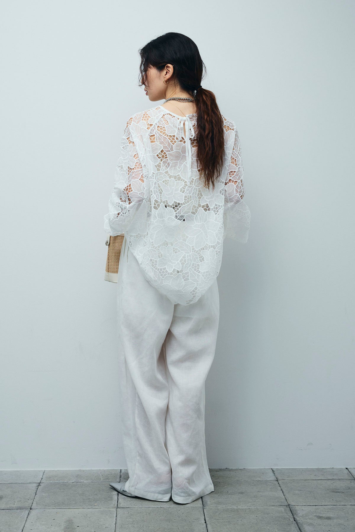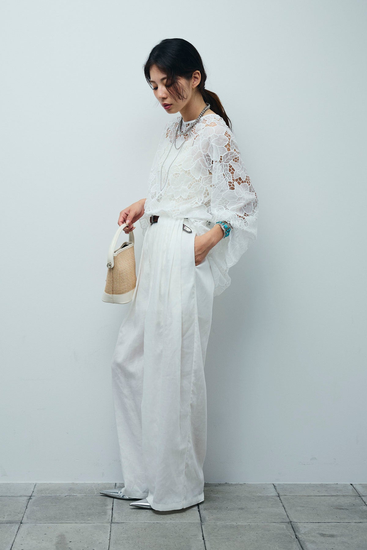 [予約/SET]フラワー刺繍レースフレアブラウス+リネンミックスウエストデザインワイドパンツ(2set)