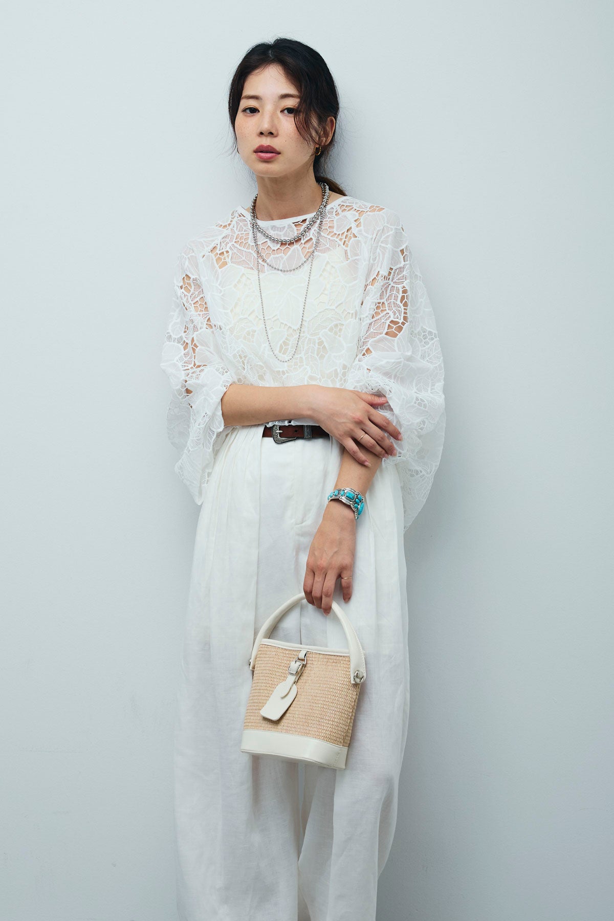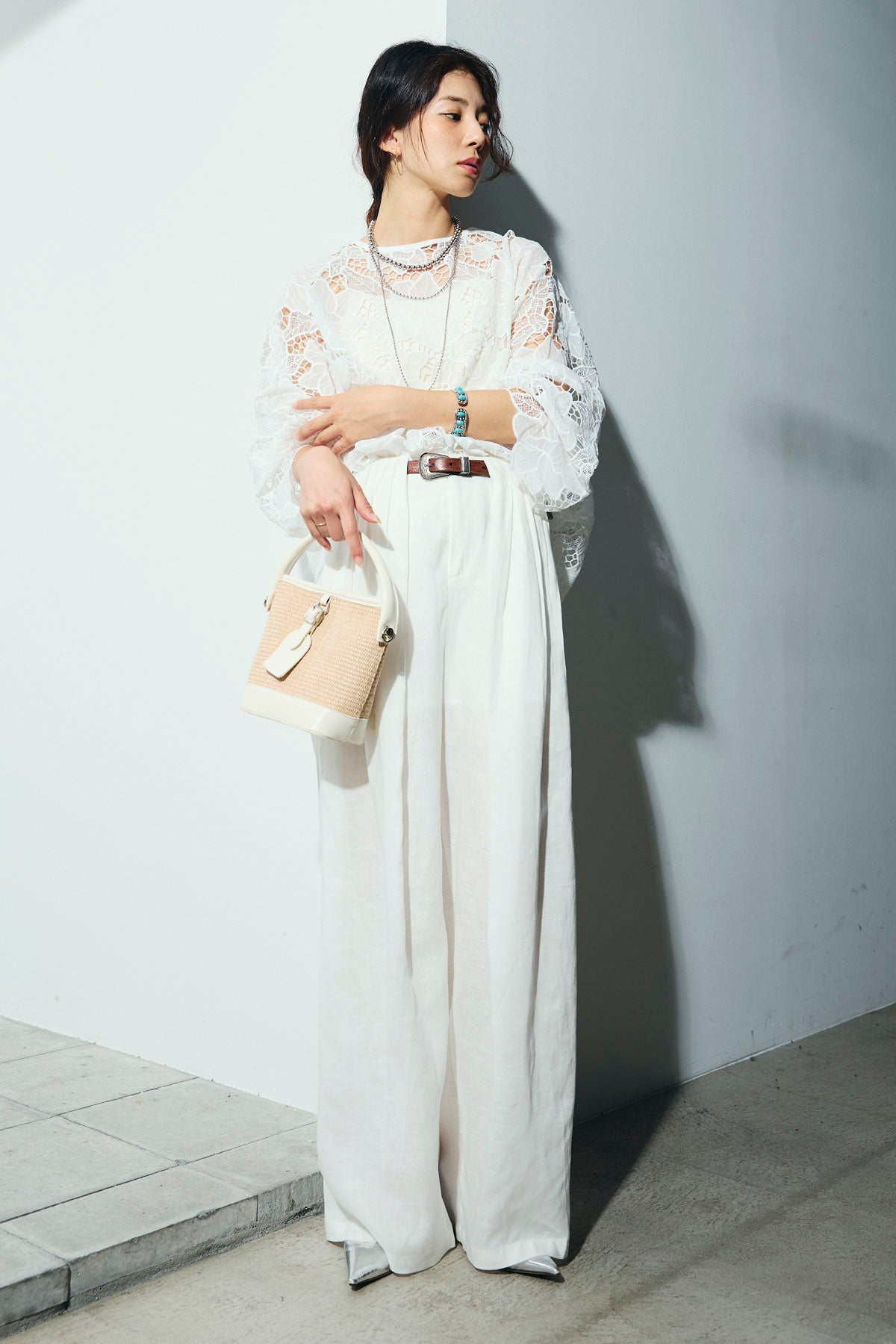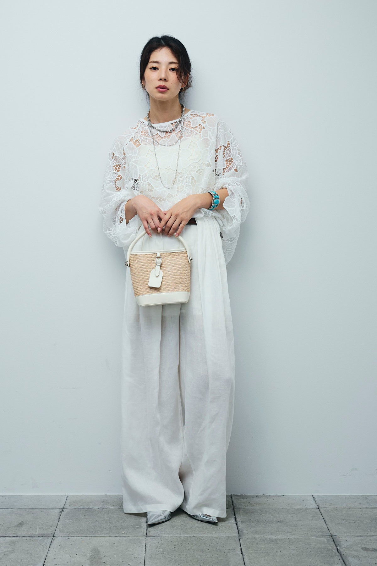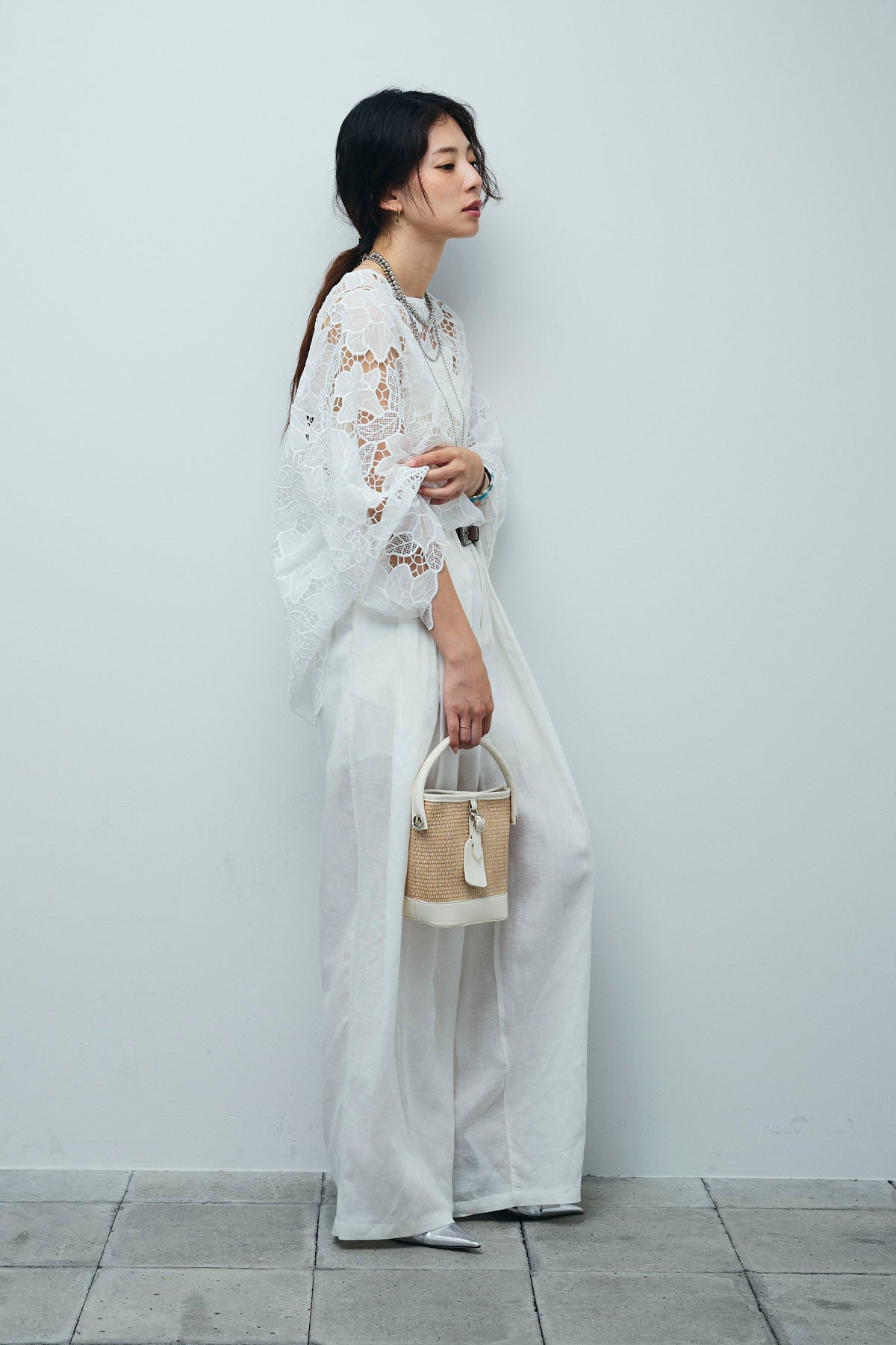 [予約/SET]フラワー刺繍レースフレアブラウス+リネンミックスウエストデザインワイドパンツ(2set)