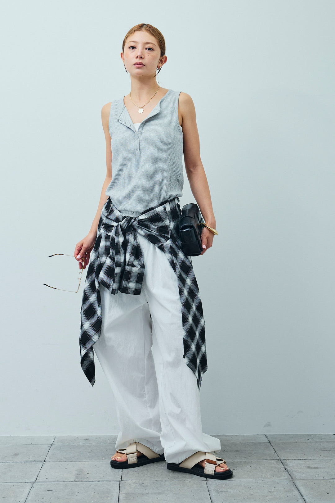 [予約/SET]セルフカットリブヘンリーネックノースリーブトップス+オンブレチェックオーバーとろみシャツ+裾ドロストナイロンパンツ(3set)