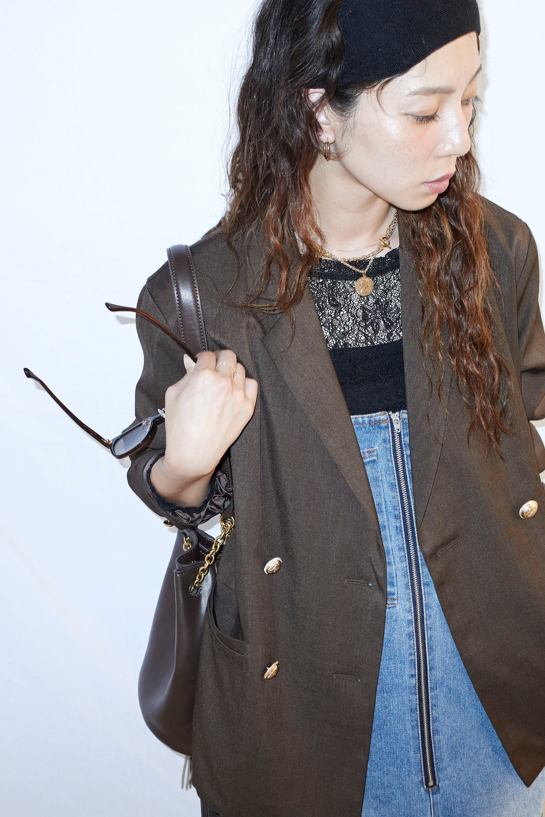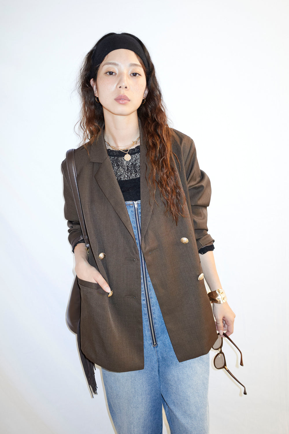 [予約/SET]TRツイルダブルテーラードジャケット+シアーレーストップス+フロントジップストラップデザインデニムサロペット(3set)