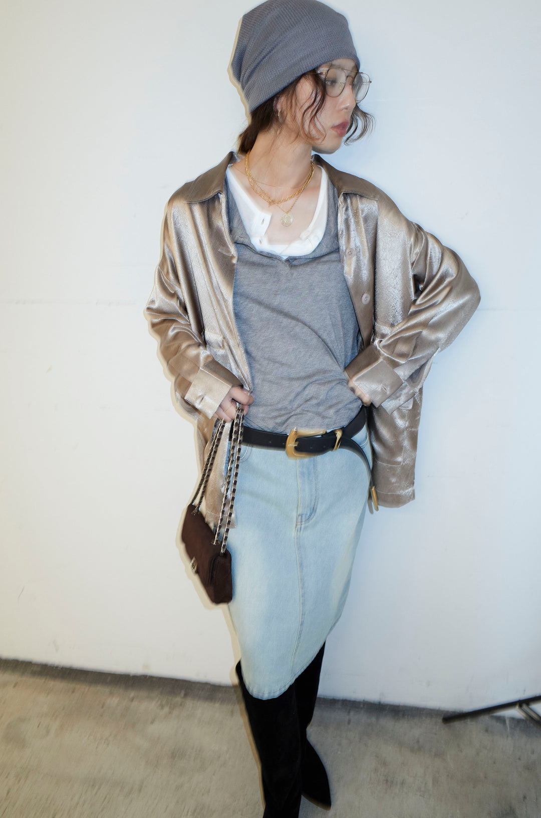 [予約/SET]サテンミリタリーシャツJK+レイヤードヘンリーネックプルオーバー+ボックスデニム膝丈SK(3set)