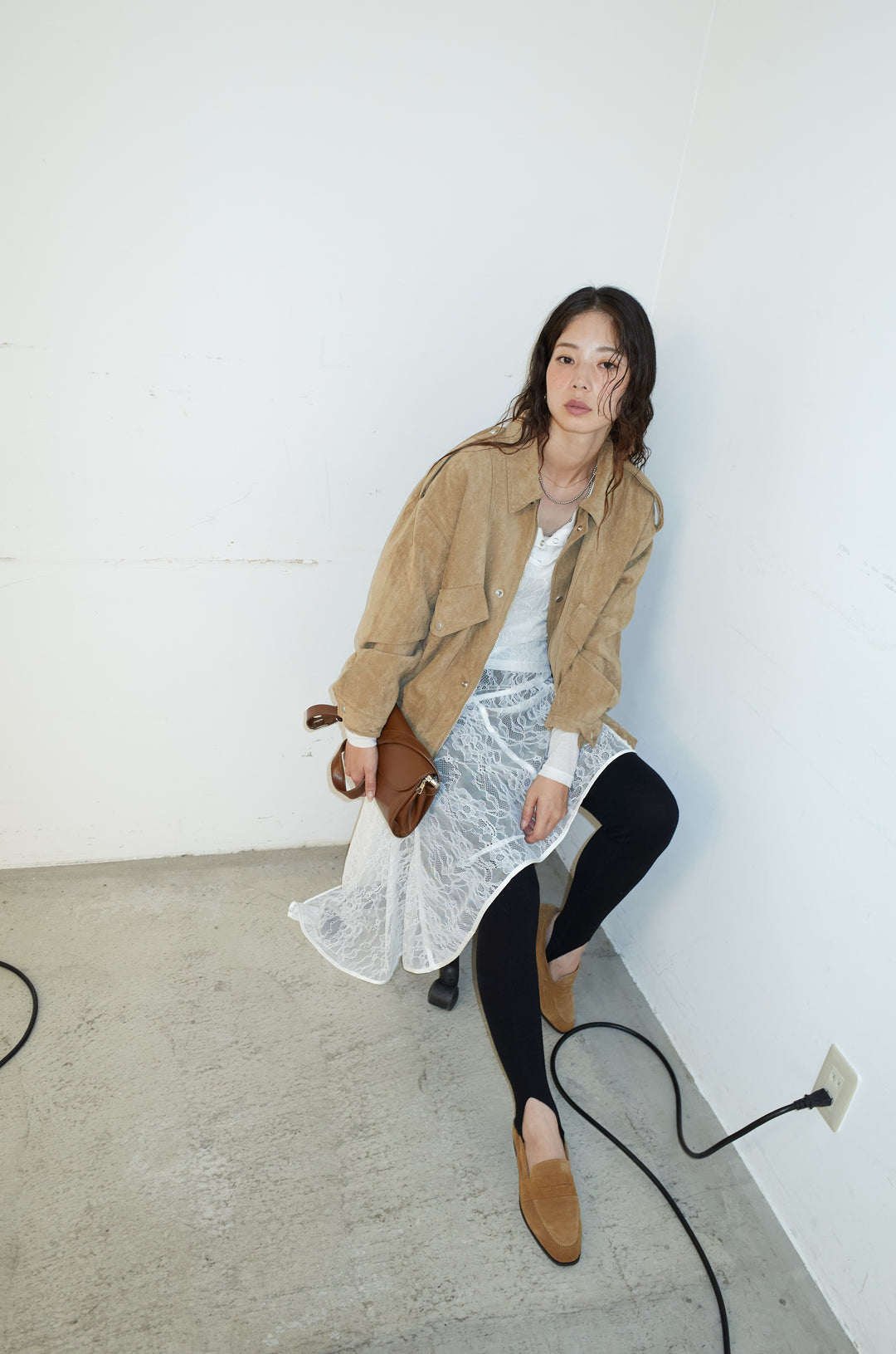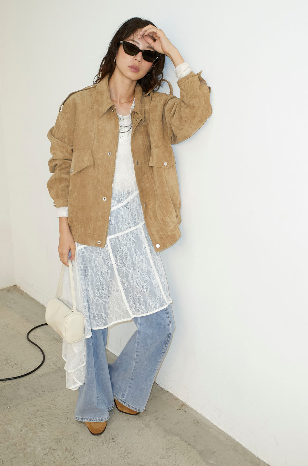 [予約/SET]エポーレット付きスウェードライクブルゾン+レースアシメトリーワンピース(2set)
