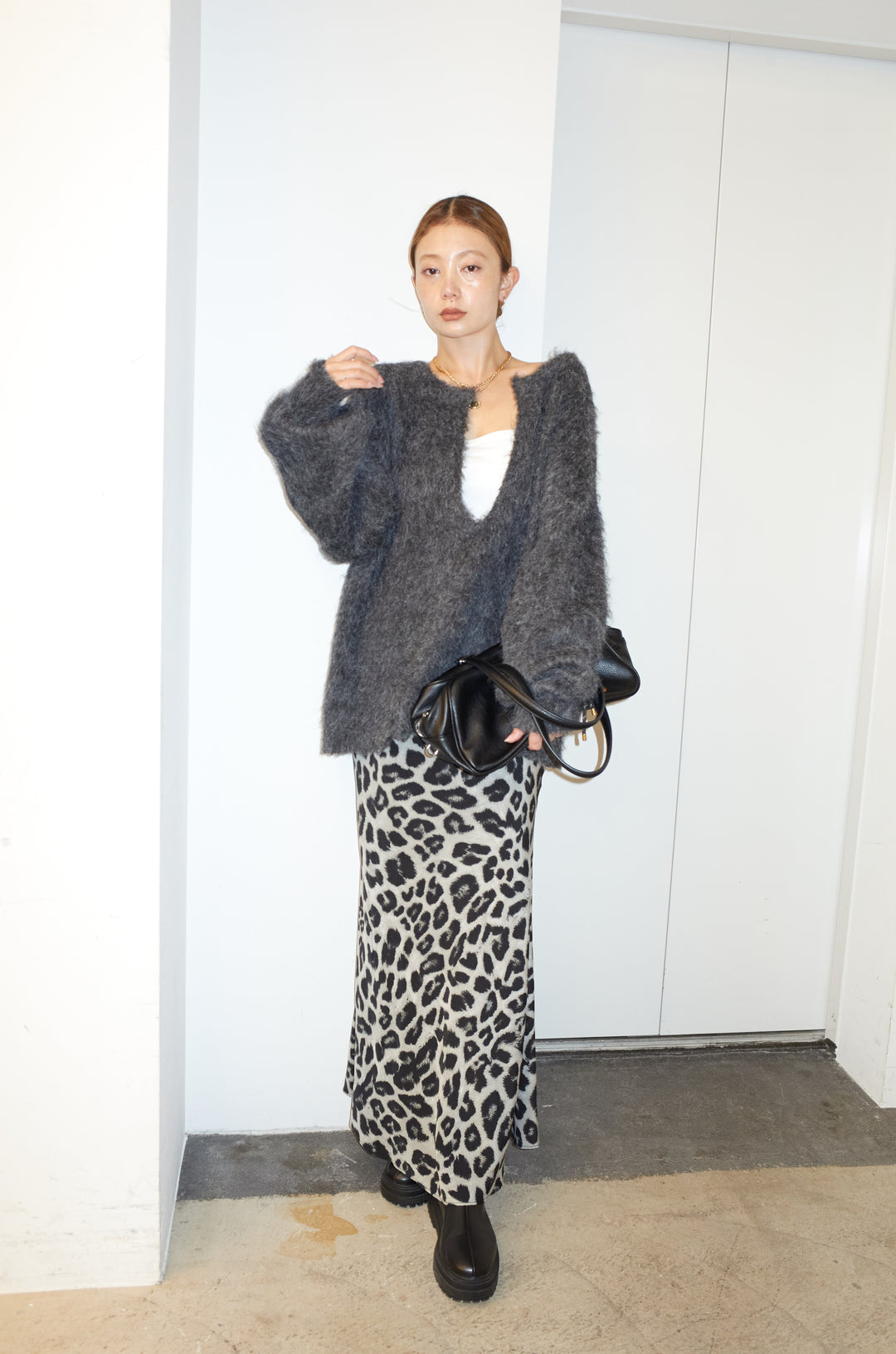 [予約/SET]ミックスシャギー深Vニット+レオパードナロースカート(2set)