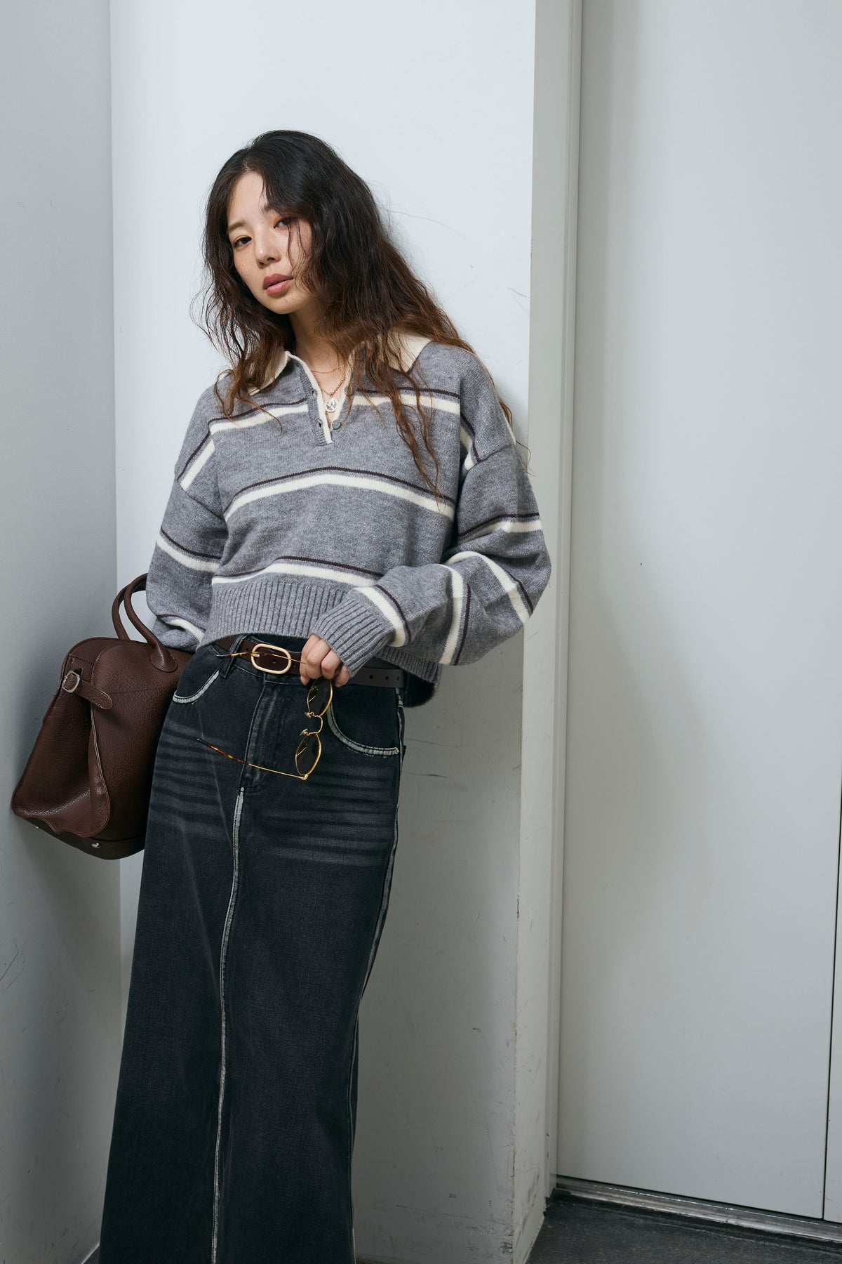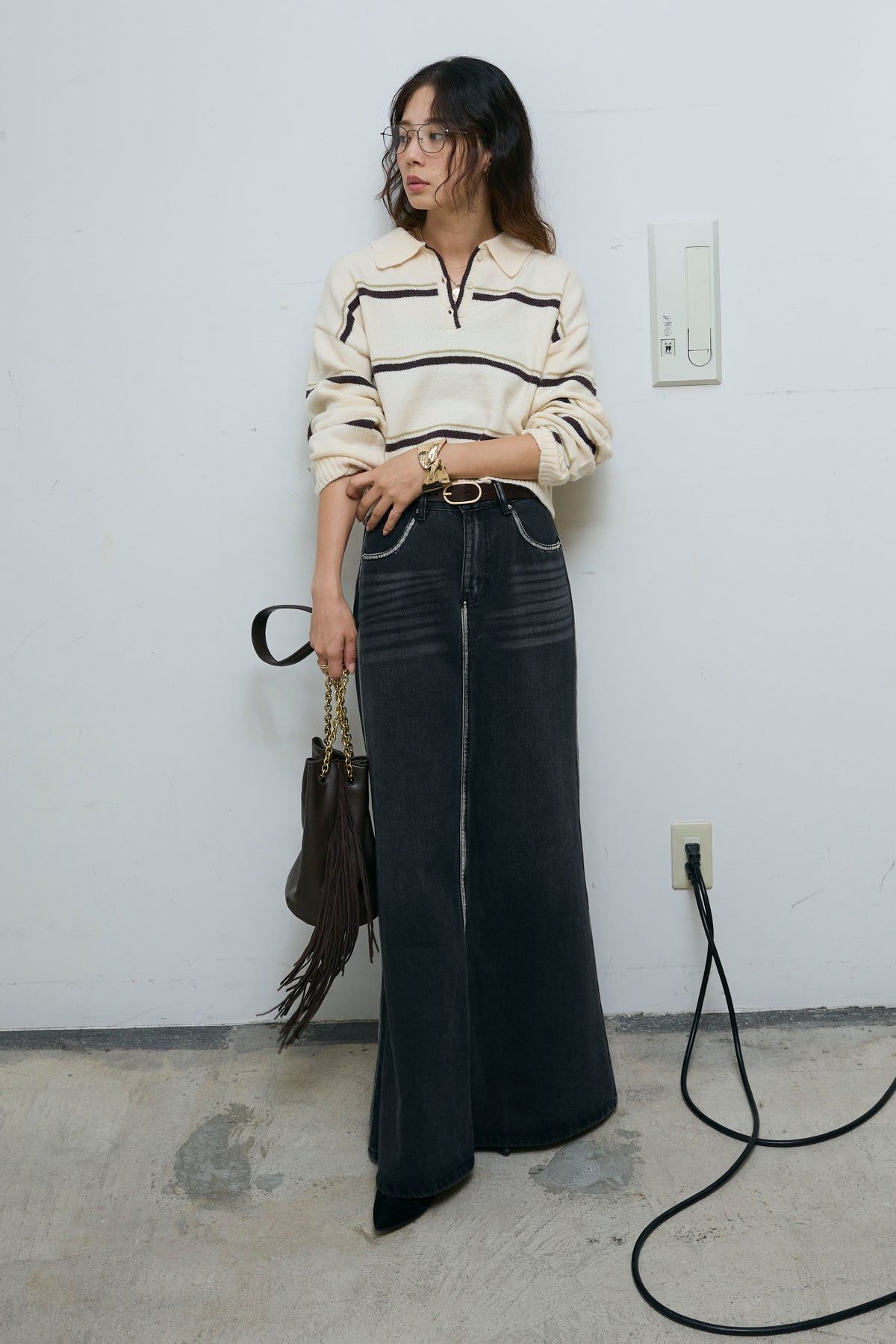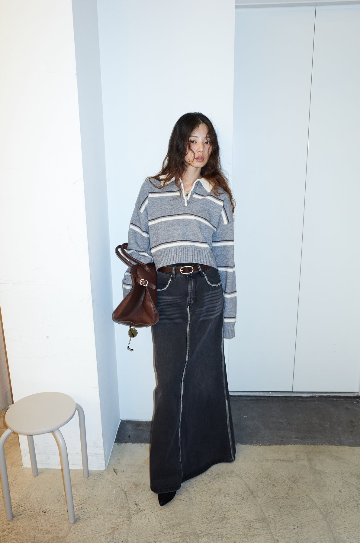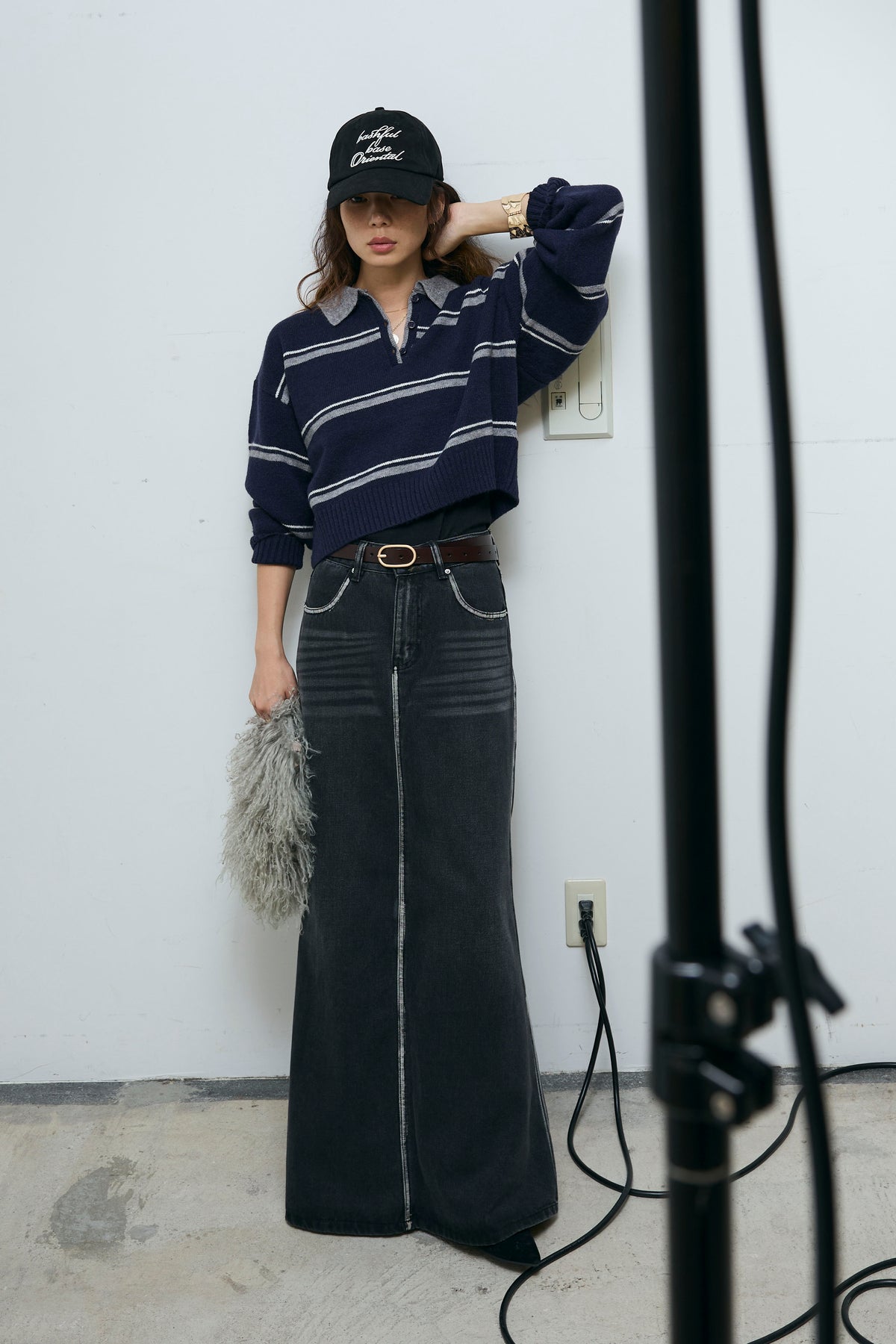 [予約/SET]ボーダーポロニット+ベルト付きデニムロングスカート(2set)