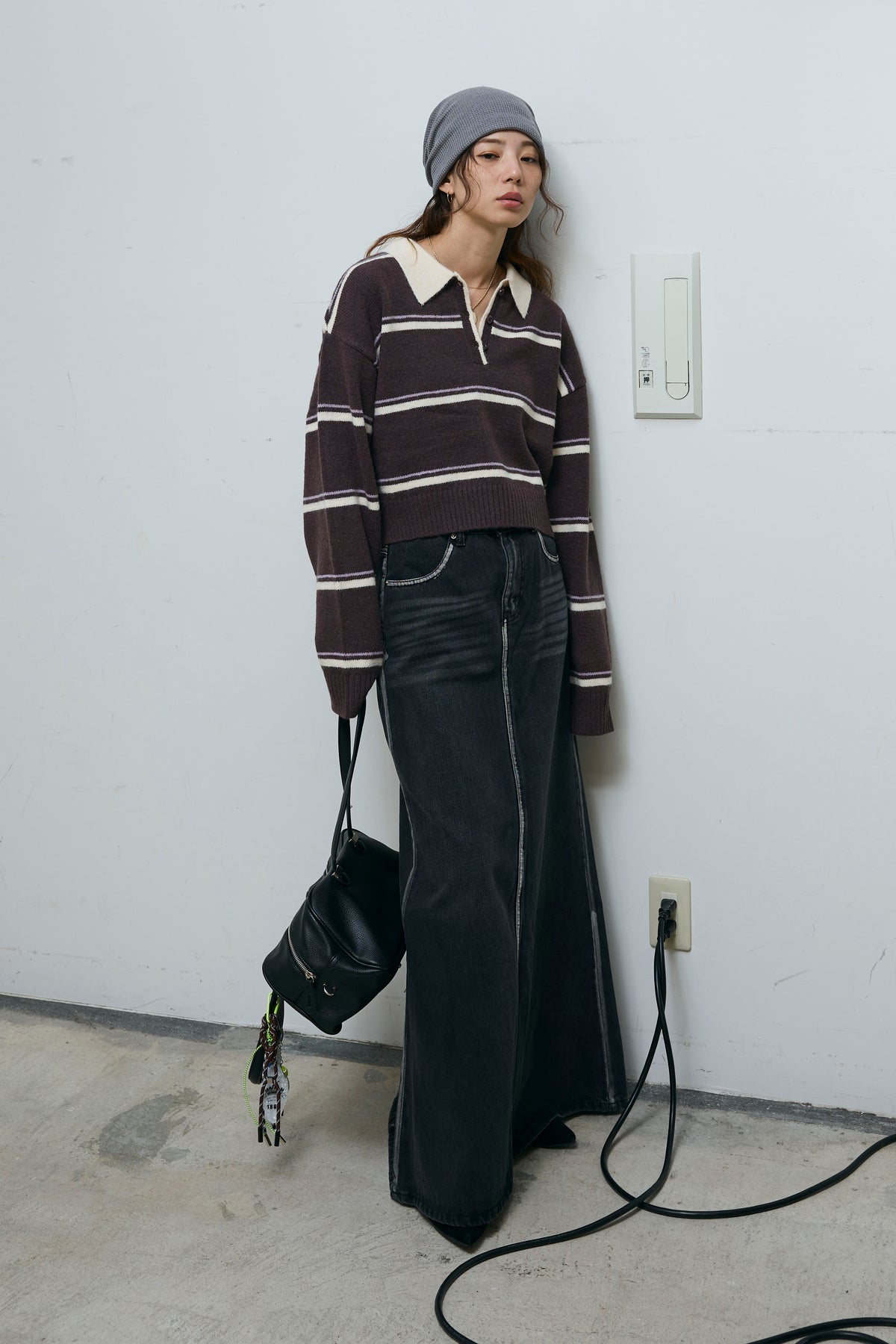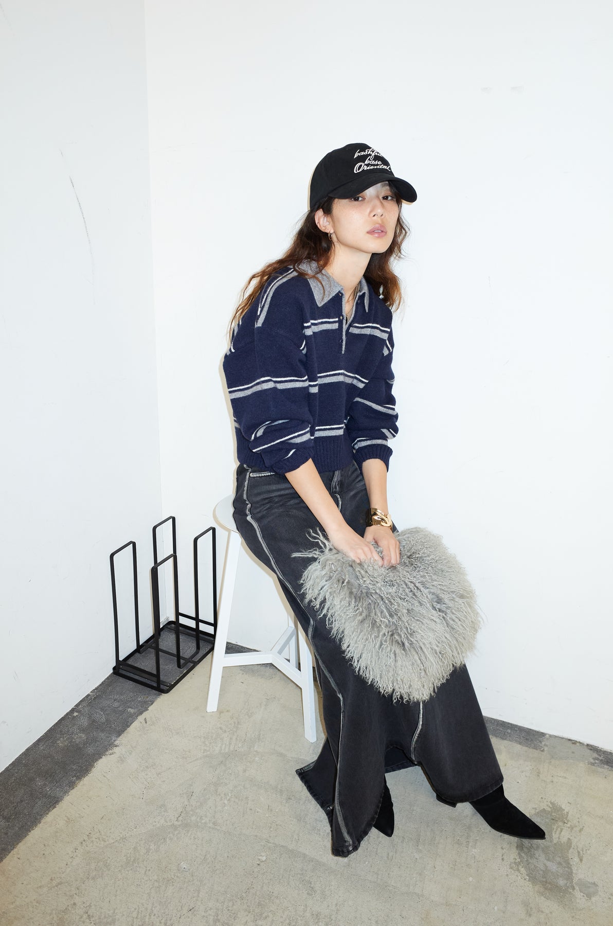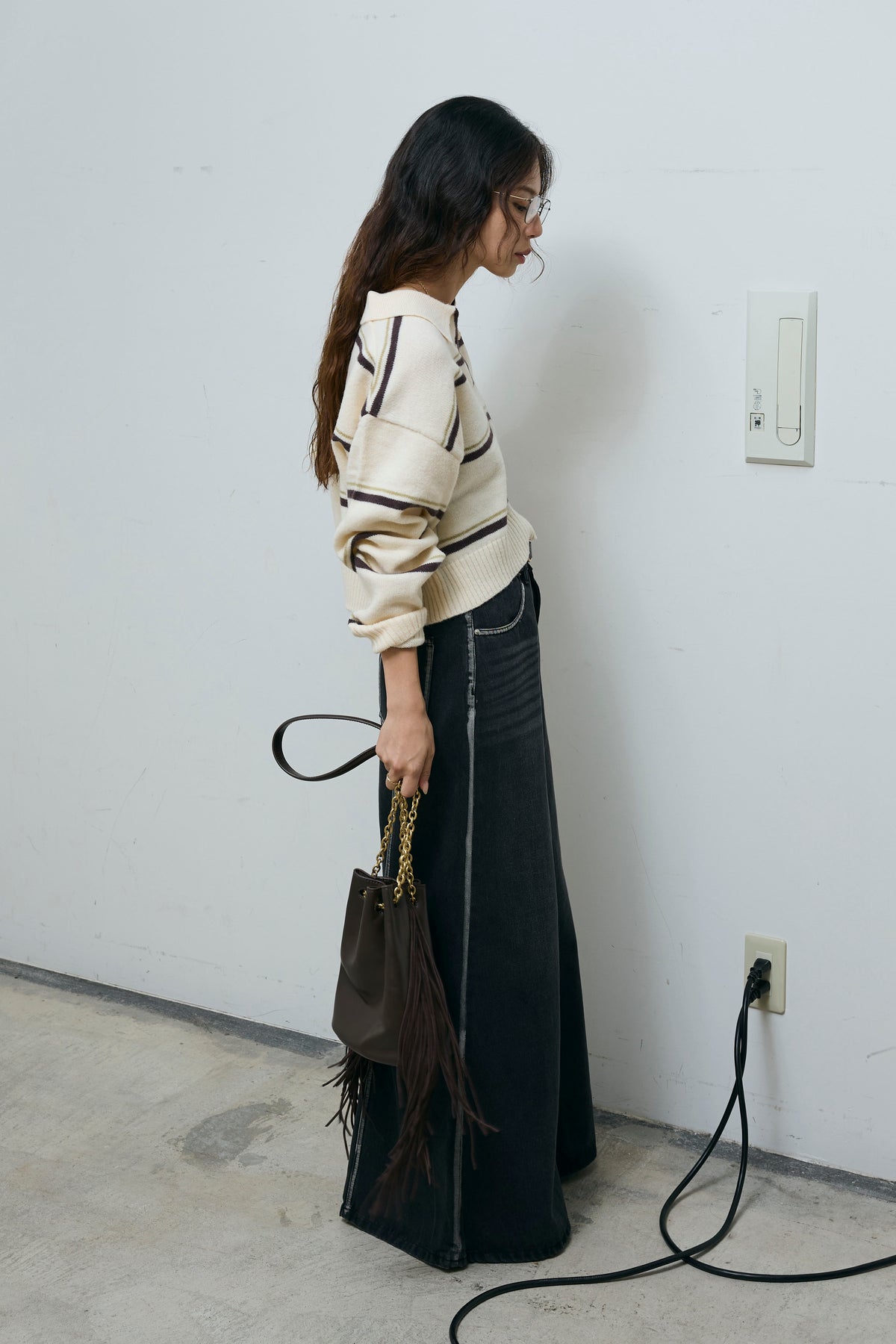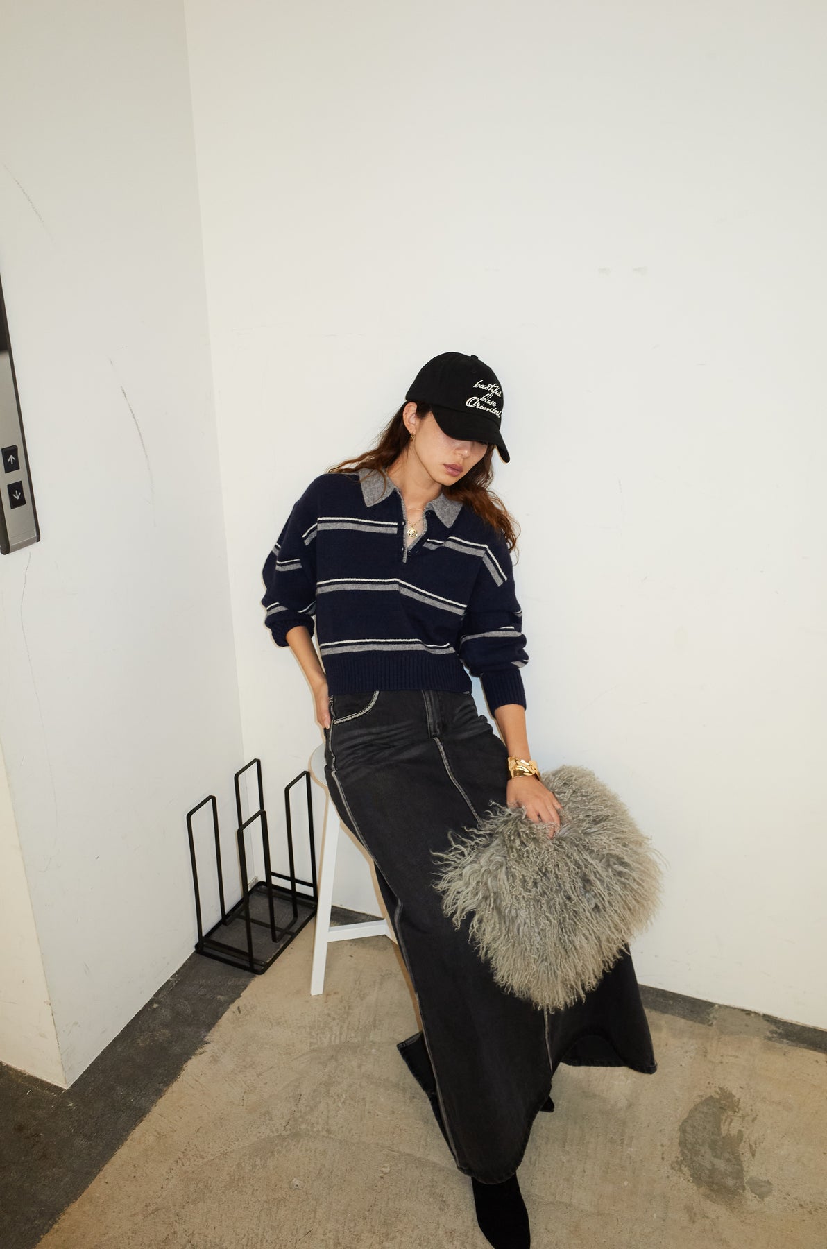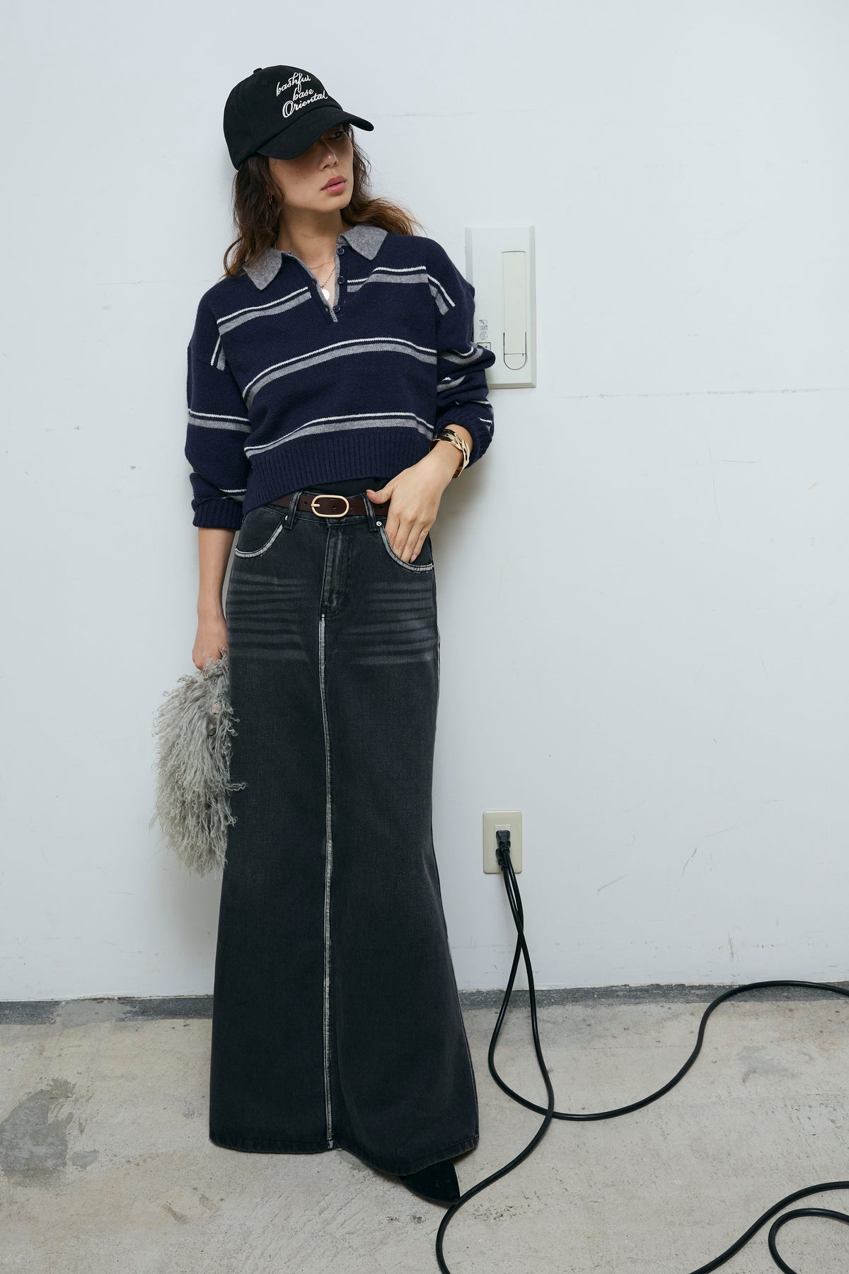 [予約/SET]ボーダーポロニット+ベルト付きデニムロングスカート(2set)