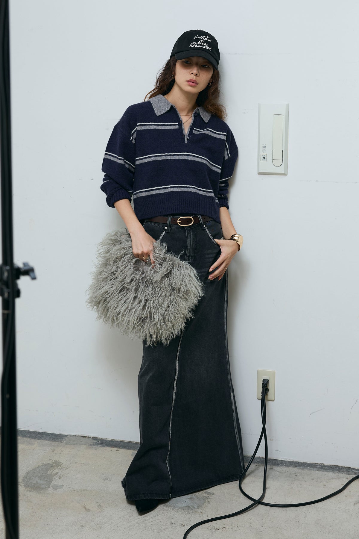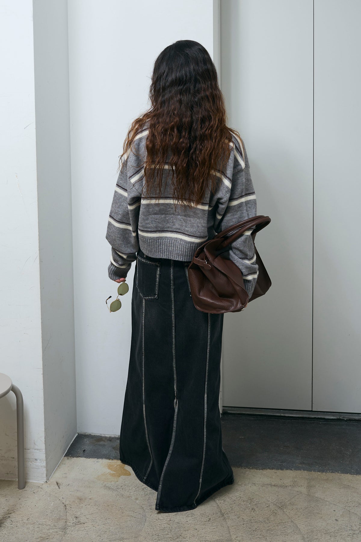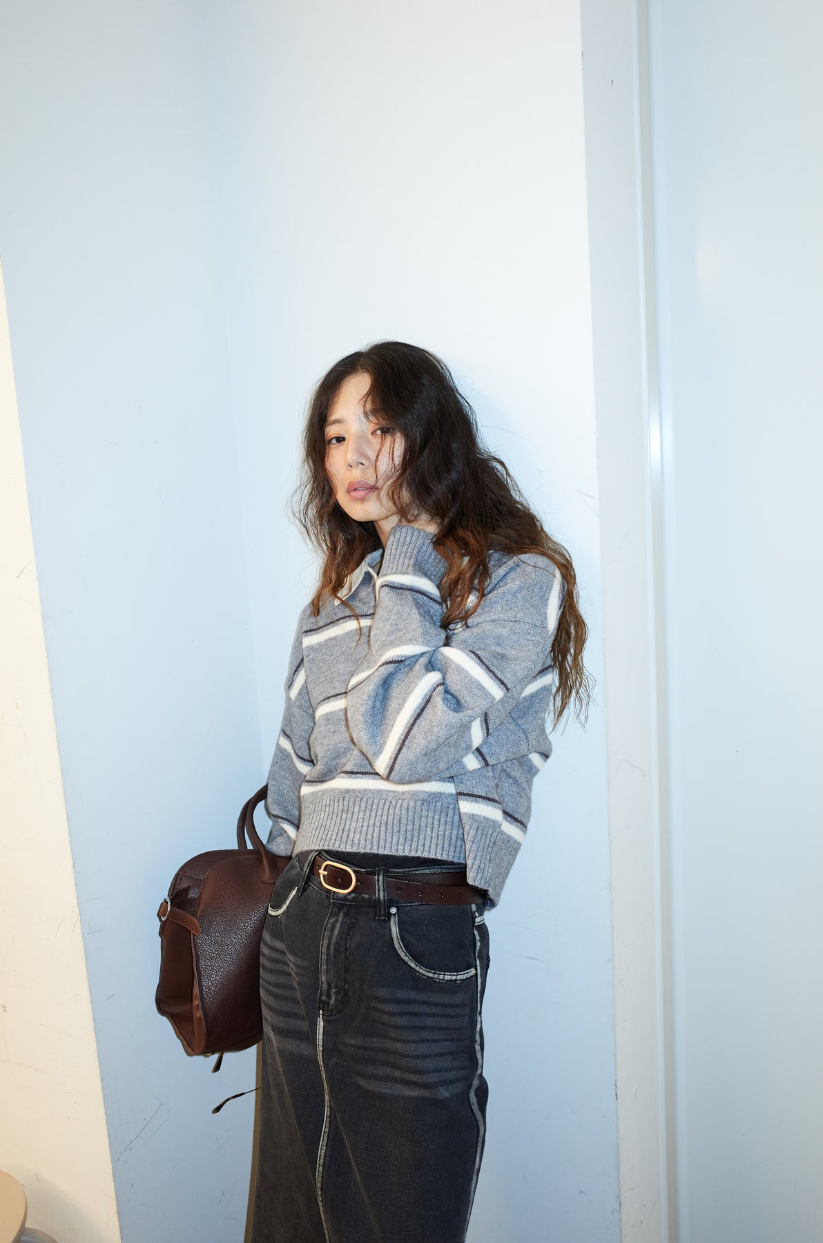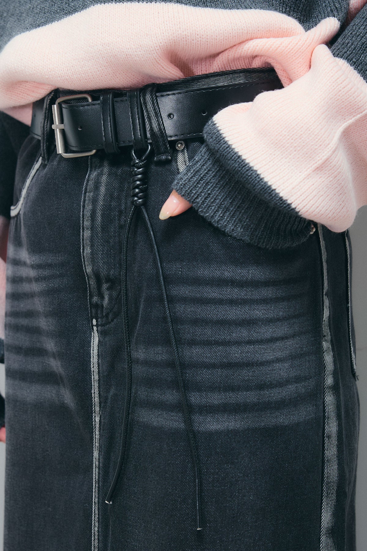 [予約/SET]ボーダーポロニット+ベルト付きデニムロングスカート(2set)