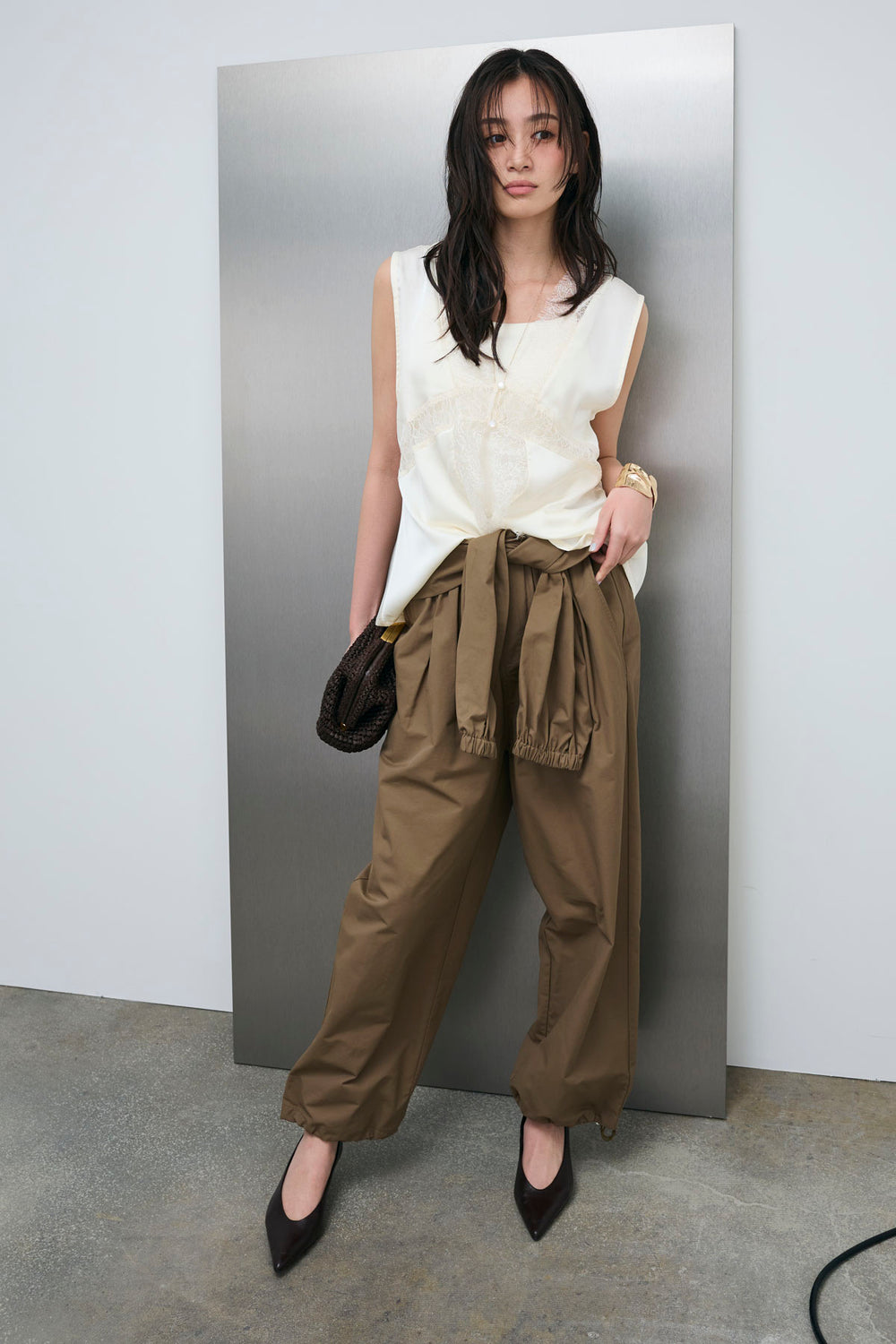 [予約/SET]レース切り替えサテンブラウス+合繊ツイルスタンドウエストラップジョガーPT(2set)