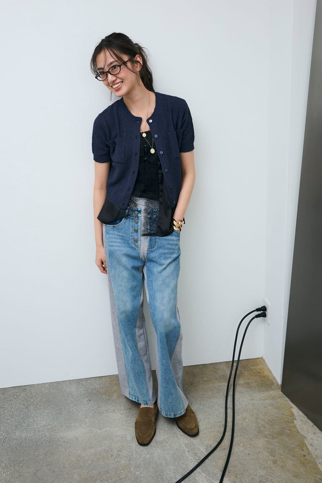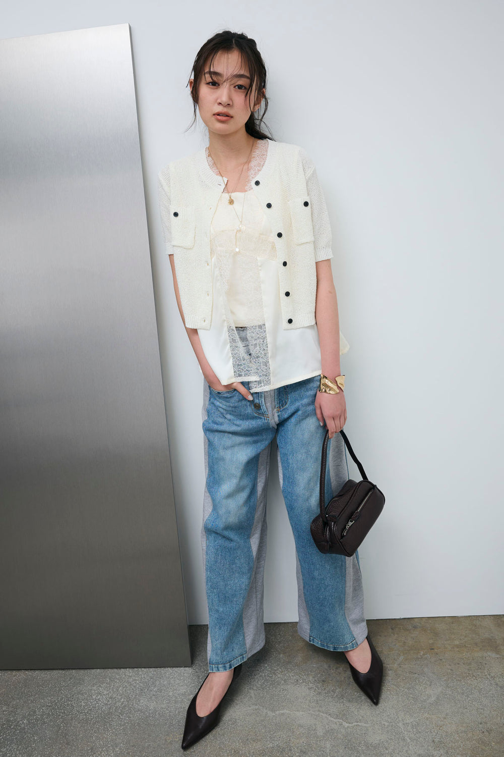 [予約/SET]フロントポケットハーフスリーブカーディガン+レース切り替えサテンブラウス+スウェット切り替えデニムパンツ(3set)