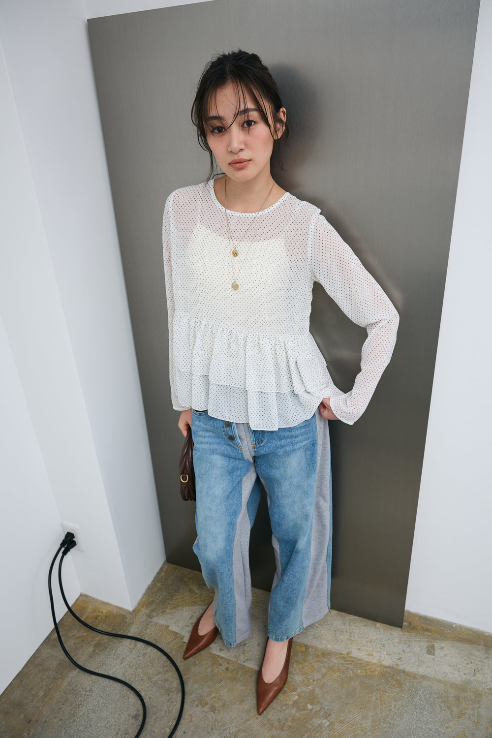 [予約/SET]シアードットブラウス+スウェット切り替えデニムパンツ(2set)