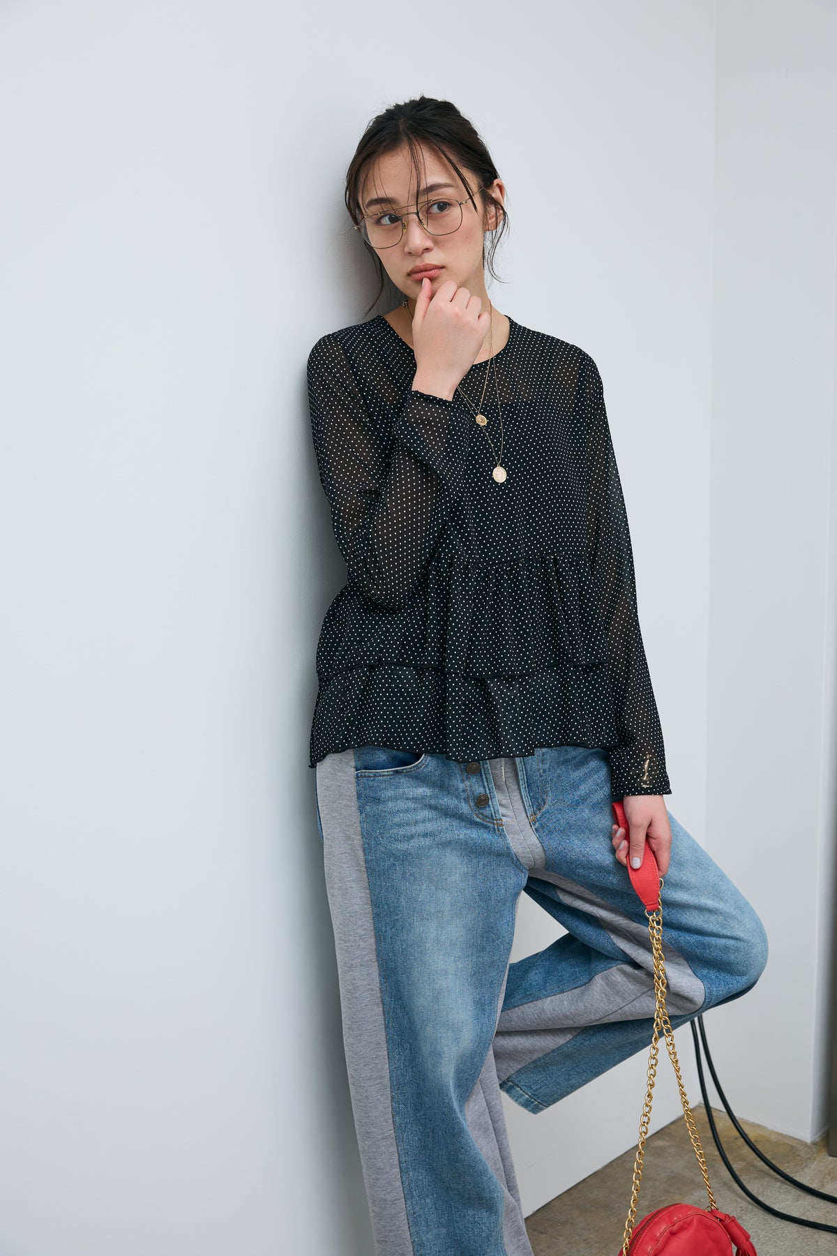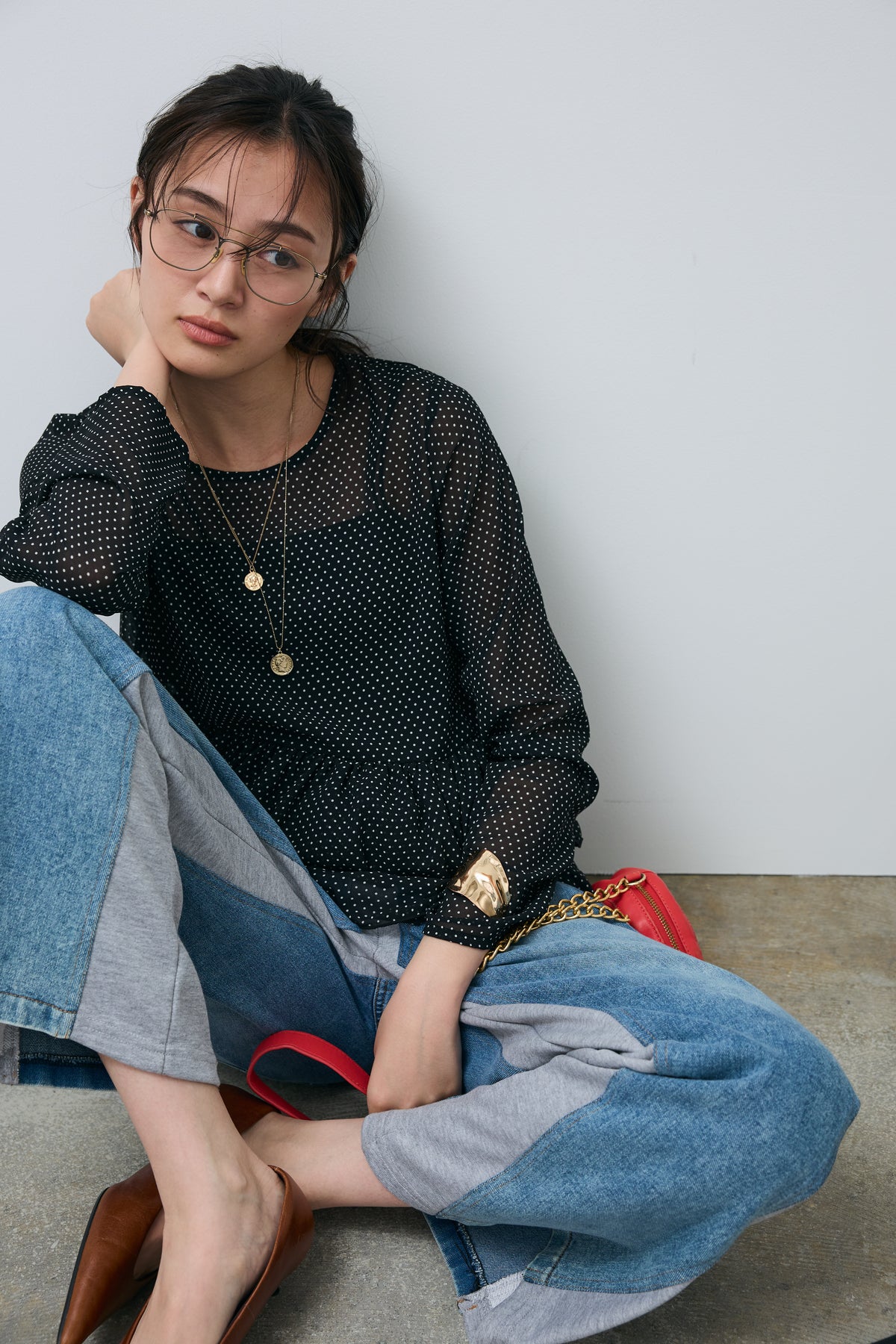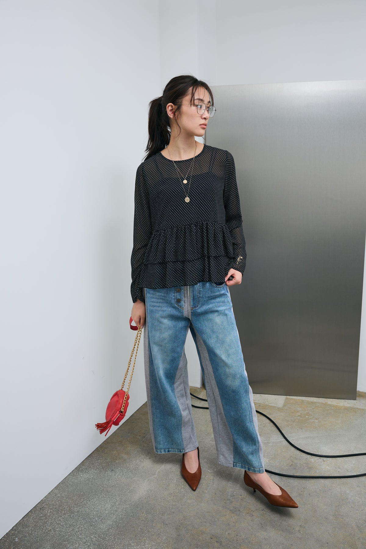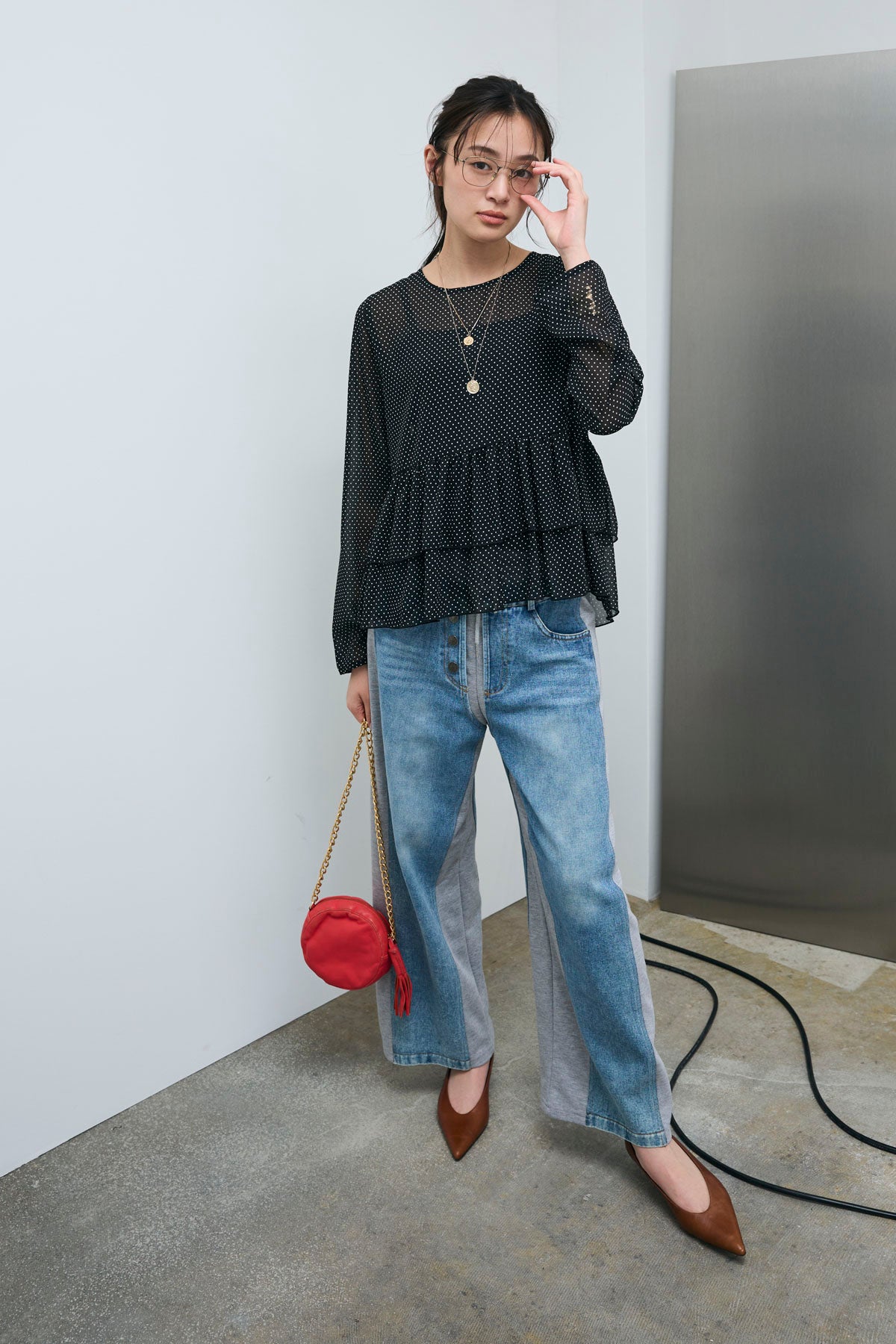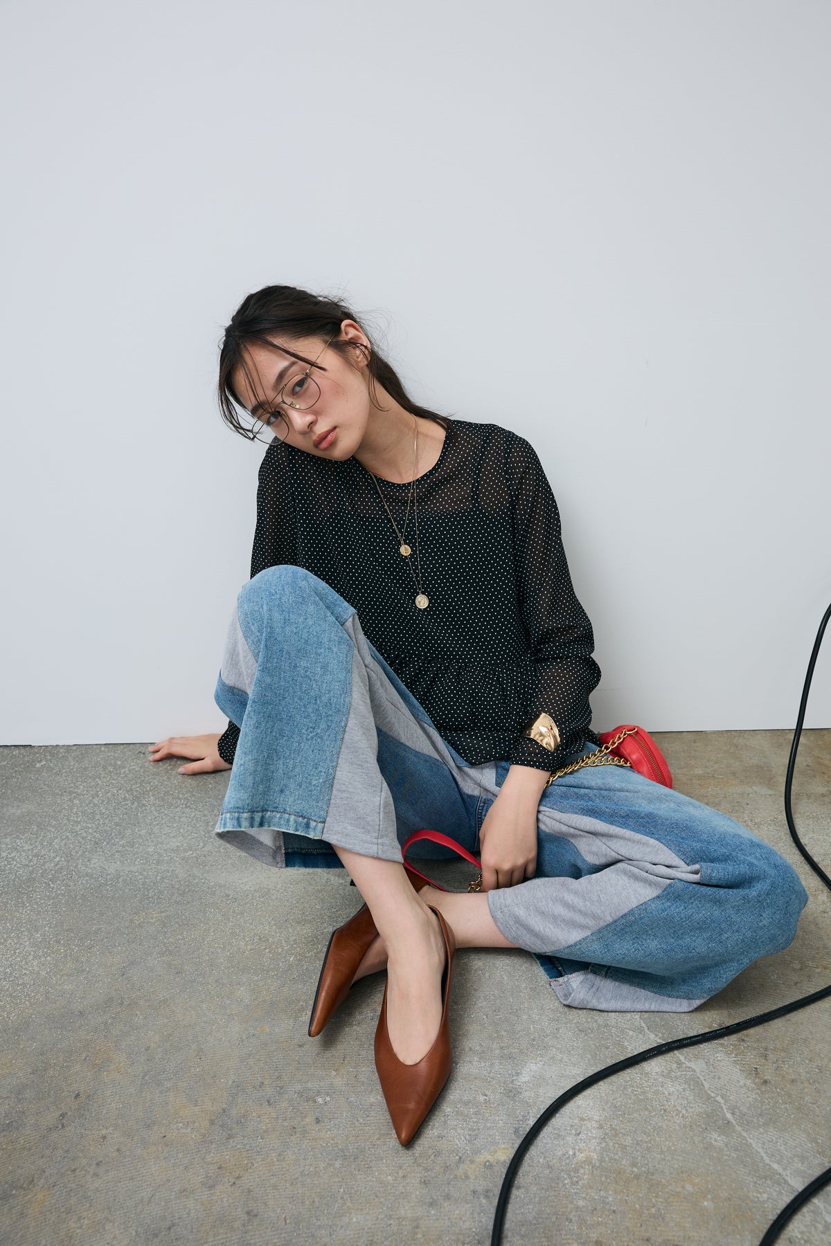 [予約/SET]シアードットブラウス+スウェット切り替えデニムパンツ(2set)