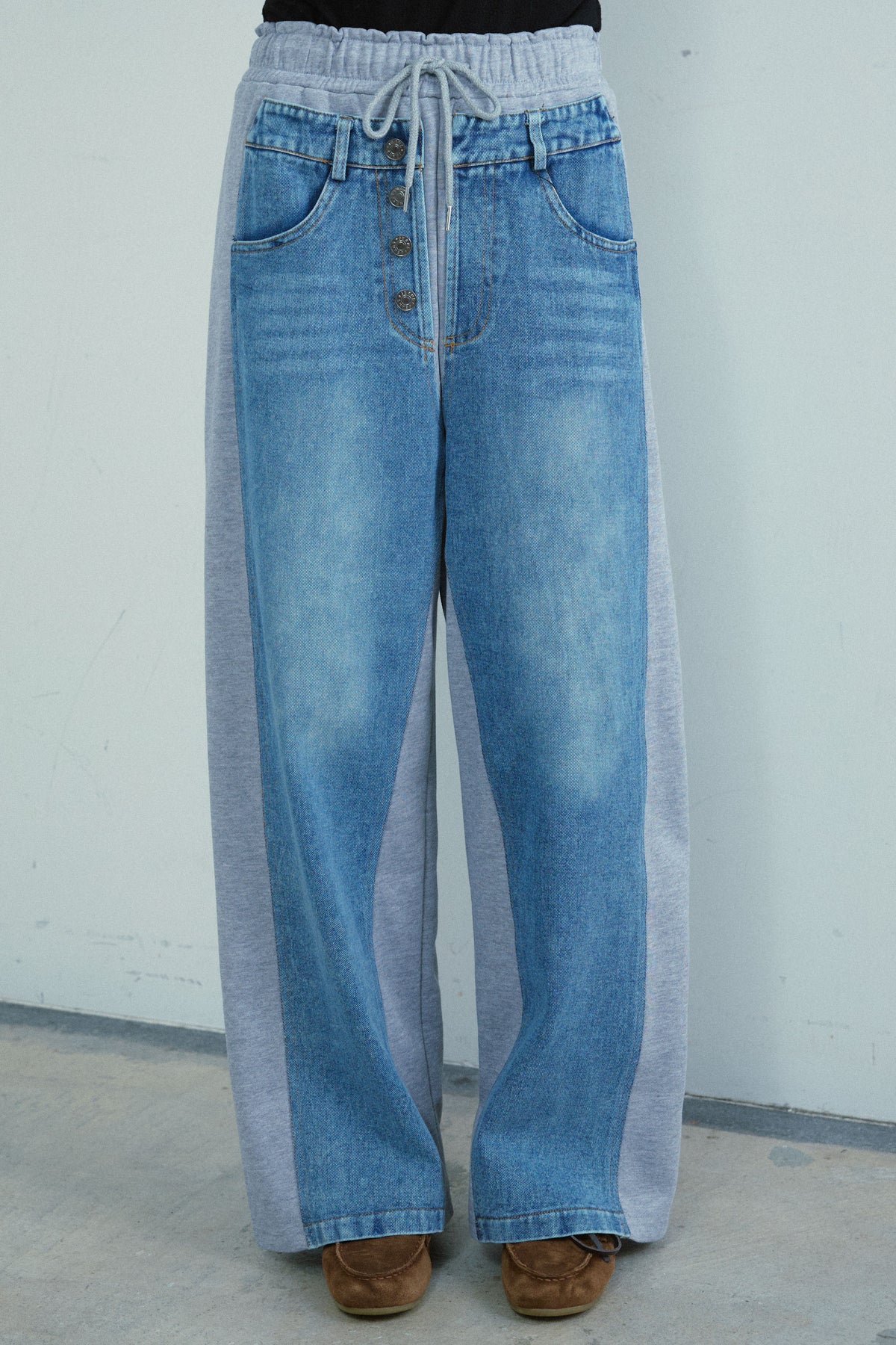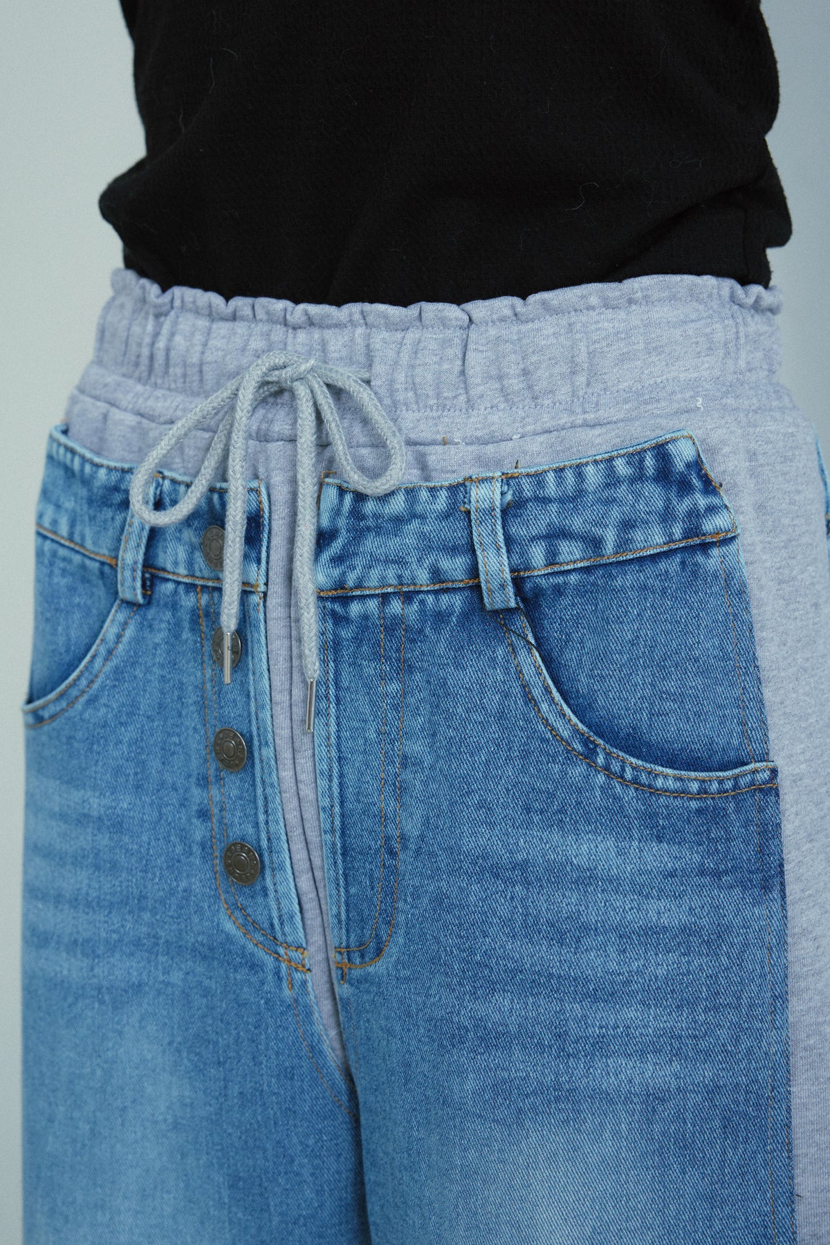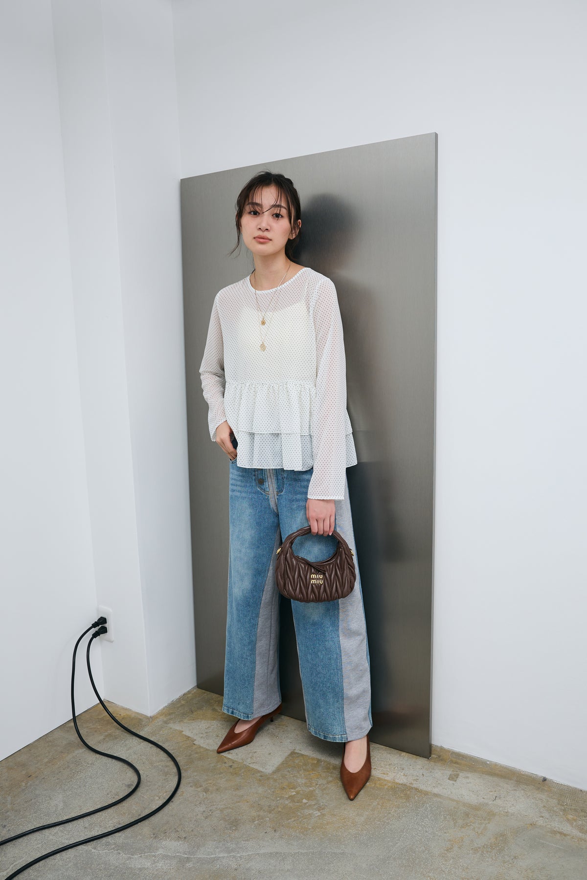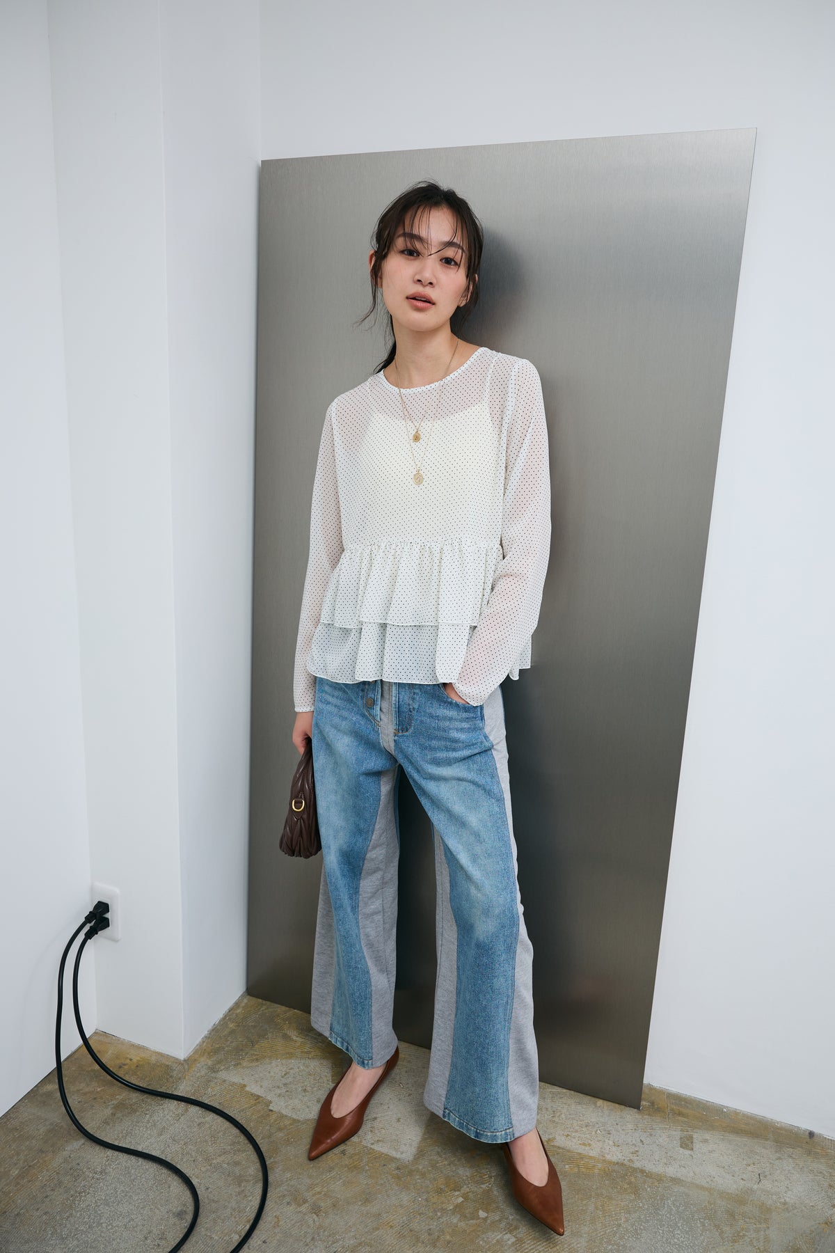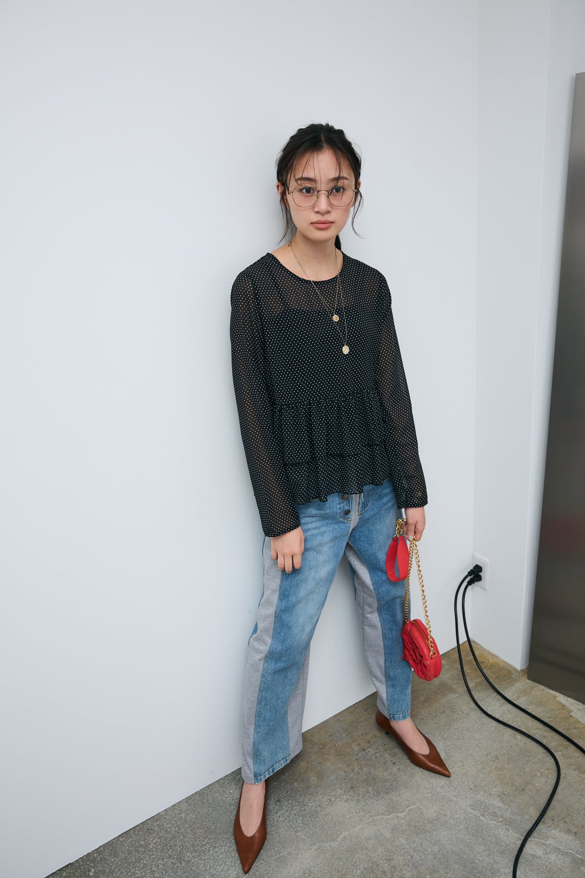 [予約/SET]シアードットブラウス+スウェット切り替えデニムパンツ(2set)
