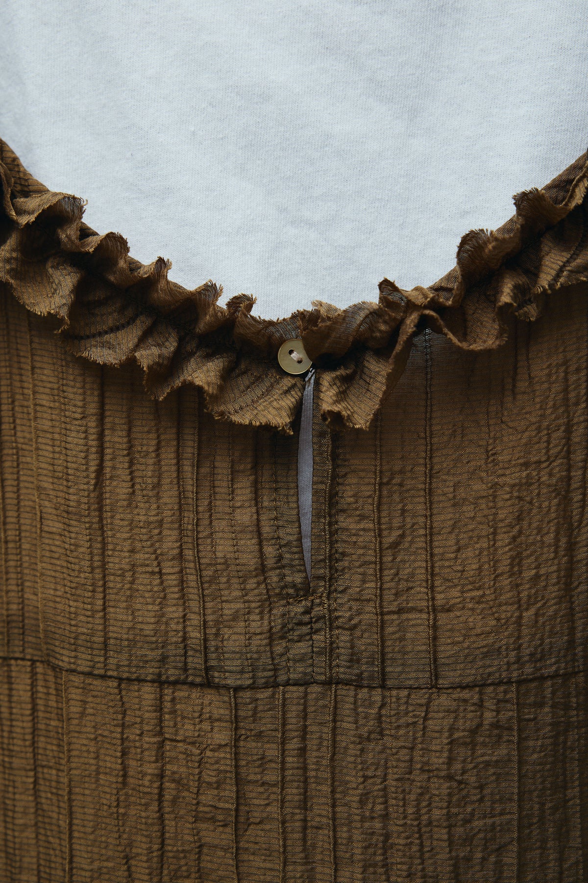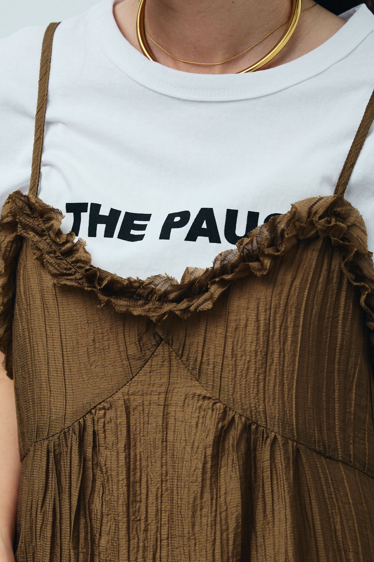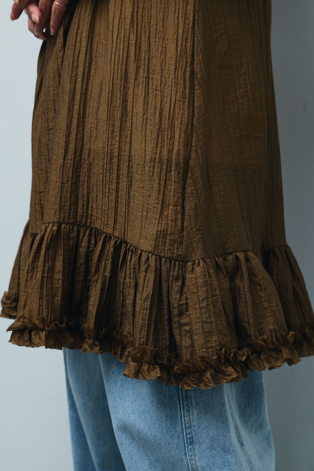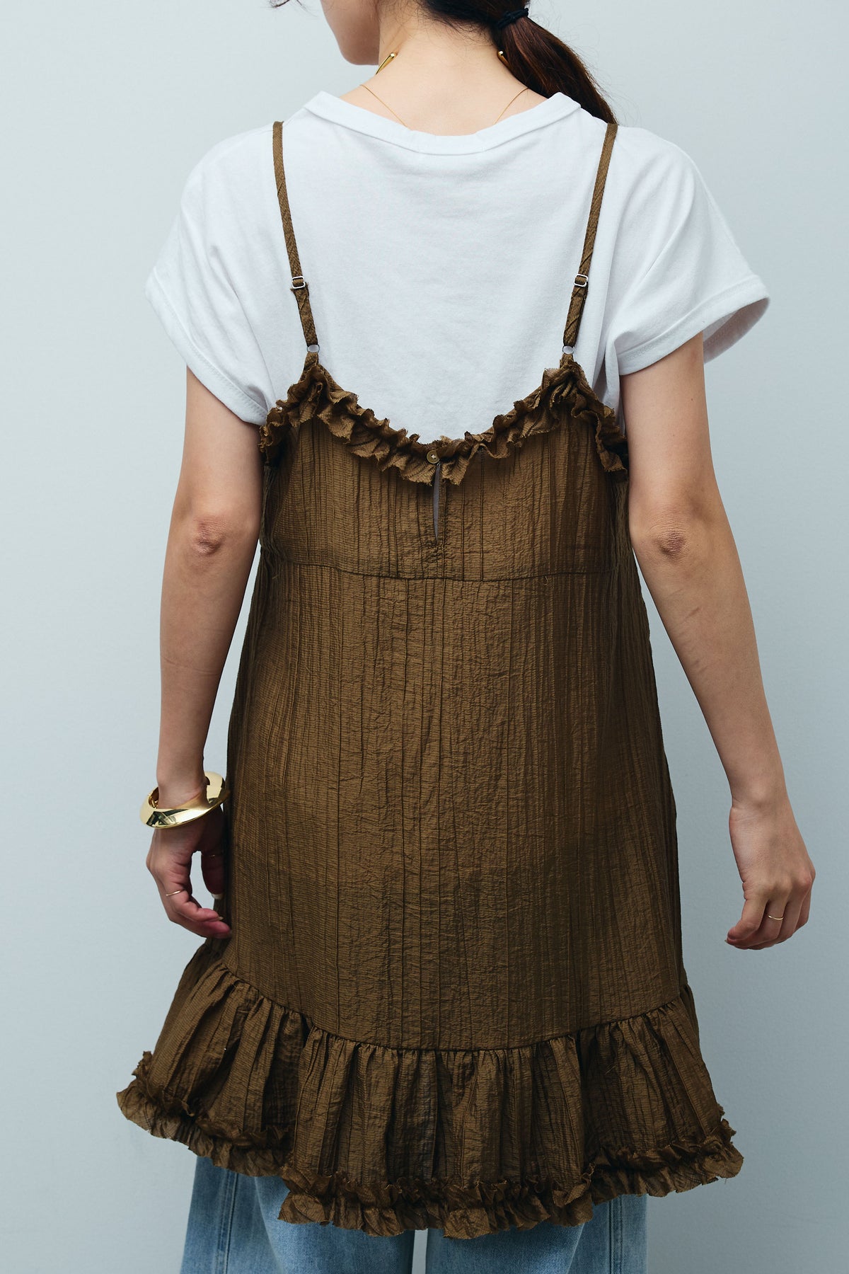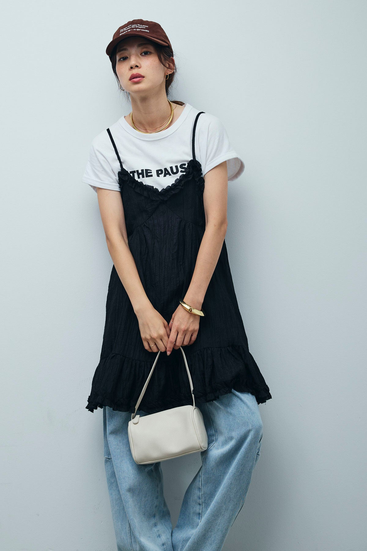しわ加工フリルキャミチュニックは、軽やかな素材とフリルディテールが特徴的なアイテムです。しわ加工された生地がカジュアルでリラックス感を与え、フリル部分が可愛らしさを引き立てています。キャミソールのデザインが夏らしく、ボトムスに合わせやすく、特に暑い季節にぴったりのアイテムです。