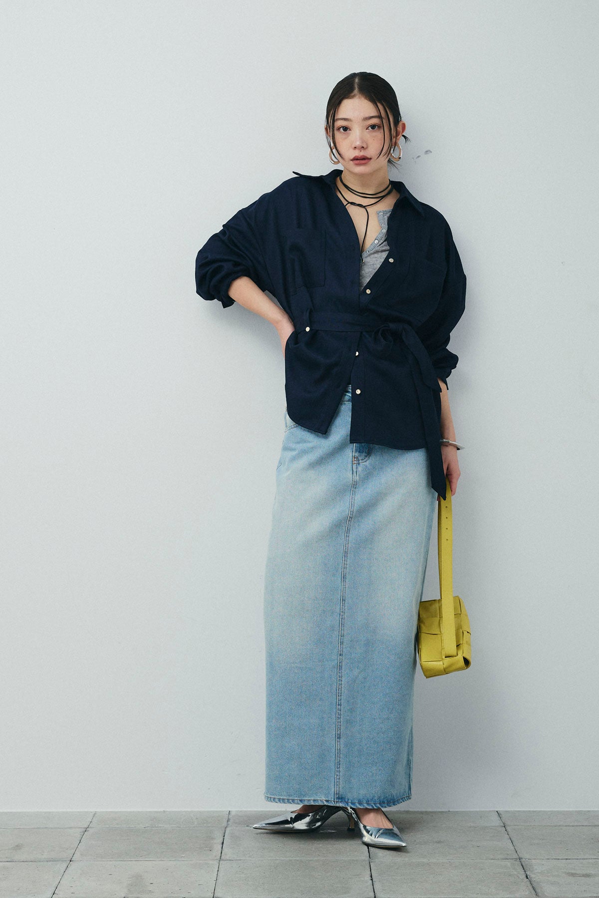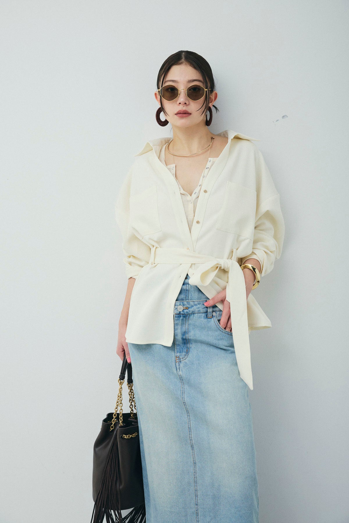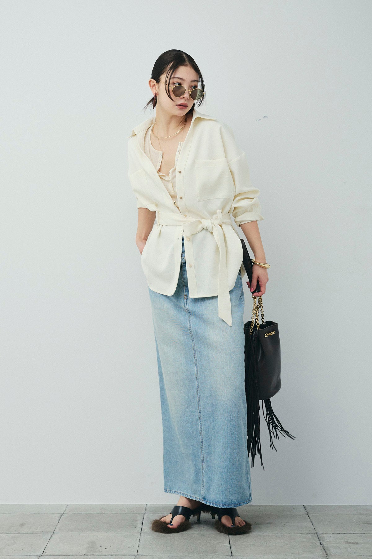 [予約/SET]ライトツイードベルト付シャツ+ダブルウエストデニムスカート(2set)