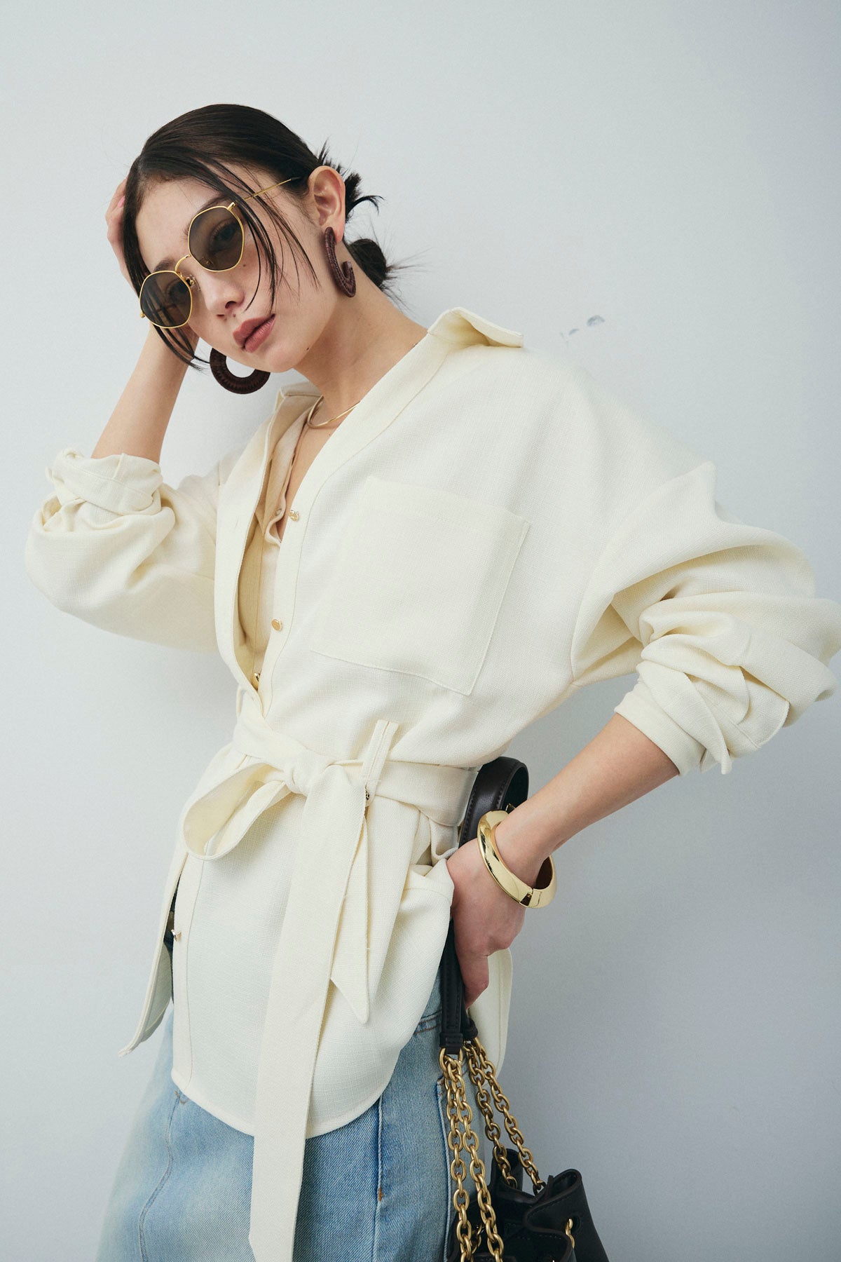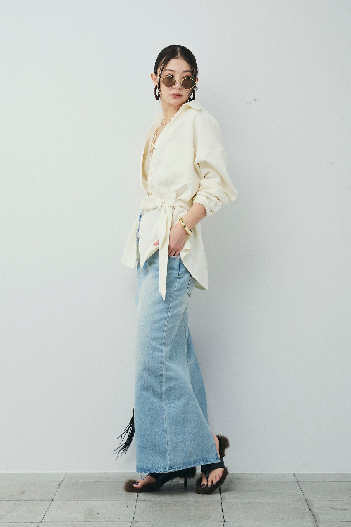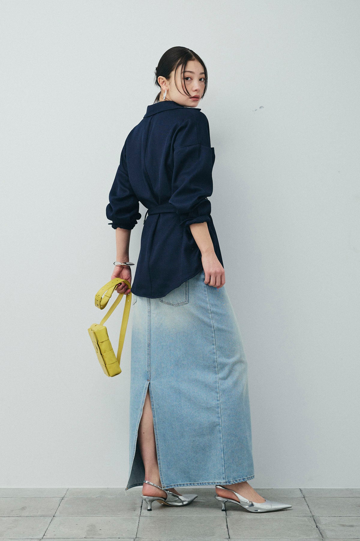 [予約/SET]ライトツイードベルト付シャツ+ダブルウエストデニムスカート(2set)