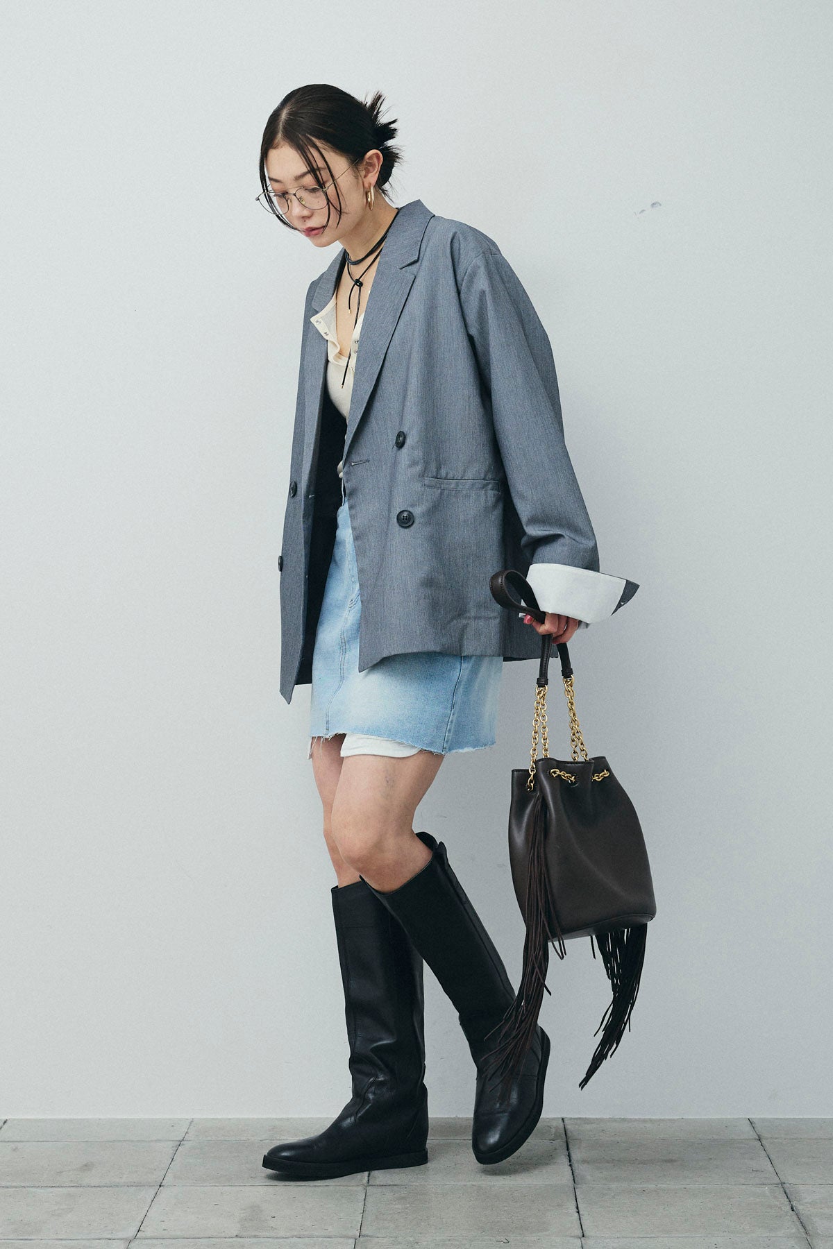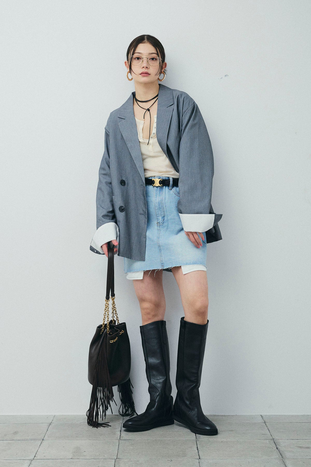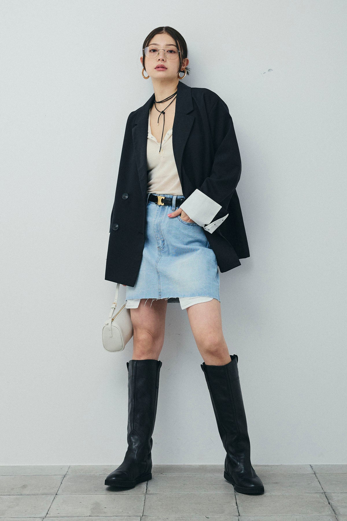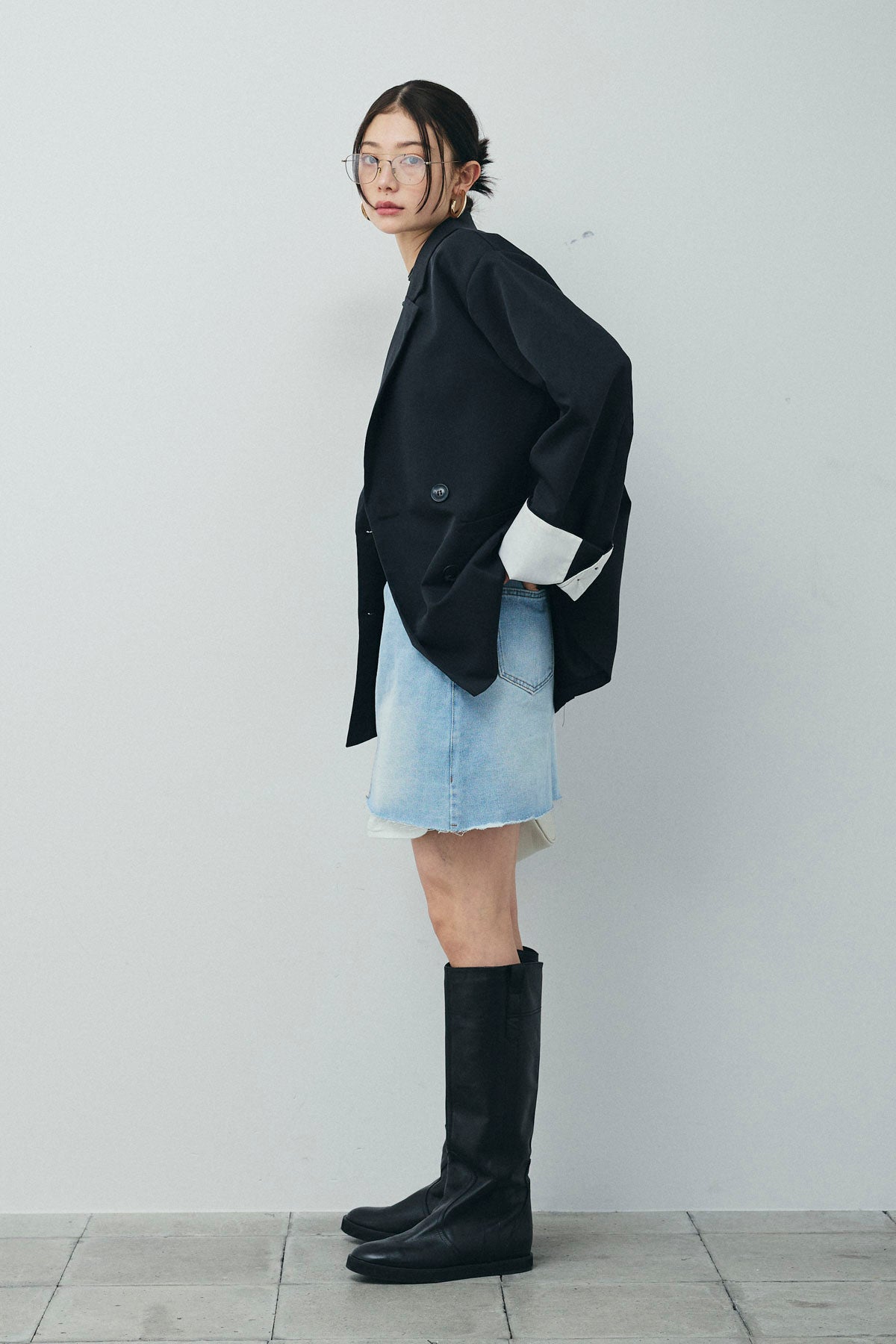 [予約/SET]TRツイル袖折り返しダブルジャケット+デニムミニスカート(2set)