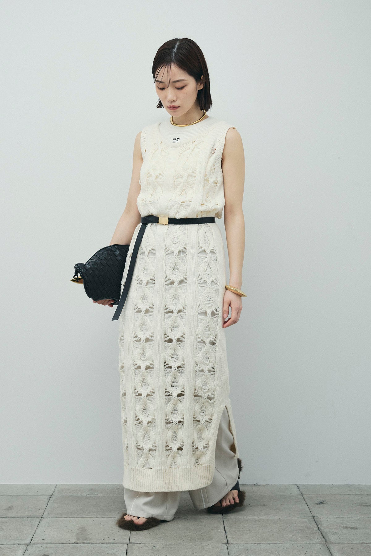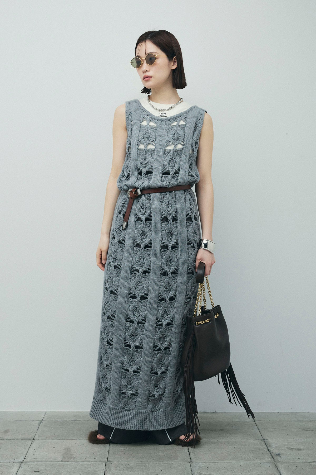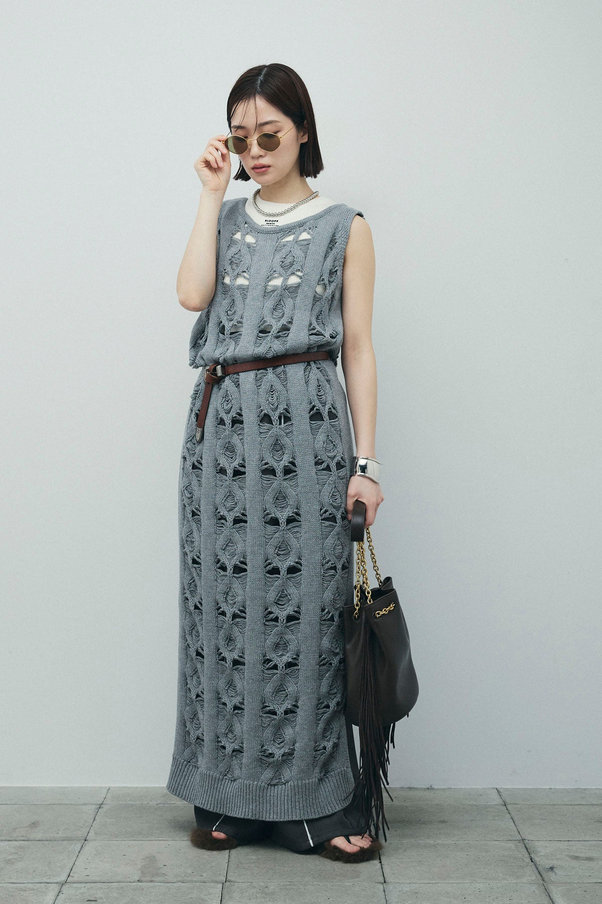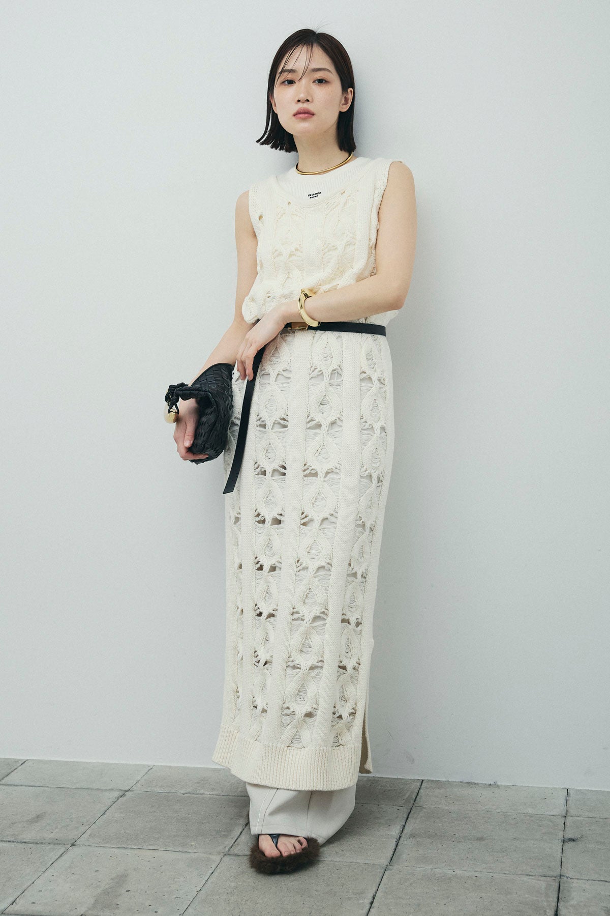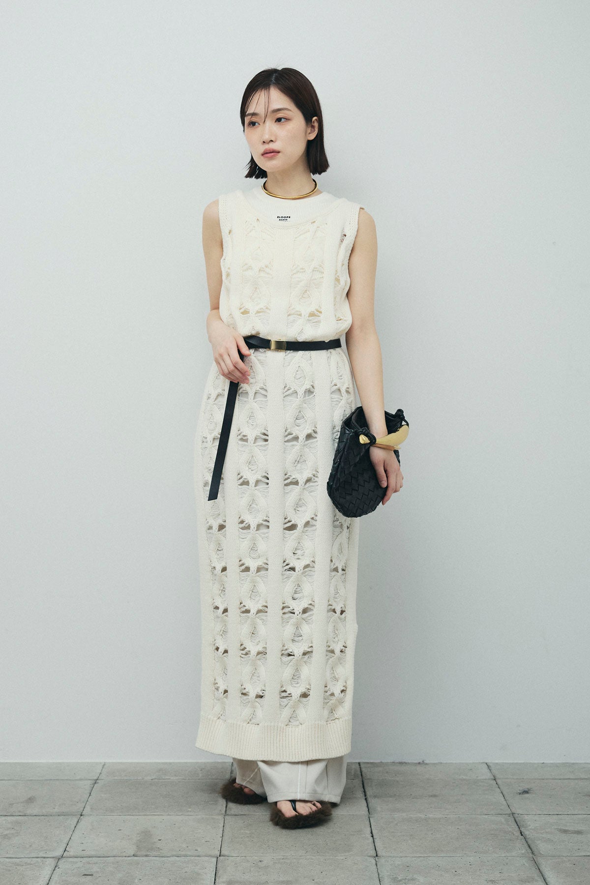 [予約/SET]ミックス編みニットワンピース+フロントロゴ入りリブタンクトップ+ヘザーエステルカーブパンツ(3set)