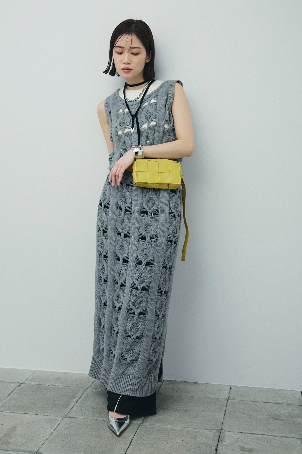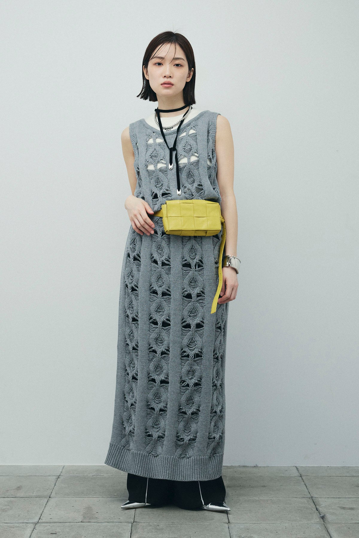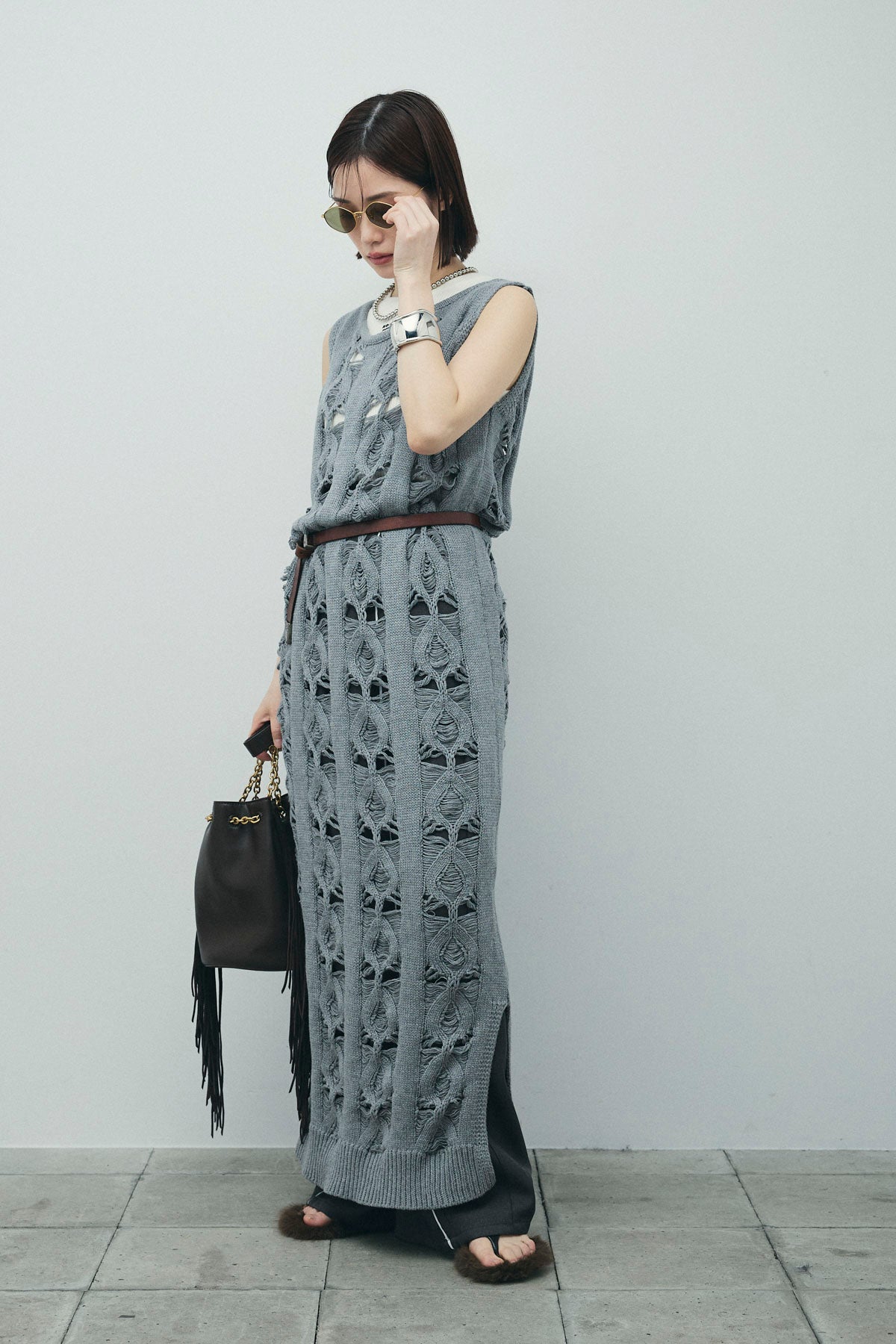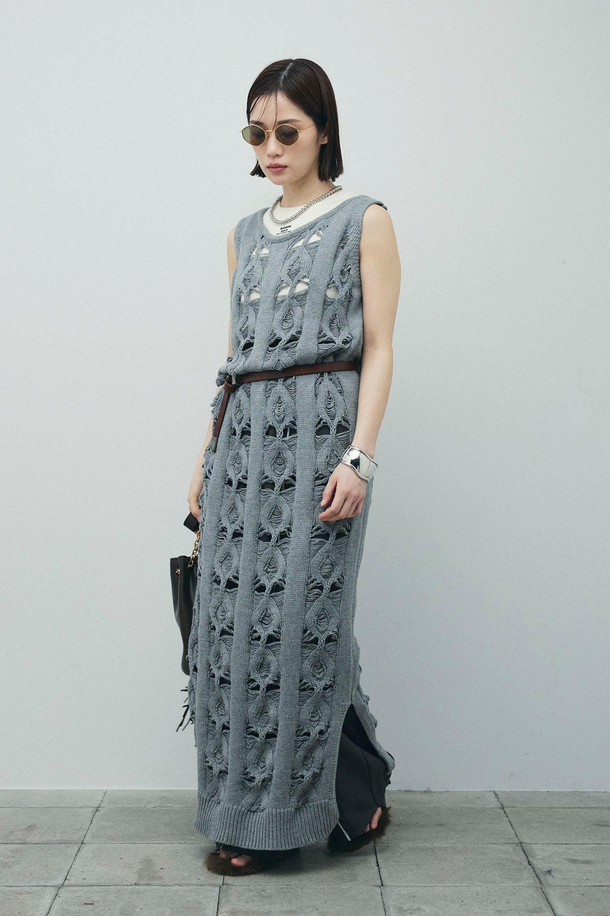 [予約/SET]ミックス編みニットワンピース+フロントロゴ入りリブタンクトップ+ヘザーエステルカーブパンツ(3set)