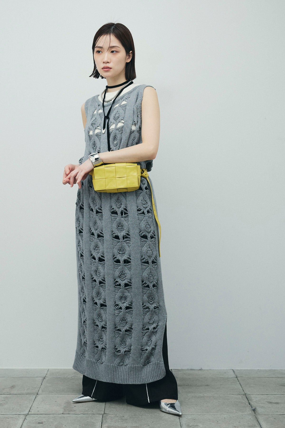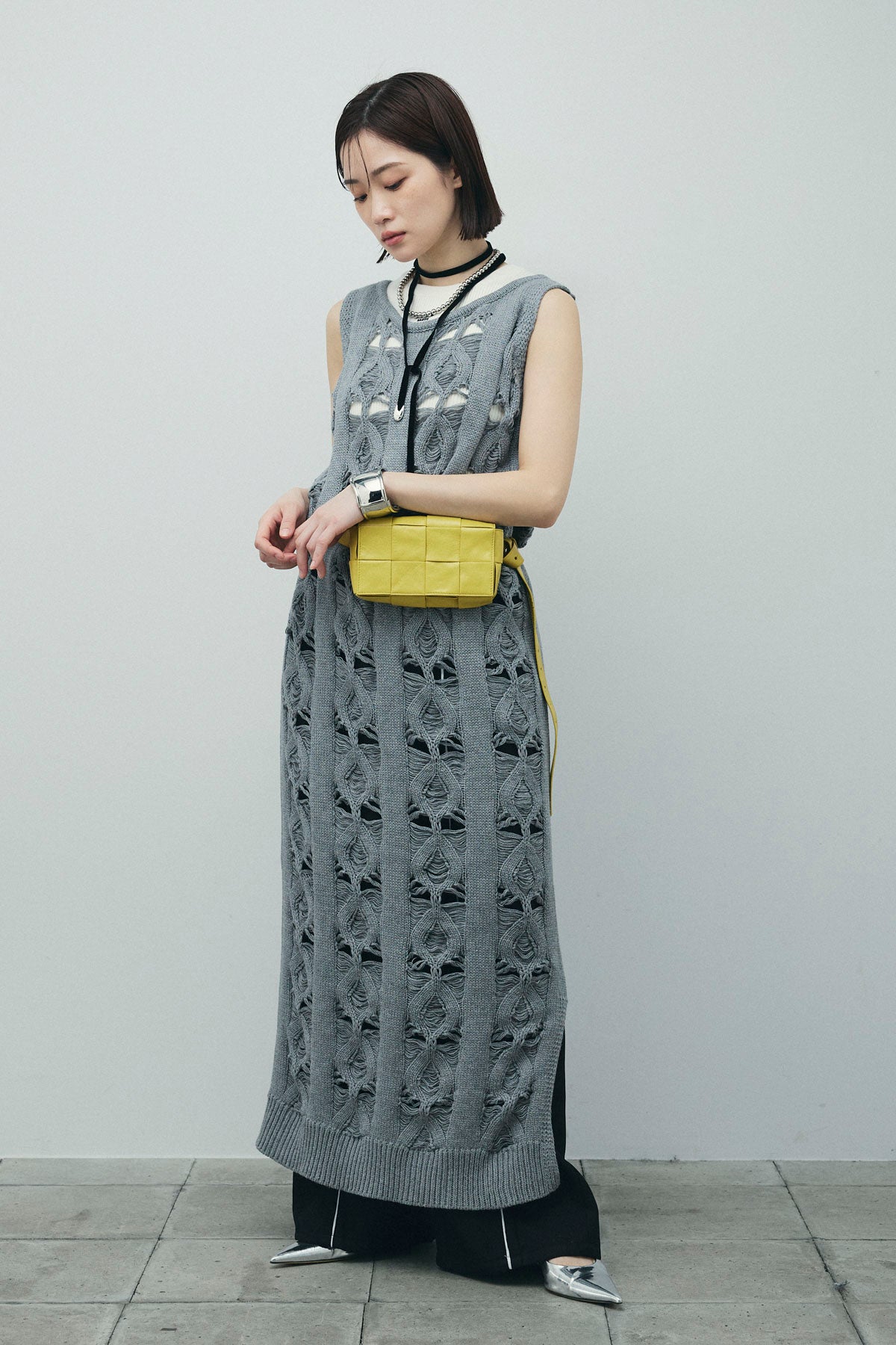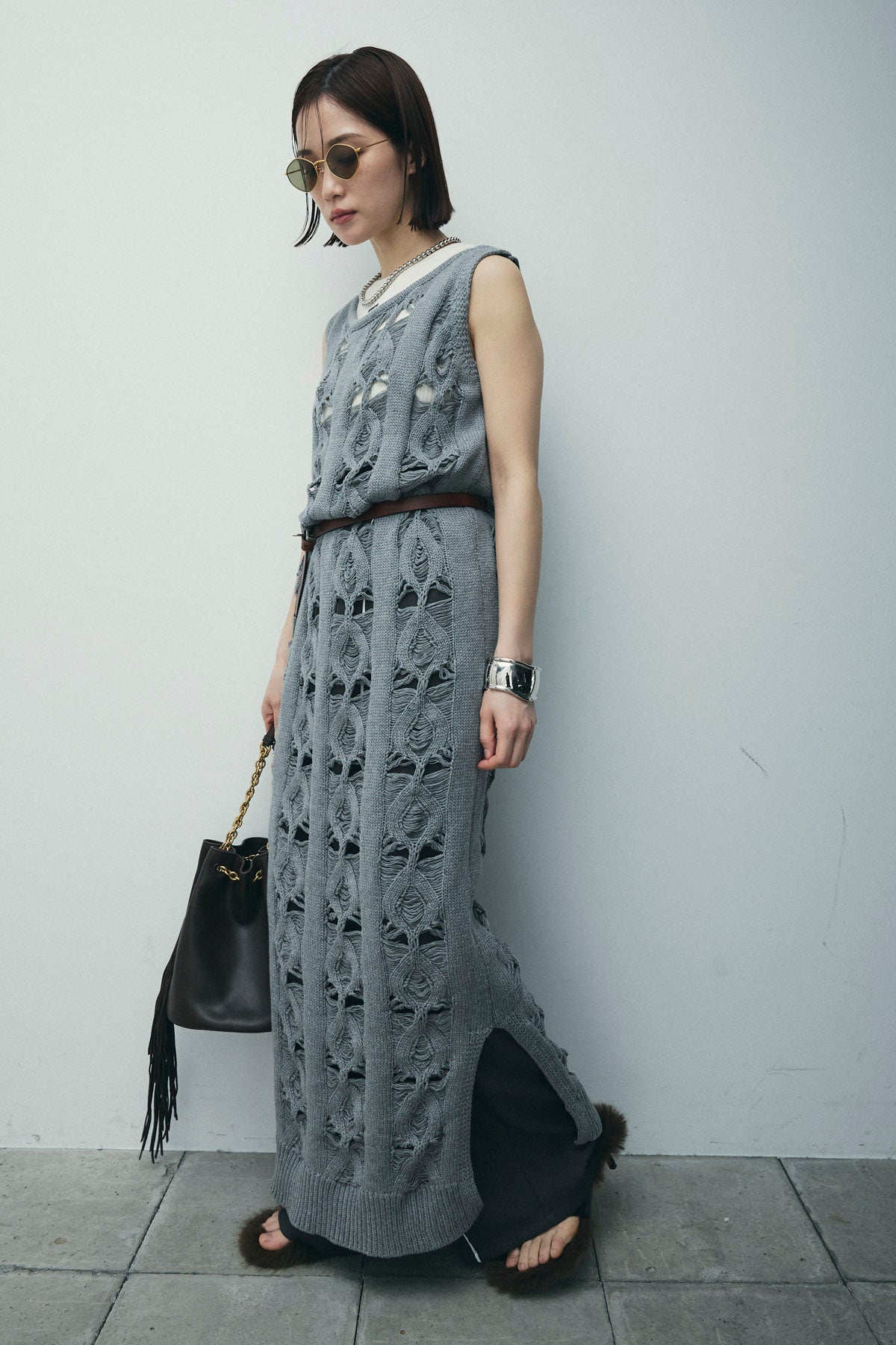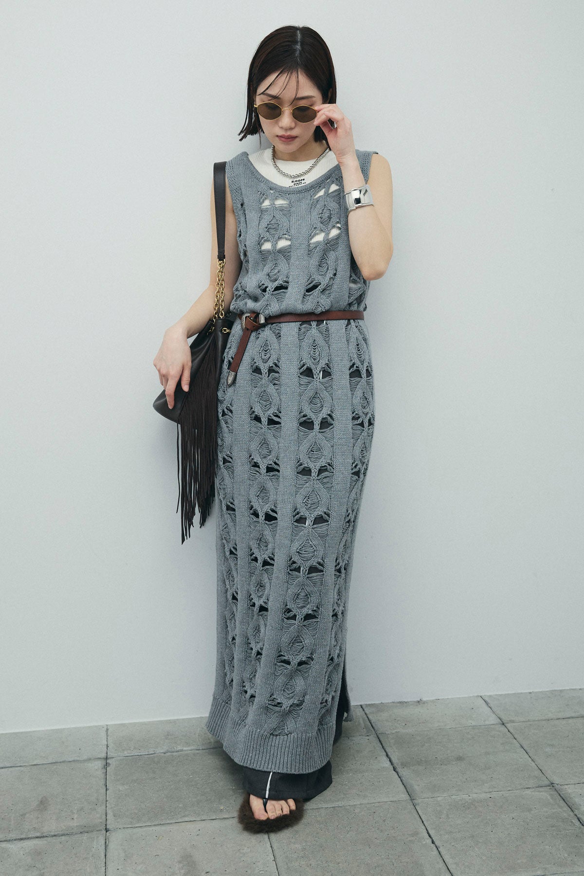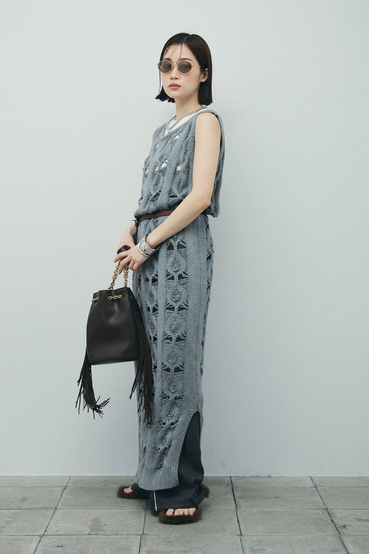 [予約/SET]ミックス編みニットワンピース+フロントロゴ入りリブタンクトップ+ヘザーエステルカーブパンツ(3set)