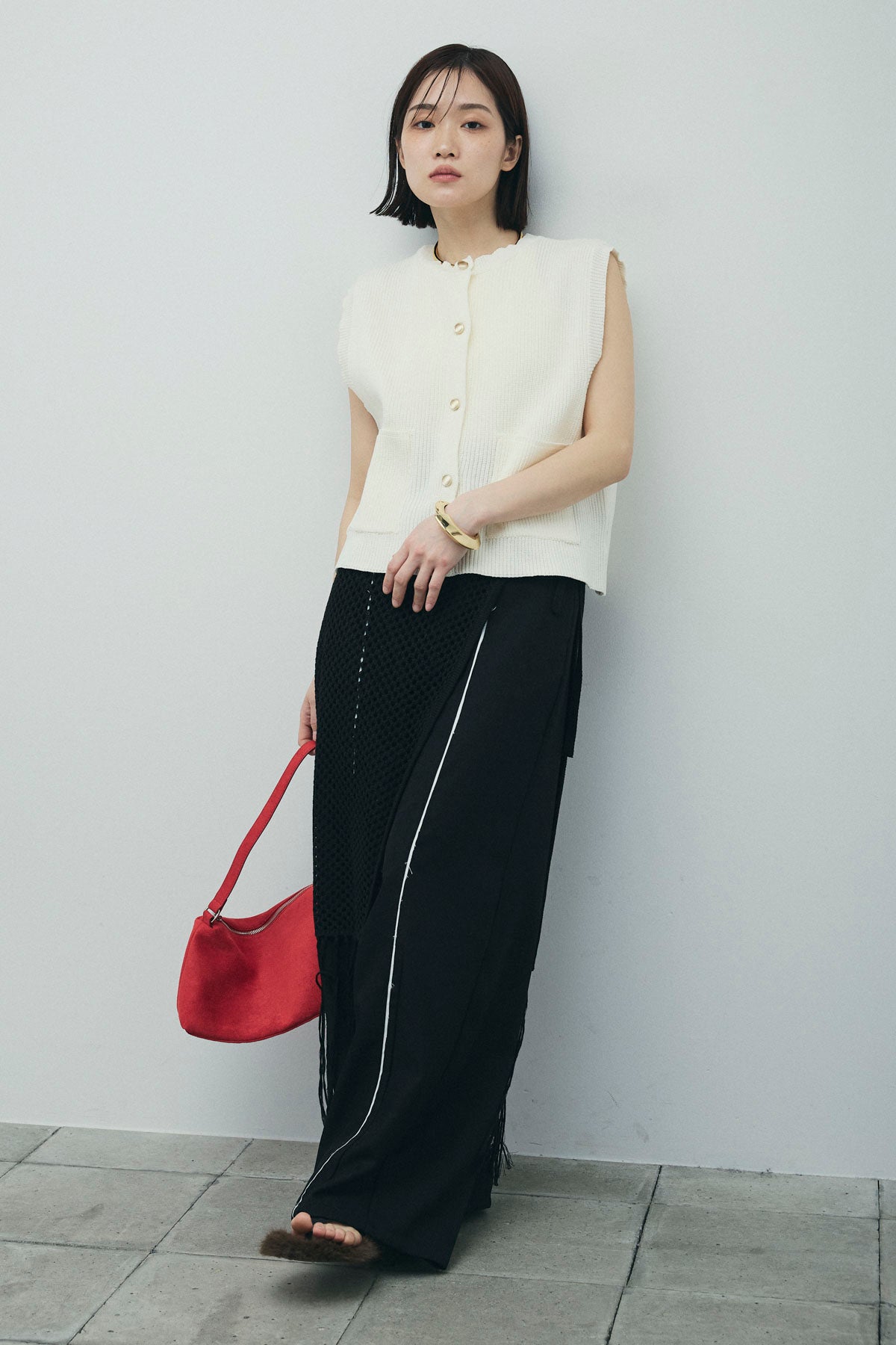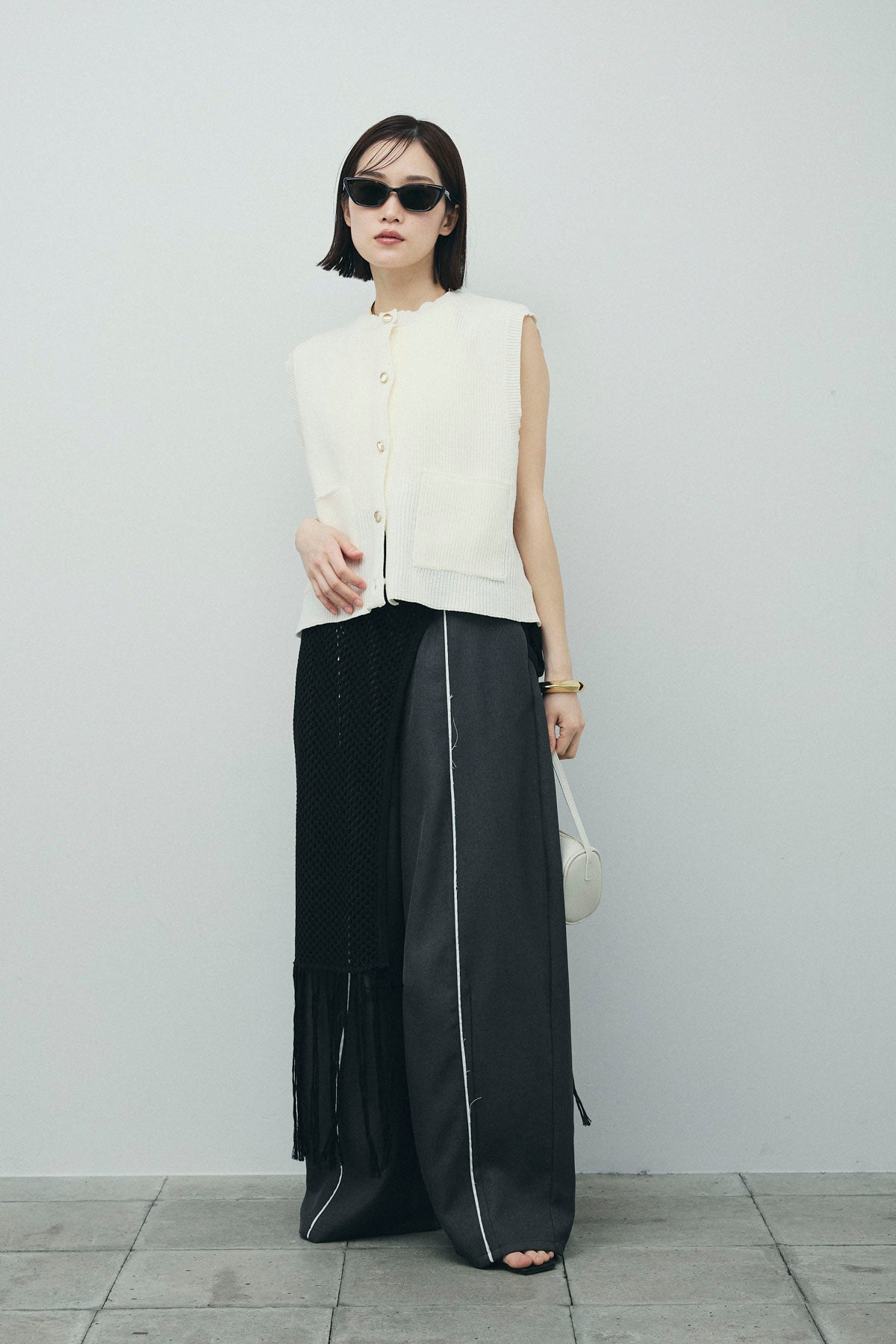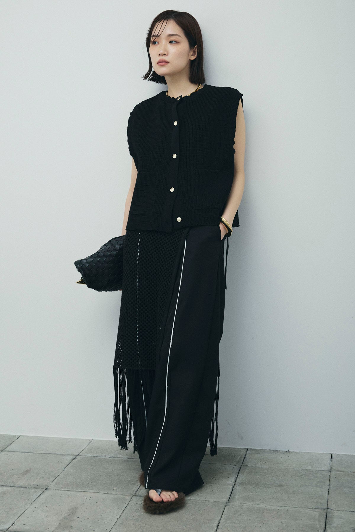 [予約/SET]畦編み金釦ルーズベスト+ヘザーエステルカーブパンツ+メッシュラップスカート(3set)