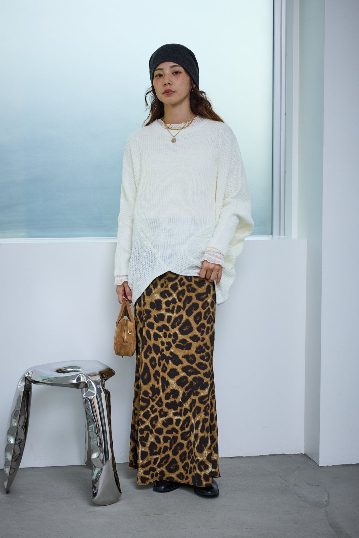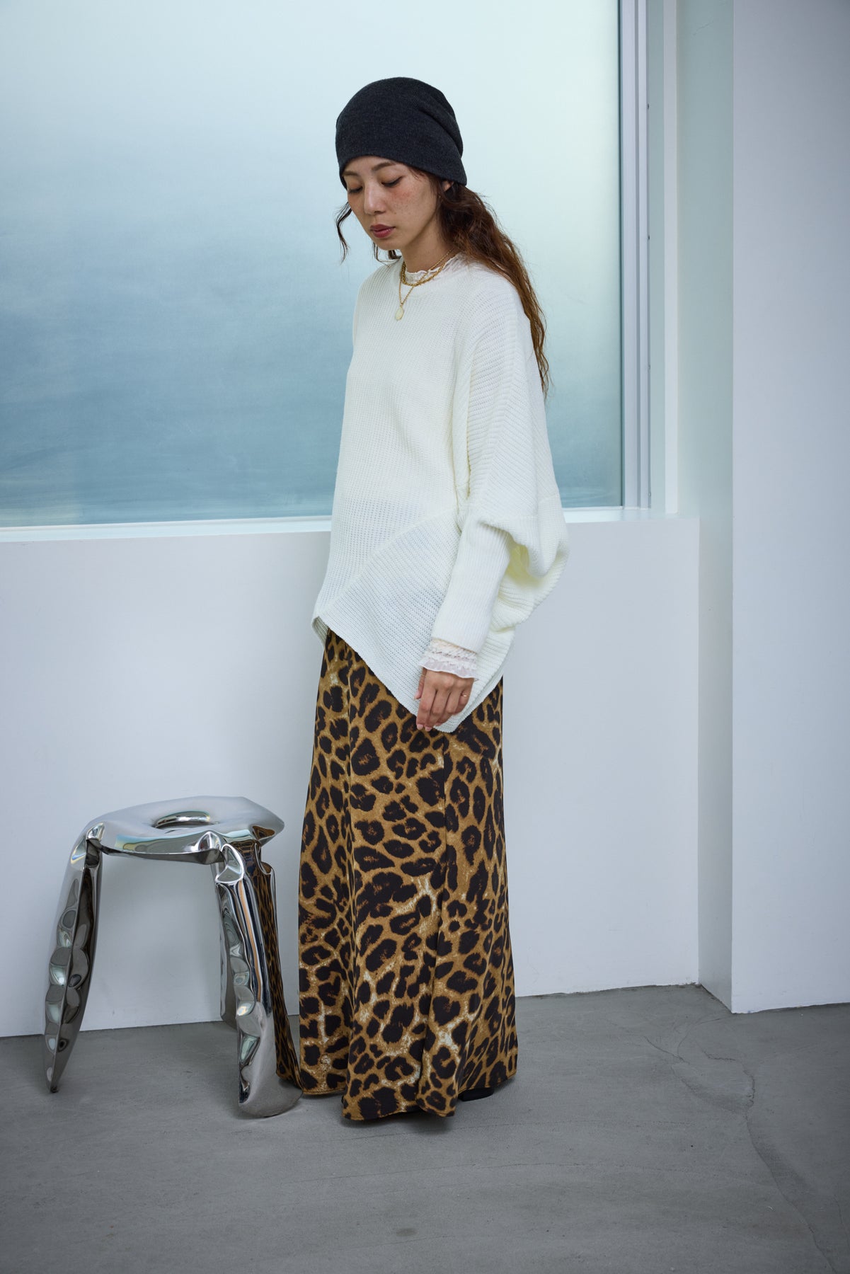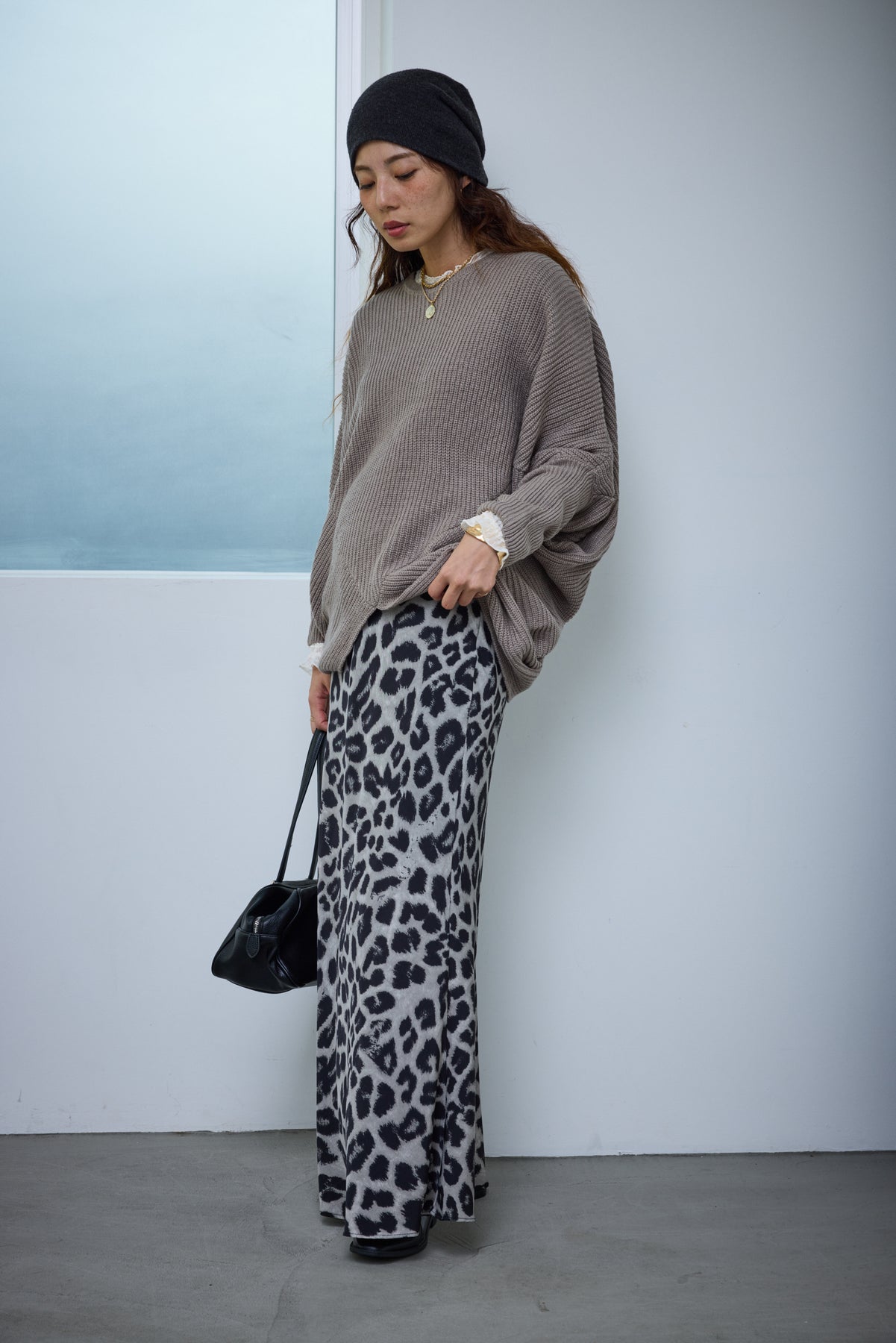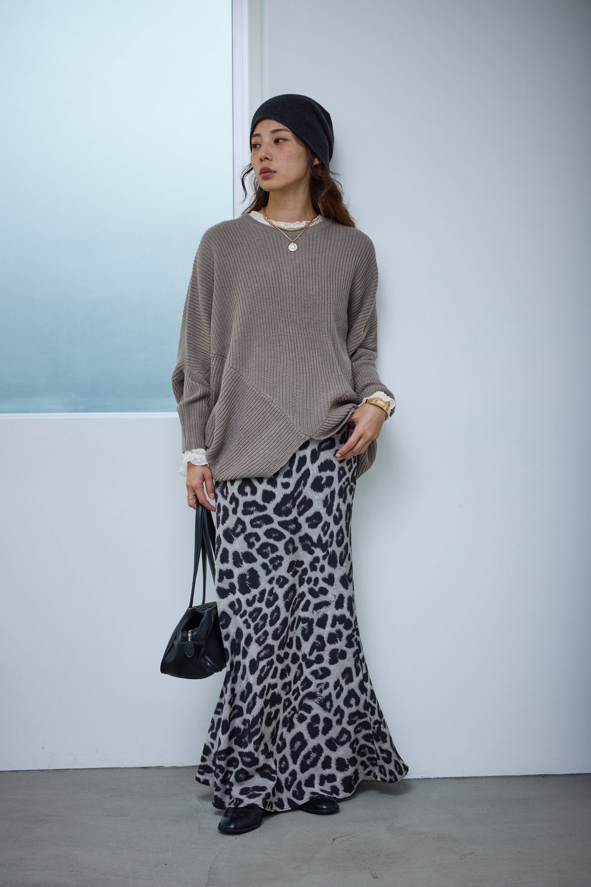 [予約/SET]ルーズドレープドルマンニットプルオーバー+レオパードナロースカート(2set)