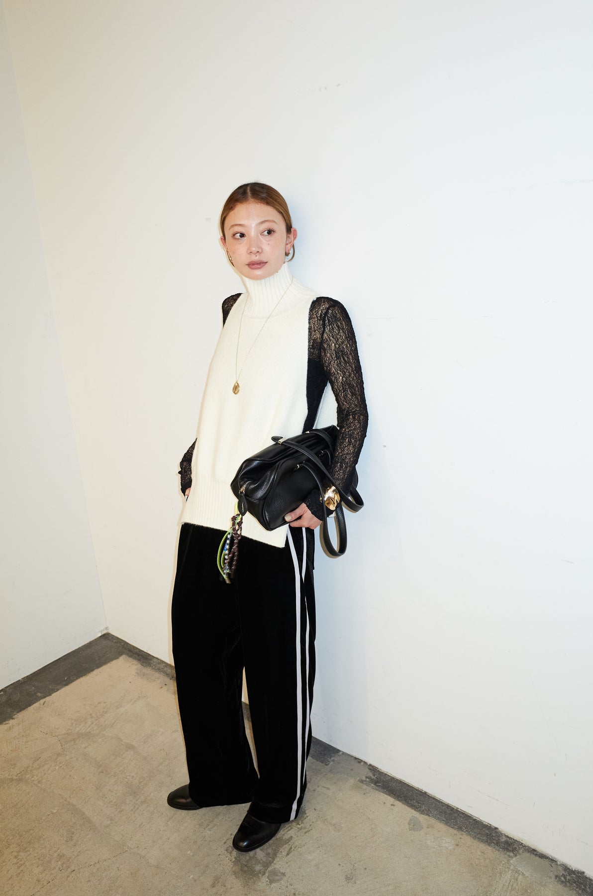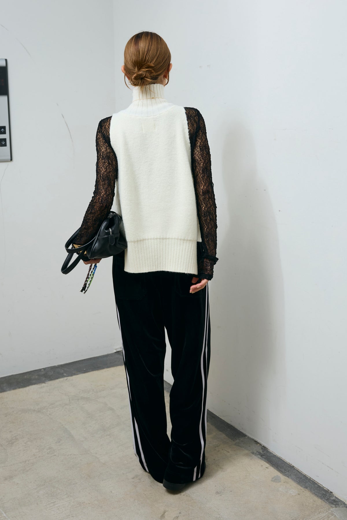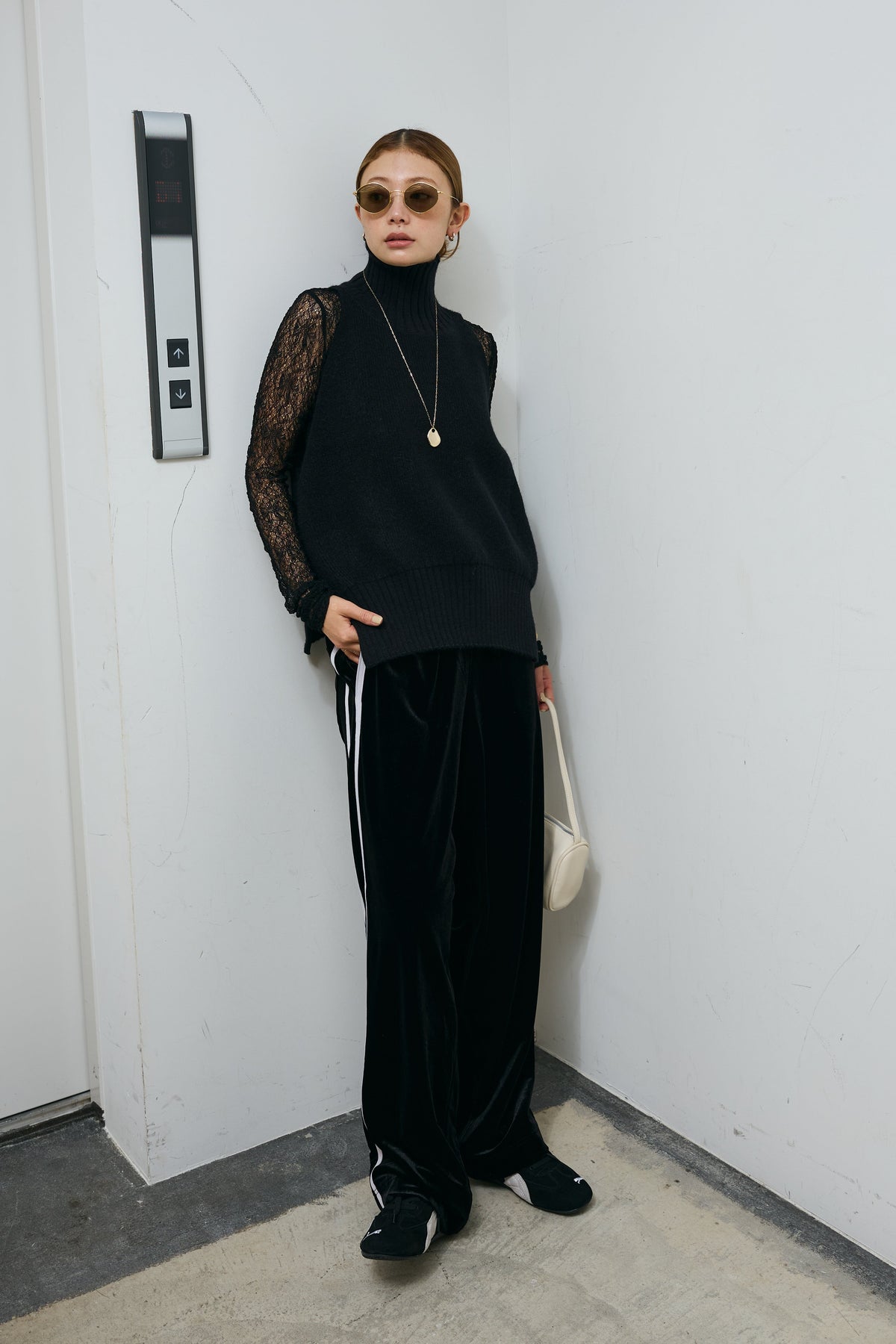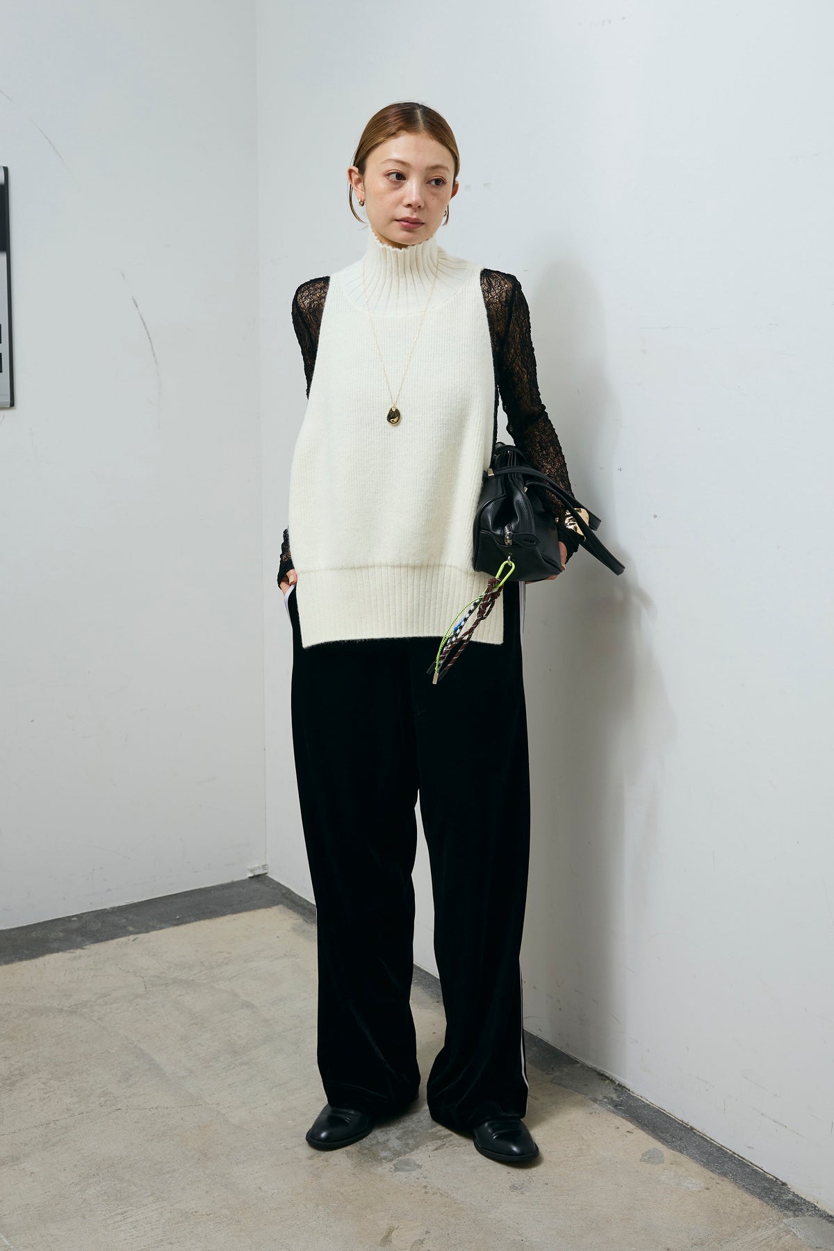 [予約/SET]ハイネックワイドーオープンニットベスト+シアーレーストップス+サイドラインベロアパンツ(3set)